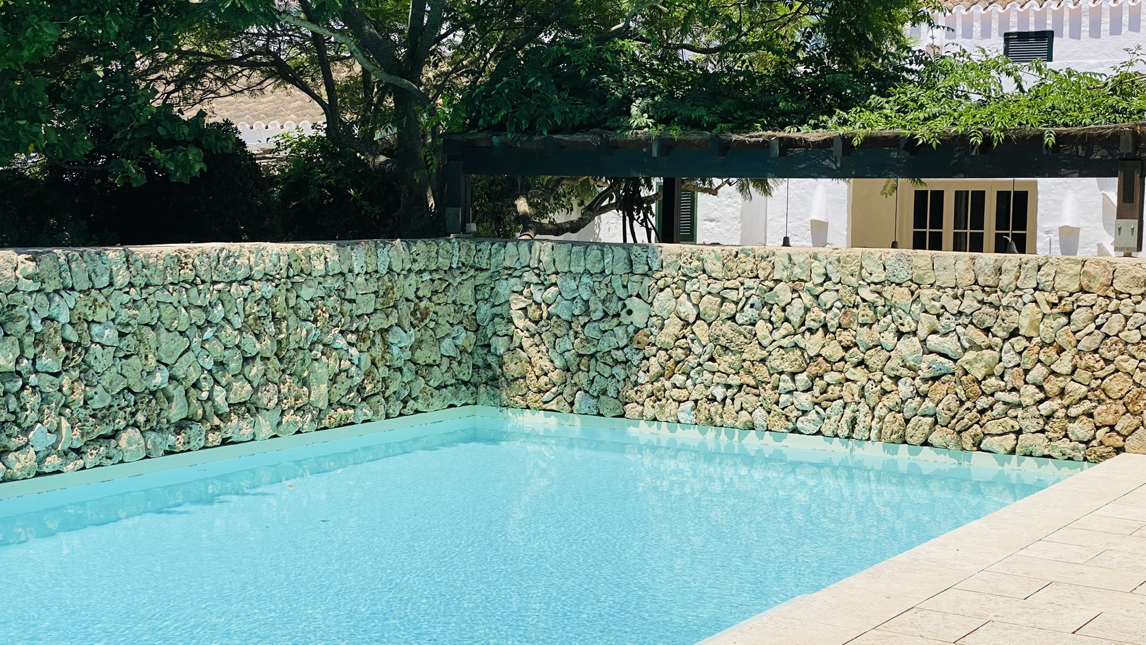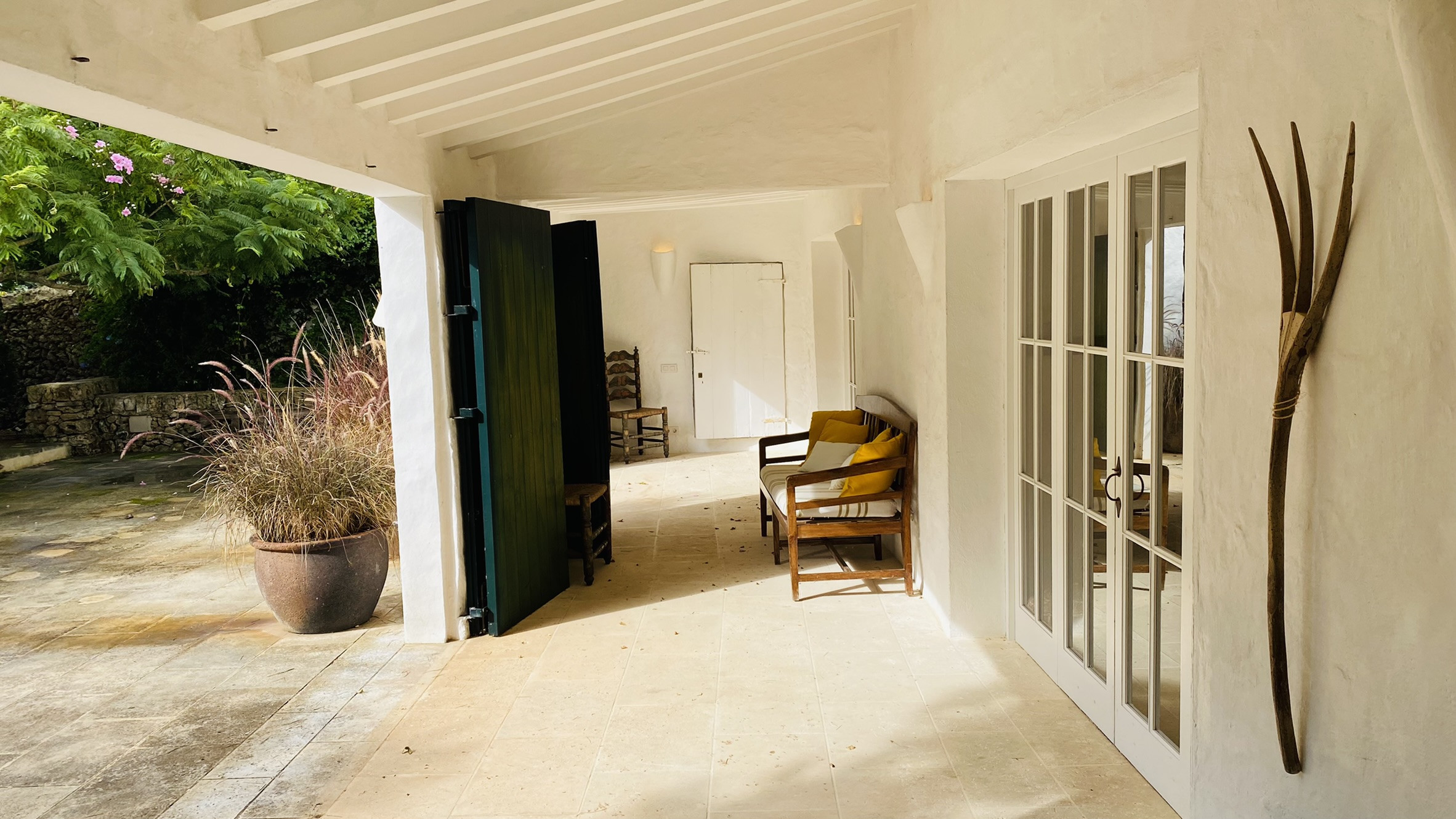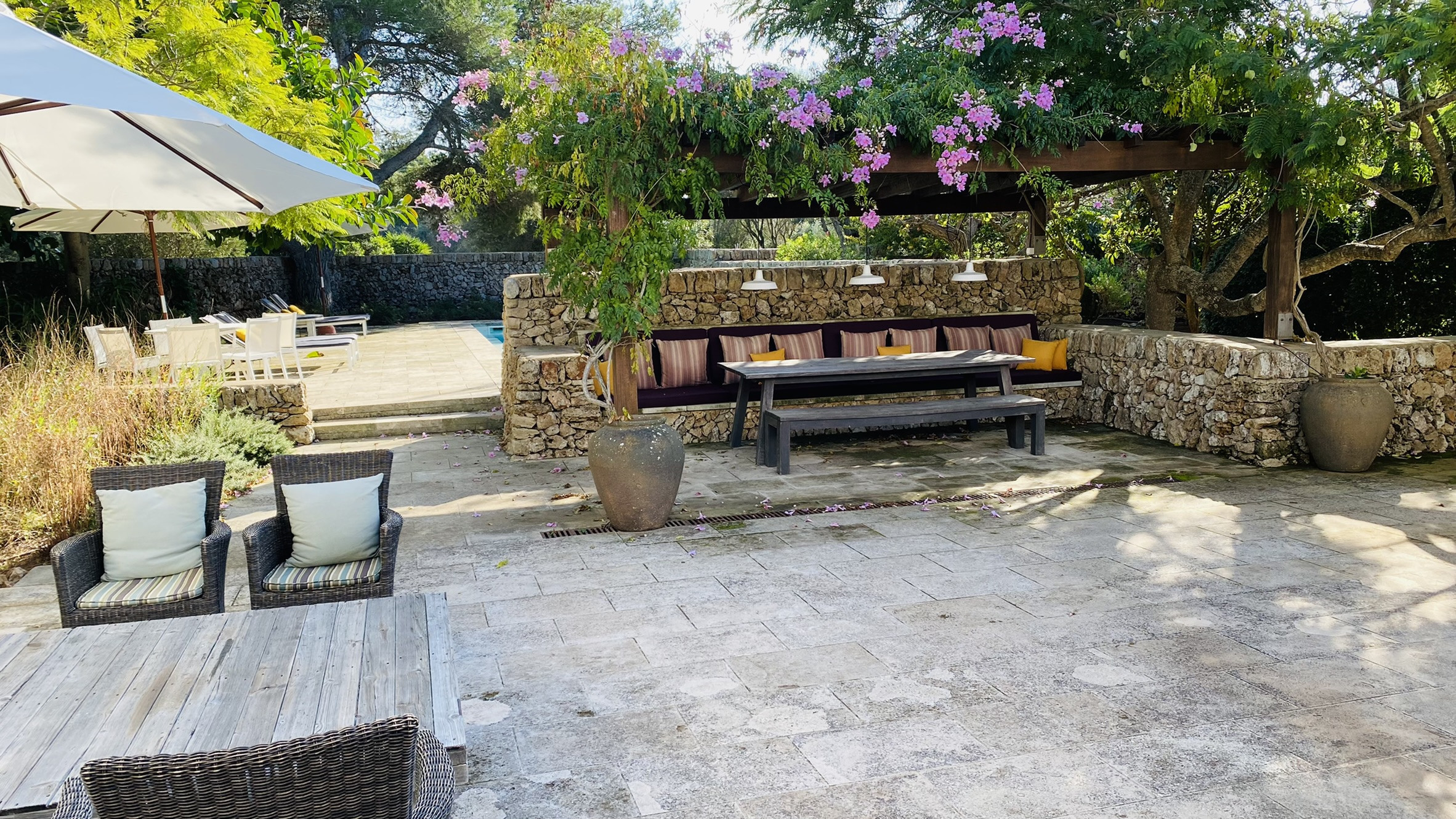 Die Immobilie verfügt über zwei Terrassen, eine neben dem Pool und die andere vor dem Haus. Der Pool im Design hat römische Treppen an der Seite und ist auf der anderen Seite von einer Trockenmauer umgeben. Die Terrasse vor dem Haus hat eine Pergola mit einem Tisch und zwei gemauerten Bänken zum Essen im Freien. Die Eingangshalle des Hauses kann durch Öffnen der großen Glastüren in eine überdachte Veranda verwandelt werden.
