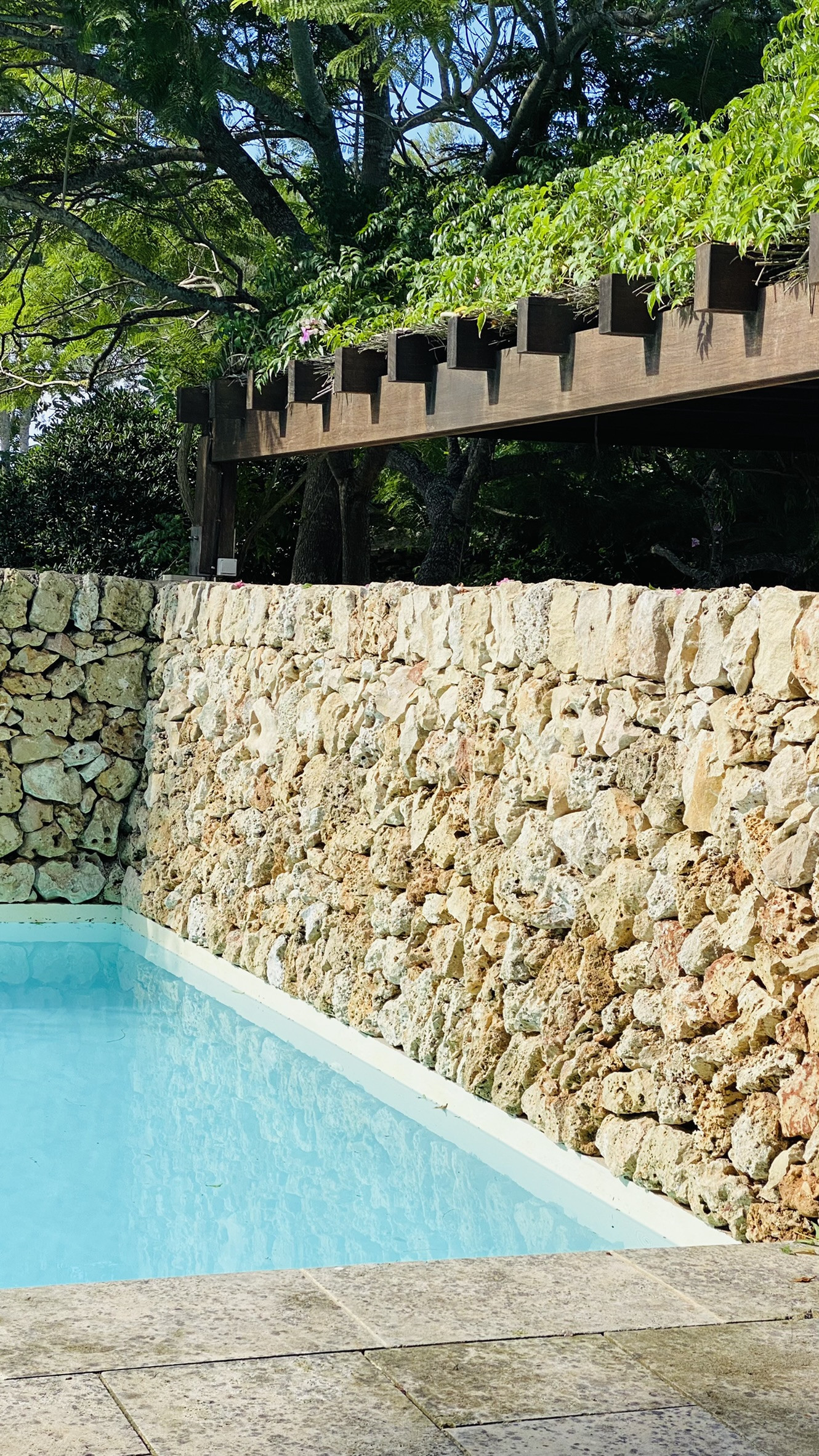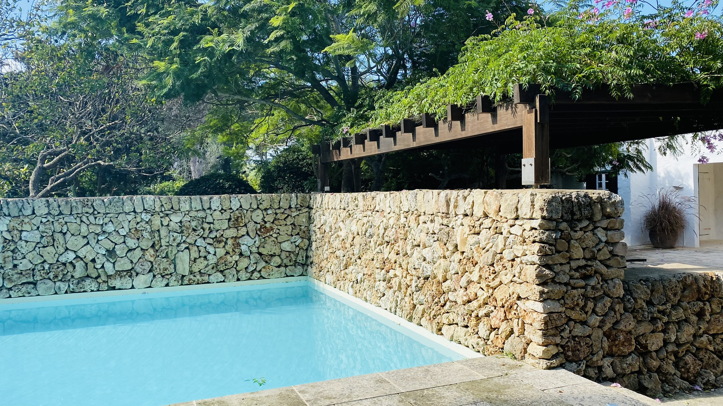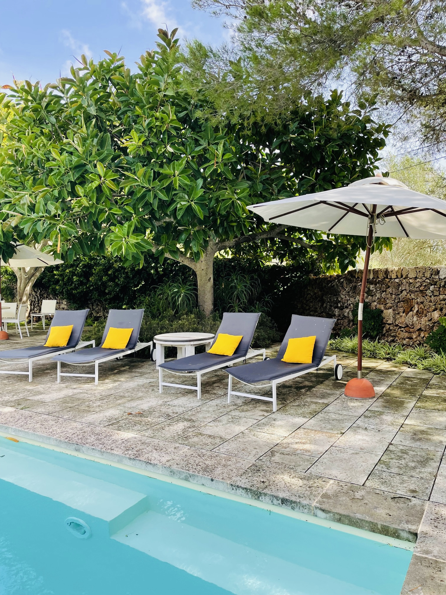 Die Immobilie verfügt über zwei Terrassen, eine neben dem Pool und die andere vor dem Haus. Der Pool im Design hat römische Treppen an der Seite und ist auf der anderen Seite von einer Trockenmauer umgeben. Die Terrasse vor dem Haus hat eine Pergola mit einem Tisch und zwei gemauerten Bänken zum Essen im Freien. Die Eingangshalle des Hauses kann durch Öffnen der großen Glastüren in eine überdachte Veranda verwandelt werden.