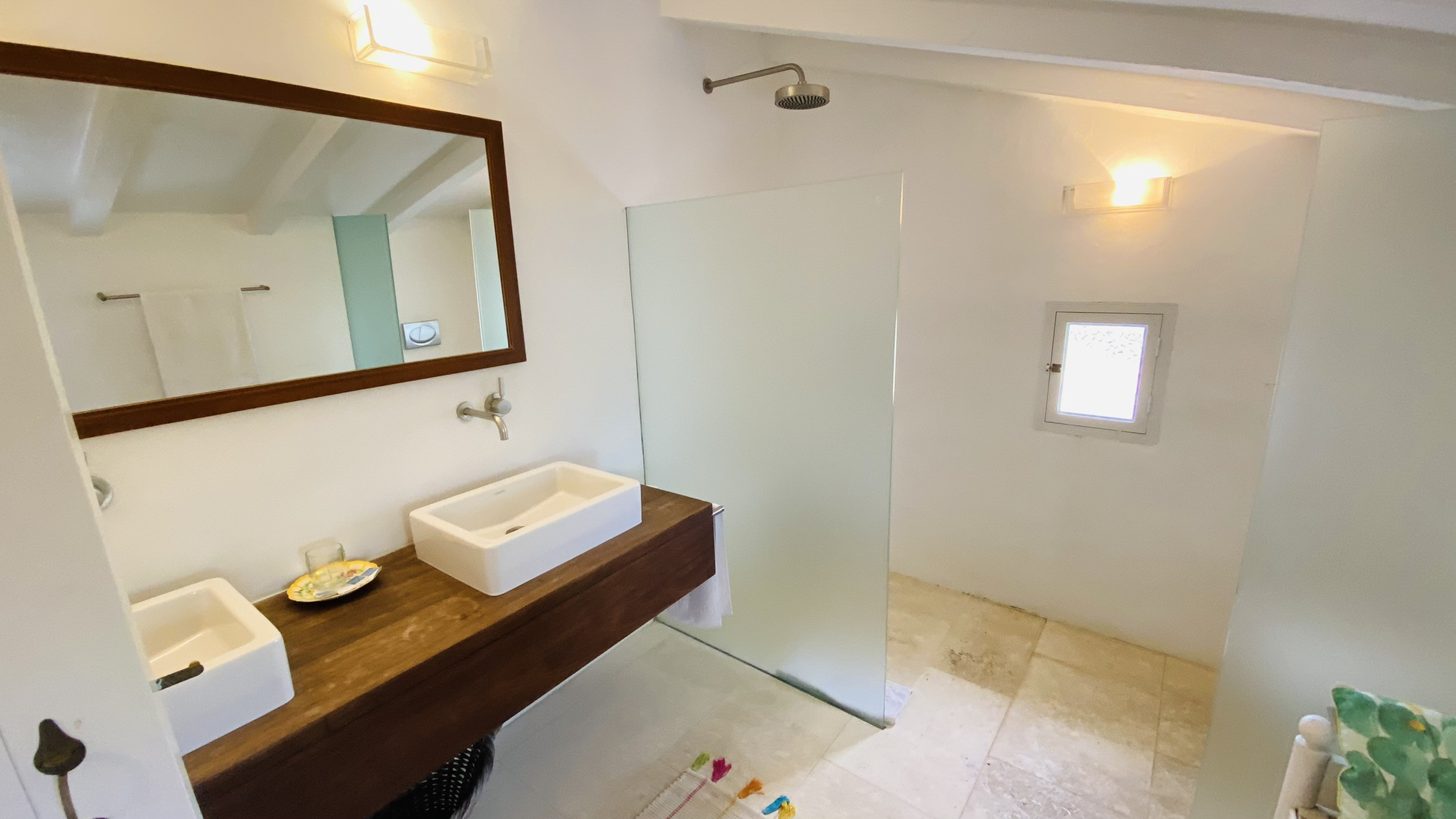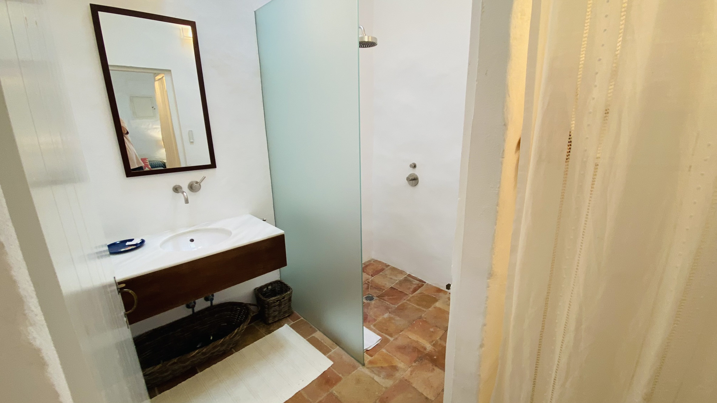Erste Etage: 1 Eheschlafzimmer mit Klimaanlage, 1 Doppelzimmer mit Klimaanlage und 1 Badezimmer mit Dusche.