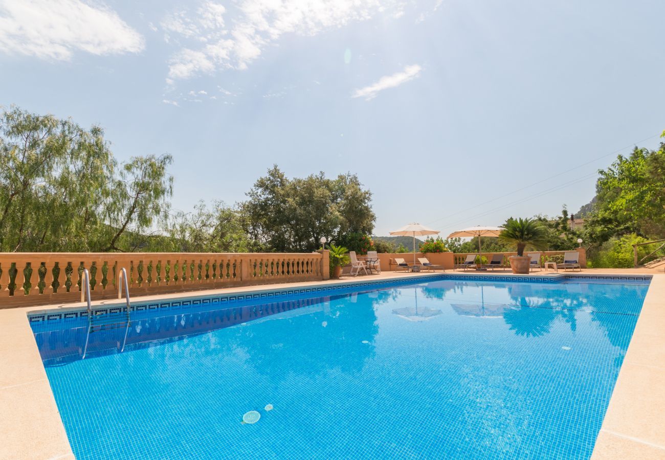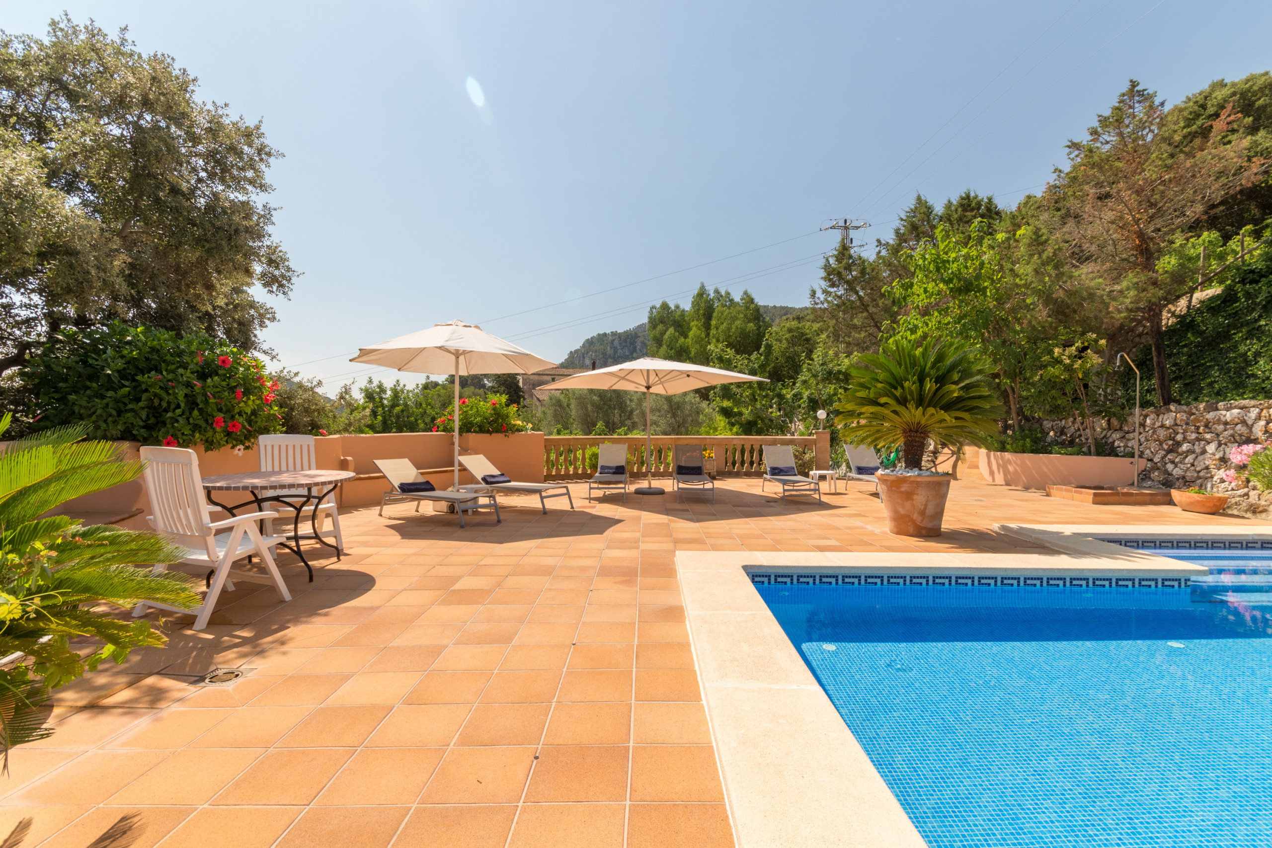 Das Ferienhaus "Aire Can Pieres" heißt Sie mit einem großzügigen Parkplatz und einem beeindruckenden privaten Pool willkommen. Der Poolbereich ist von lebhaften Blumen und Pflanzen umgeben und bietet eine Außendusche, ein komplettes Badezimmer im Poolhaus, bequeme Sonnenliegen und einen schattigen Sitzbereich. Die Terrasse ist mit Markisen überdacht und verfügt über einen Esstisch und Loungemöbel, ideal für Mahlzeiten oder Entspannung. Außerdem gibt es einen gemauerten Grill und ruhige Plätze unter den Bäumen, an denen Sie die Aussicht auf die terrassierte Landschaft genießen können.