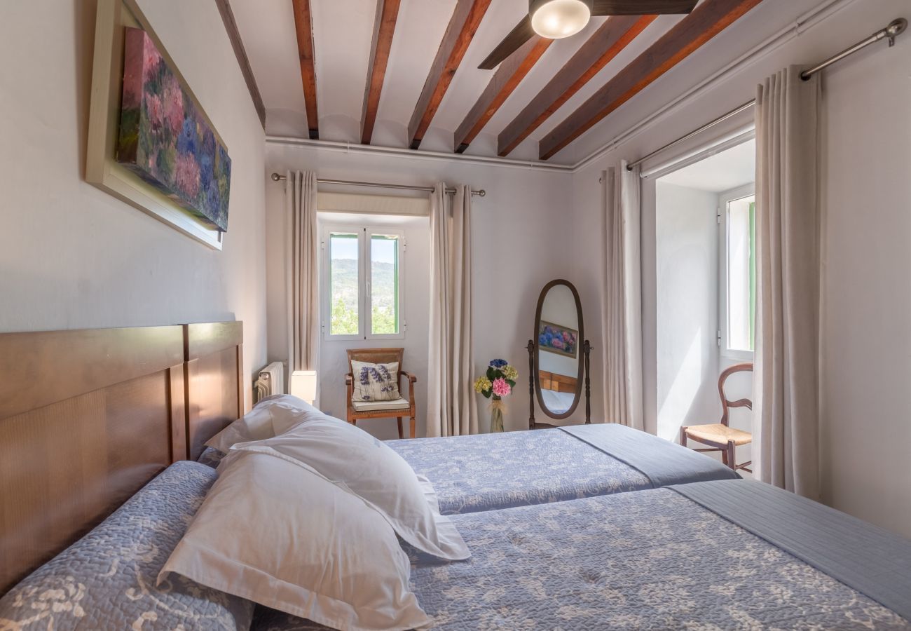 Im Inneren strahlt das Haus mit Holzbalken und traditionellem Mobiliar rustikalen Charme aus. Der Ess- und Wohnbereich ist mit einer voll ausgestatteten Küche verbunden, und eine gemütliche Ecke am Kamin ist perfekt, um ein Glas lokalen Weins zu genießen. Ein besonderes Highlight des Hauses ist der traditionelle Wasserbrunnen, ein typisches Element in Esporles.