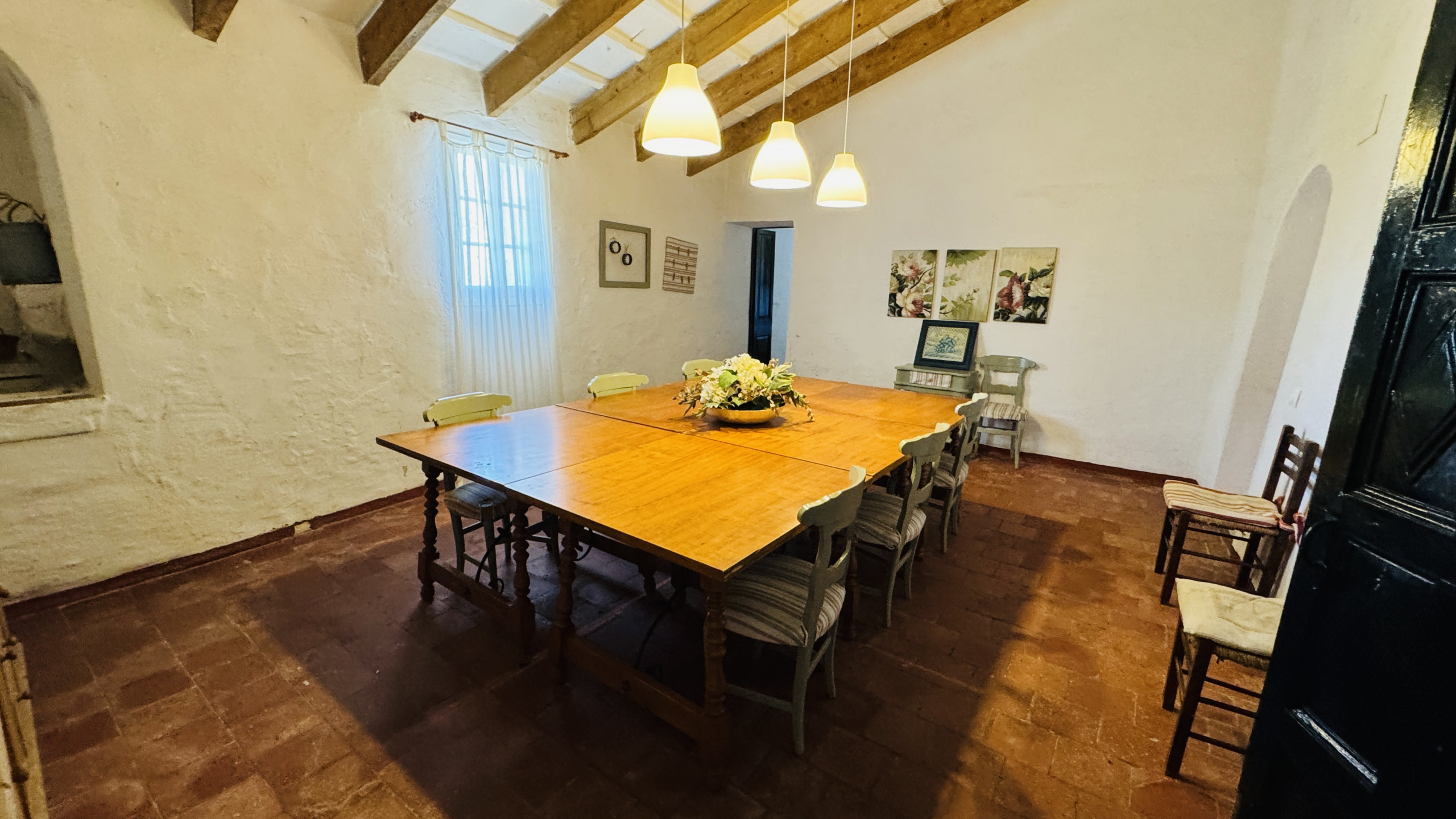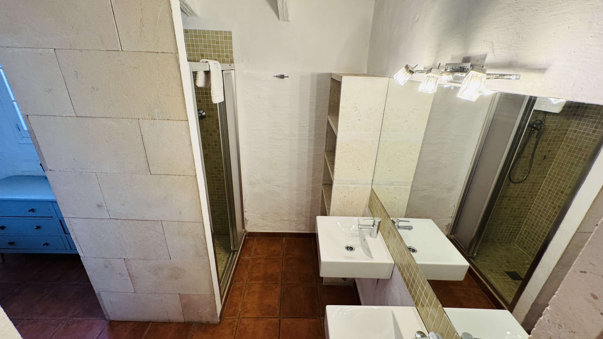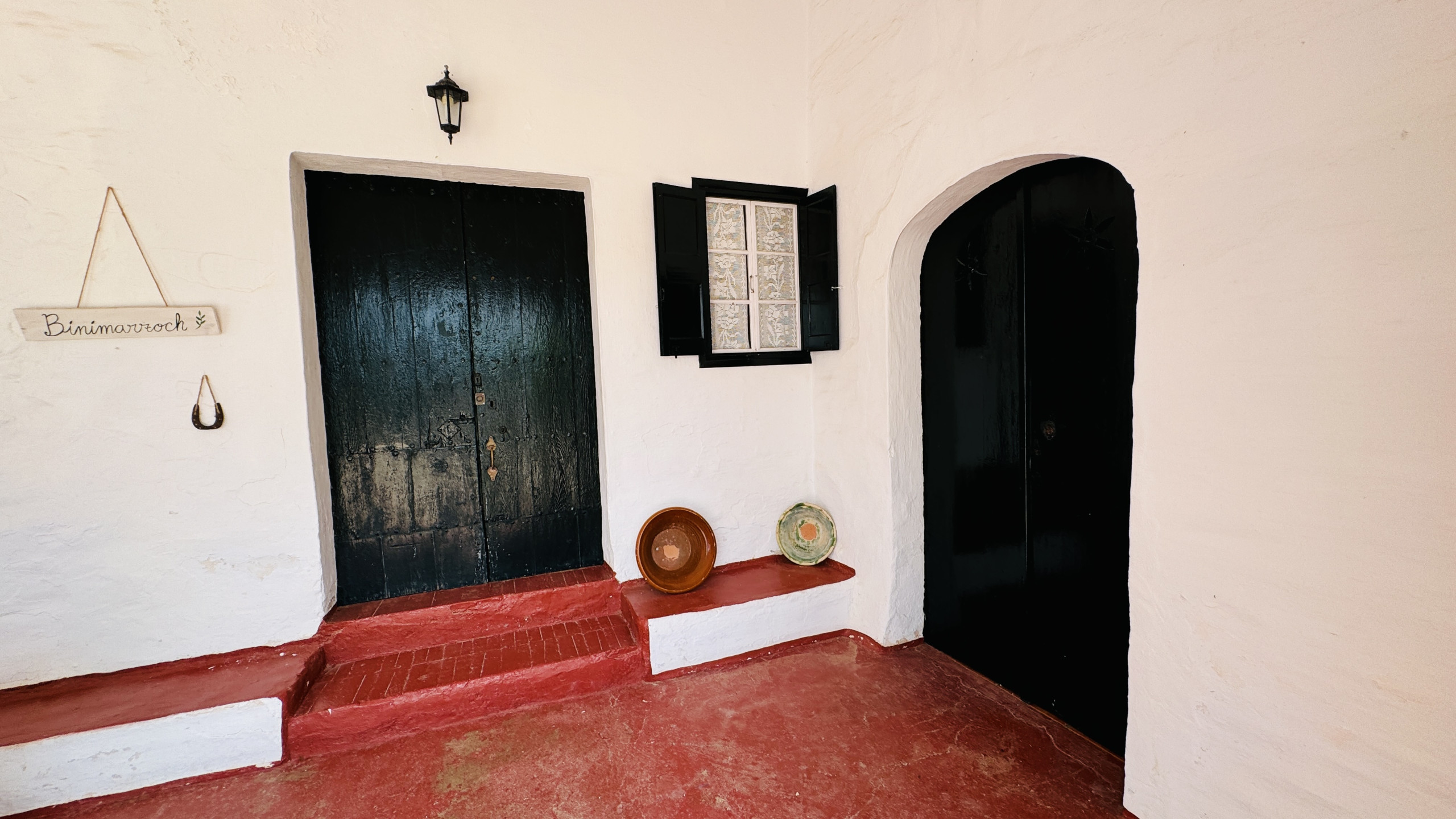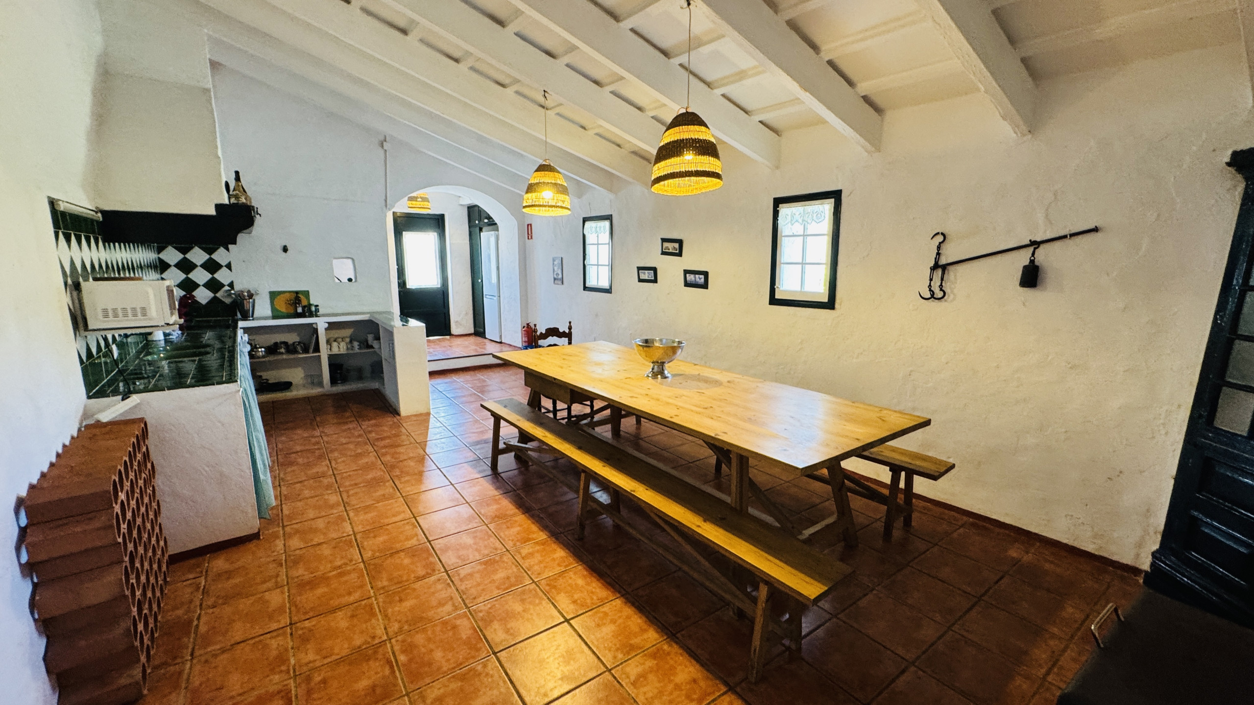 Verteilung: geräumiges Hauptwohnzimmer (mit einer Höhe von 5 m und Steinwänden) mit direktem Zugang nach draußen, großzügiges Esszimmer, große typische menorquinische Küche mit einem "Bauernhoftisch", 2 Doppelzimmer mit Dusche en-suite, 2 Eheschlafzimmer, 1 vollständiges Badezimmer und 1 Badezimmer mit Dusche.