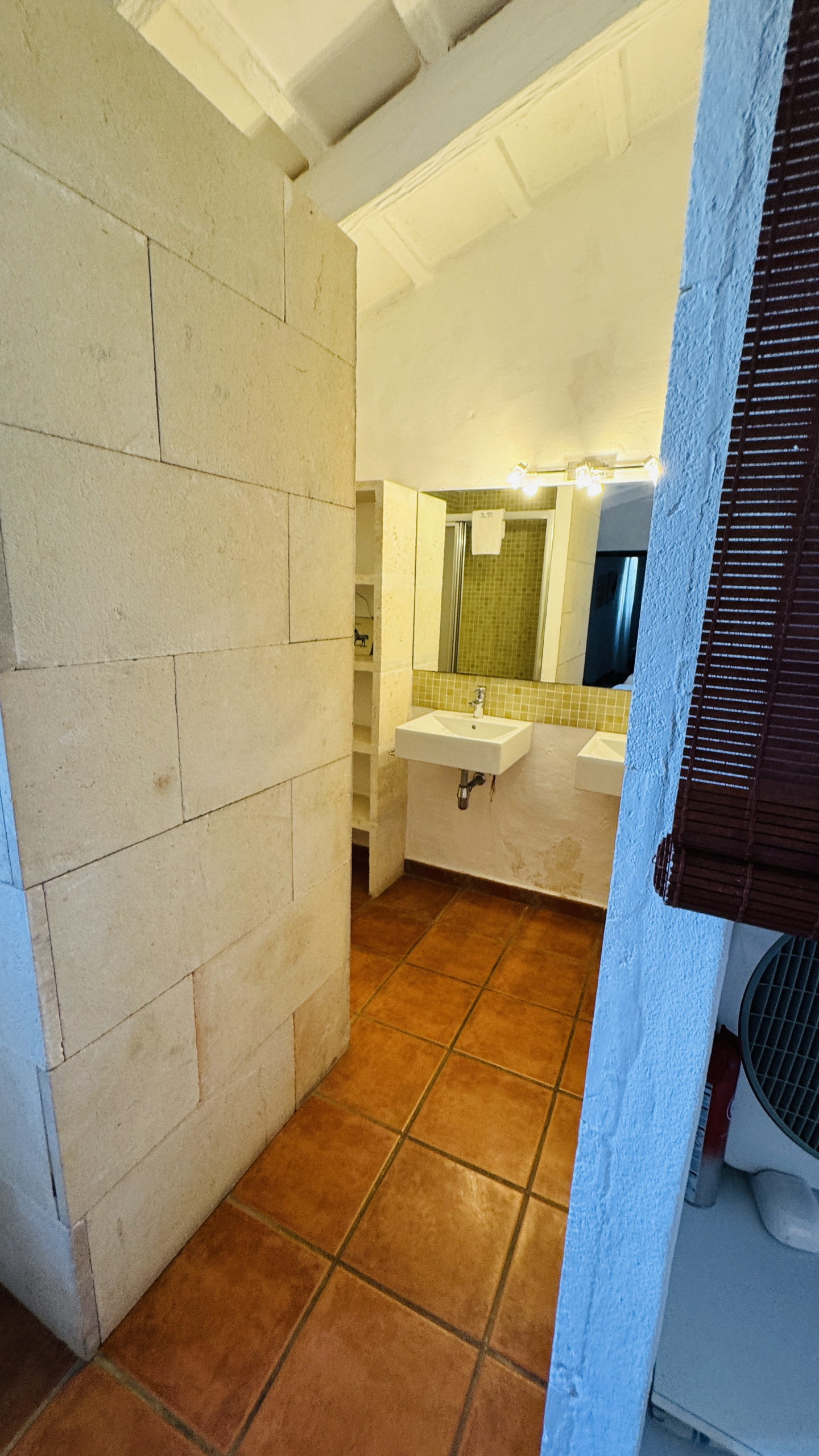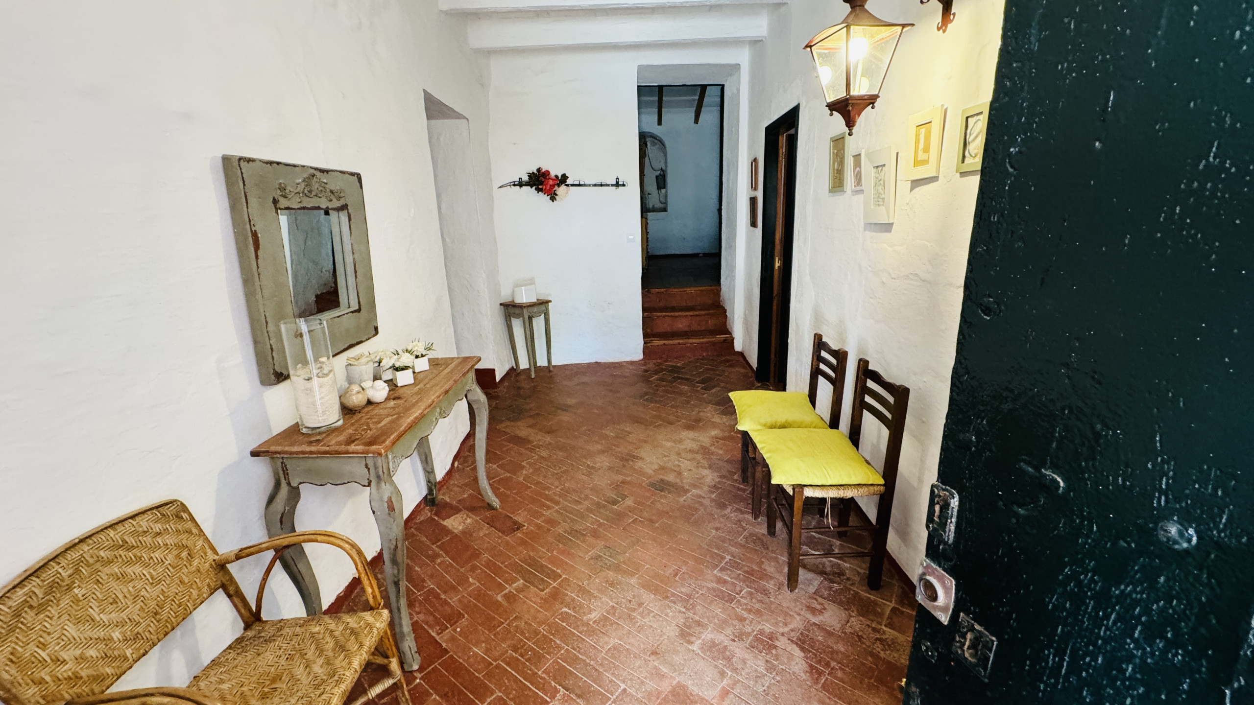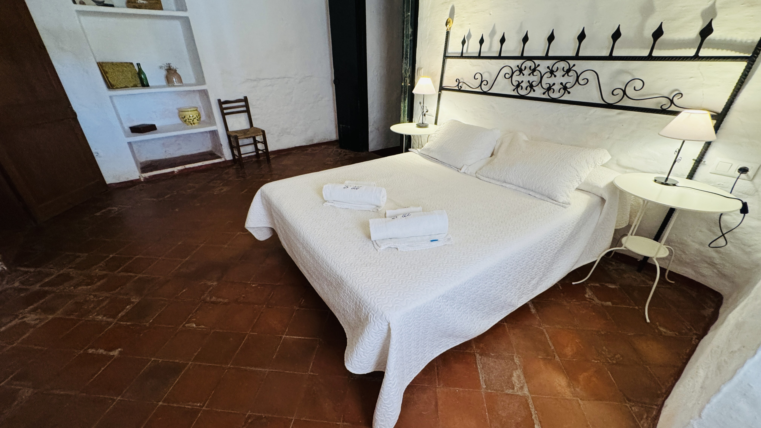 Verteilung: geräumiges Hauptwohnzimmer (mit einer Höhe von 5 m und Steinwänden) mit direktem Zugang nach draußen, großzügiges Esszimmer, große typische menorquinische Küche mit einem "Bauernhoftisch", 2 Doppelzimmer mit Dusche en-suite, 2 Eheschlafzimmer, 1 vollständiges Badezimmer und 1 Badezimmer mit Dusche.