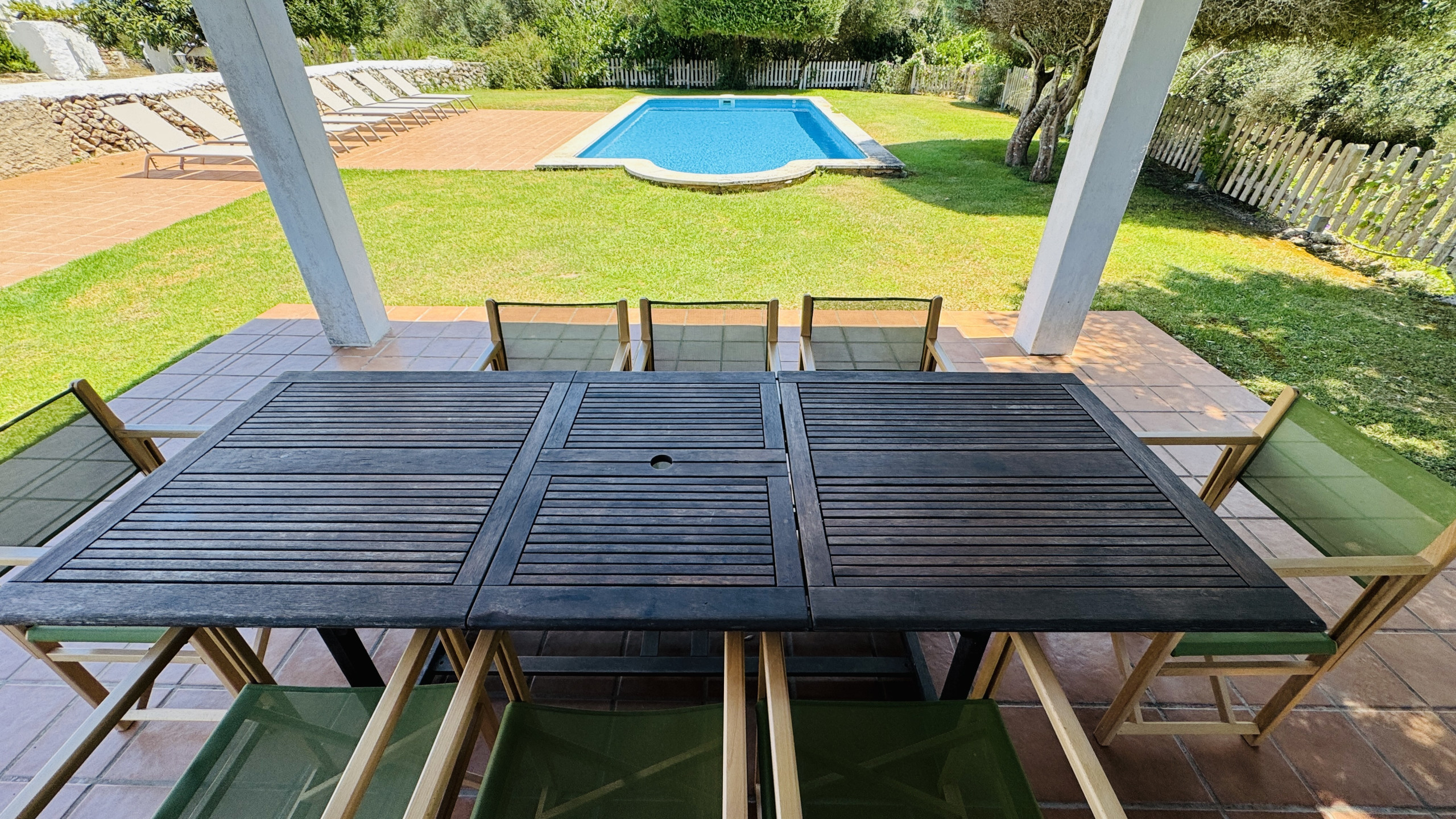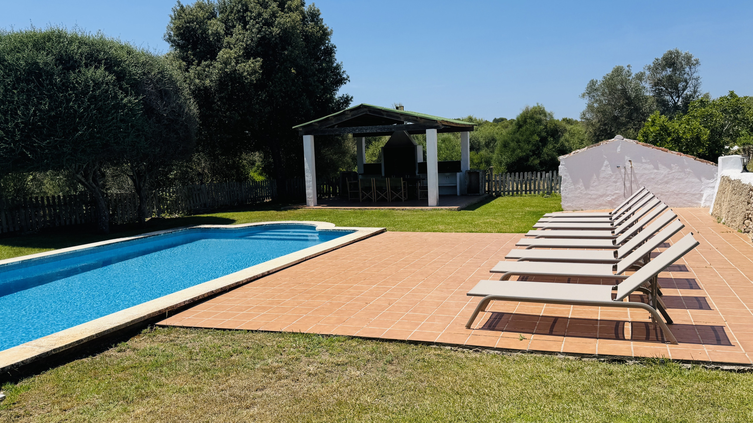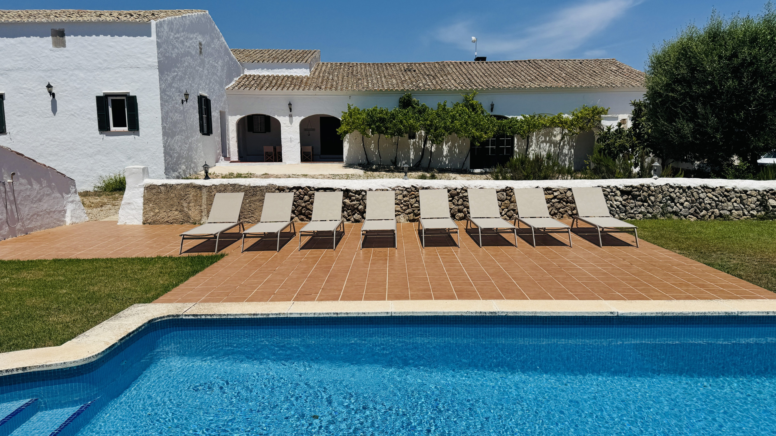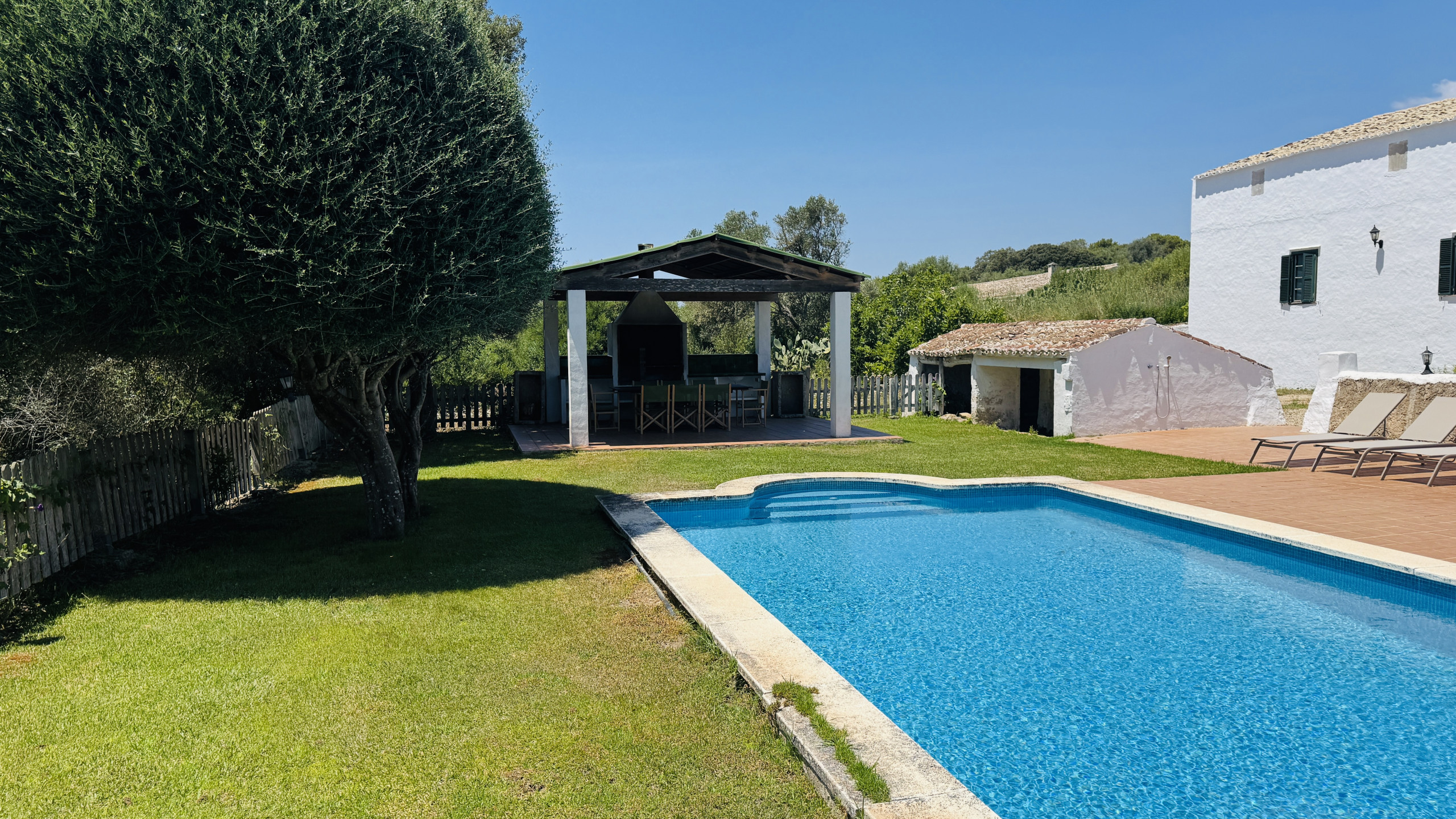 Die Häuser des Anwesens wurden renoviert und behalten die typischen Merkmale bei (Böden vom Typ "Lehm", sichtbare Balken, alte Wände usw.) und integrieren die für das moderne Leben notwendigen Annehmlichkeiten. Man erreicht das Haus von der Straße aus über einen gut befahrbaren Feldweg von etwa 200 m. Die Lage auf einem Hügel ermöglicht einen hervorragenden Blick auf die menorquinische Landschaft und Kiefernwälder. Das Anwesen verfügt über einen Pool (9 m x 4 m mit römischen Treppen), der von einer eingezäunten Rasenfläche umgeben ist, auf der Kinder spielen können. Es gibt auch eine Pergola mit einer gemauerten Grillstelle, Tisch und Stühlen zum Essen im Schatten. Die Ruhe, Privatsphäre und Beschaulichkeit dieser Immobilie sind garantiert, da es keine Nachbarn gibt.