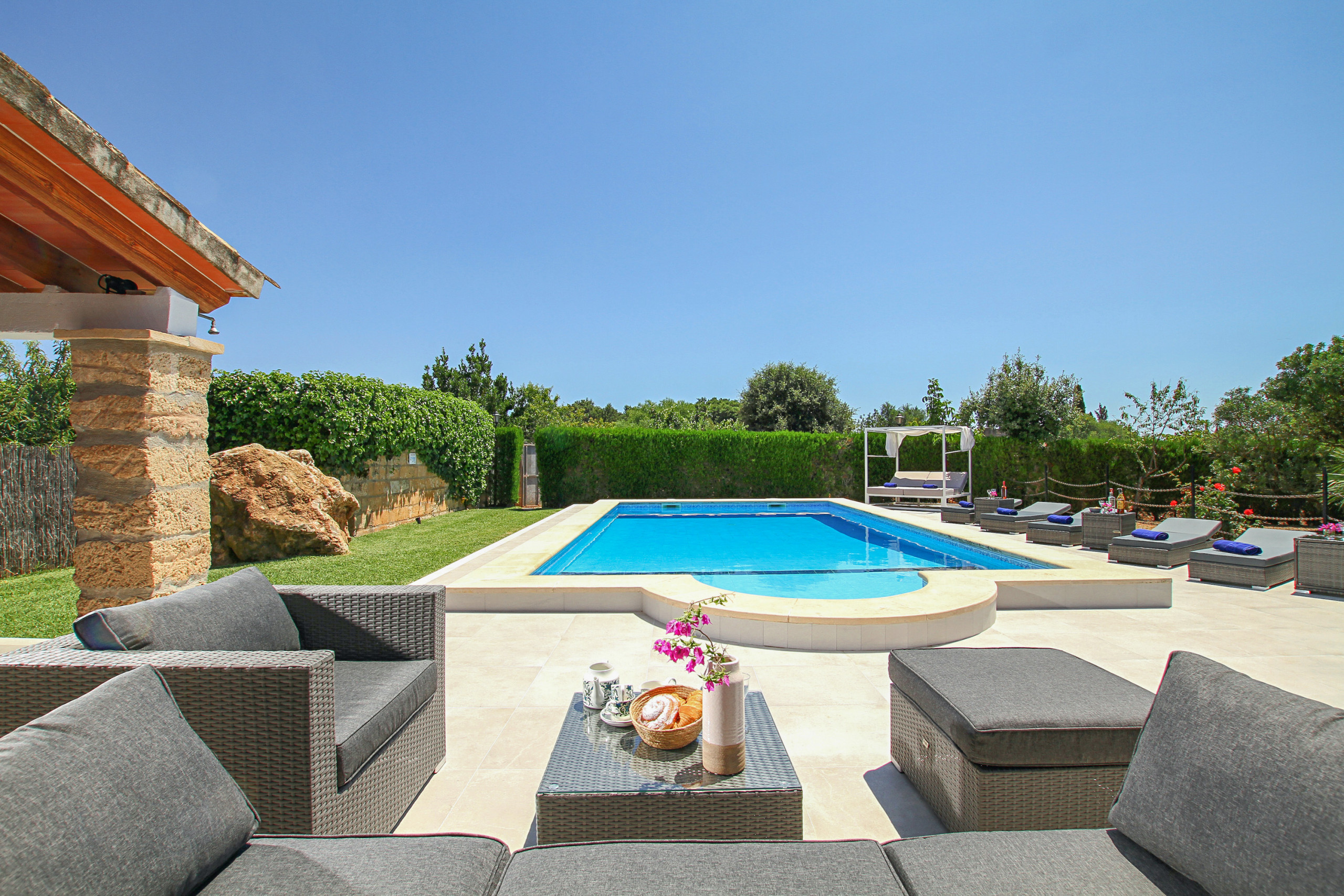 We stayed here for a week in this beautiful villa- really lovely surroundings. Kitchen is well equipped and the outdoor kitchen area was amazing. All the bedrooms were a good size. Pool area was lovely. It’s really well located.