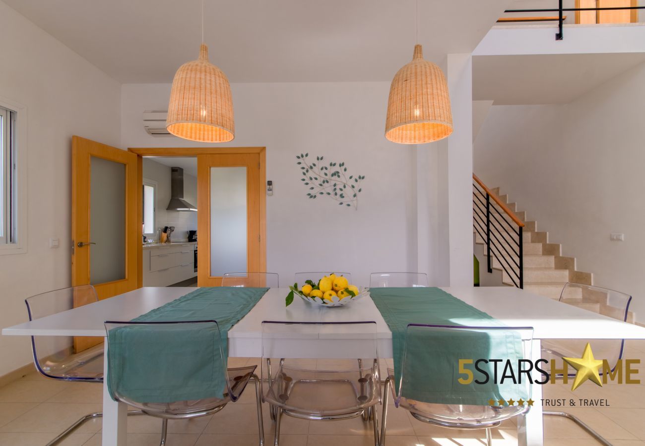 Das 212m² moderne Interieur beider Häuser zieht sich über 2 Ebenen. Der untere Wohnbereich ist offen gehalten und besteht aus grossem und sehr hellen Esszimmer mit langer Esstafel, wo gemütlich die ganze Reisegruppe Platz findet und einer gemütlichen Sofaecke mit Sat-TV. Die angrenzende Küche ist super modern und mit praktischer Kücheninsel ausgestattet.Auch von hier aus hat man direkten Zugang zur Terrasse. Die grossen Fenster und Schiebetürelemente lassen viel positives Tageslicht herein und schaffen so ein tolles Wohnambiente. Bevor man die Treppe hinauf geht, gibt es auf der linken Seite noch 2 Doppelschlafzimmer mit je 2 Einzelbetten und einem Badezimmer in der Mitte, welches hier geteilt wird. Der obere Schlafbereich bietet 2 weitere grosse Doppelschlafzimmer mit Doppelbett. Hier haben beide Schlafzimmer ihr eigenes Badezimmer en suite. Alle Schlafzimmer sind sehr modern und komfortabel eingerichtet und mit geräumigen Einbauschränken bestückt. Klimaanlage ist im gesamten Haus installiert. Wenn sie mit Babies anreisen geben sie uns bitte Bescheid, damit wir ihnen Babybetten und Hochstühle bereit stellen können.