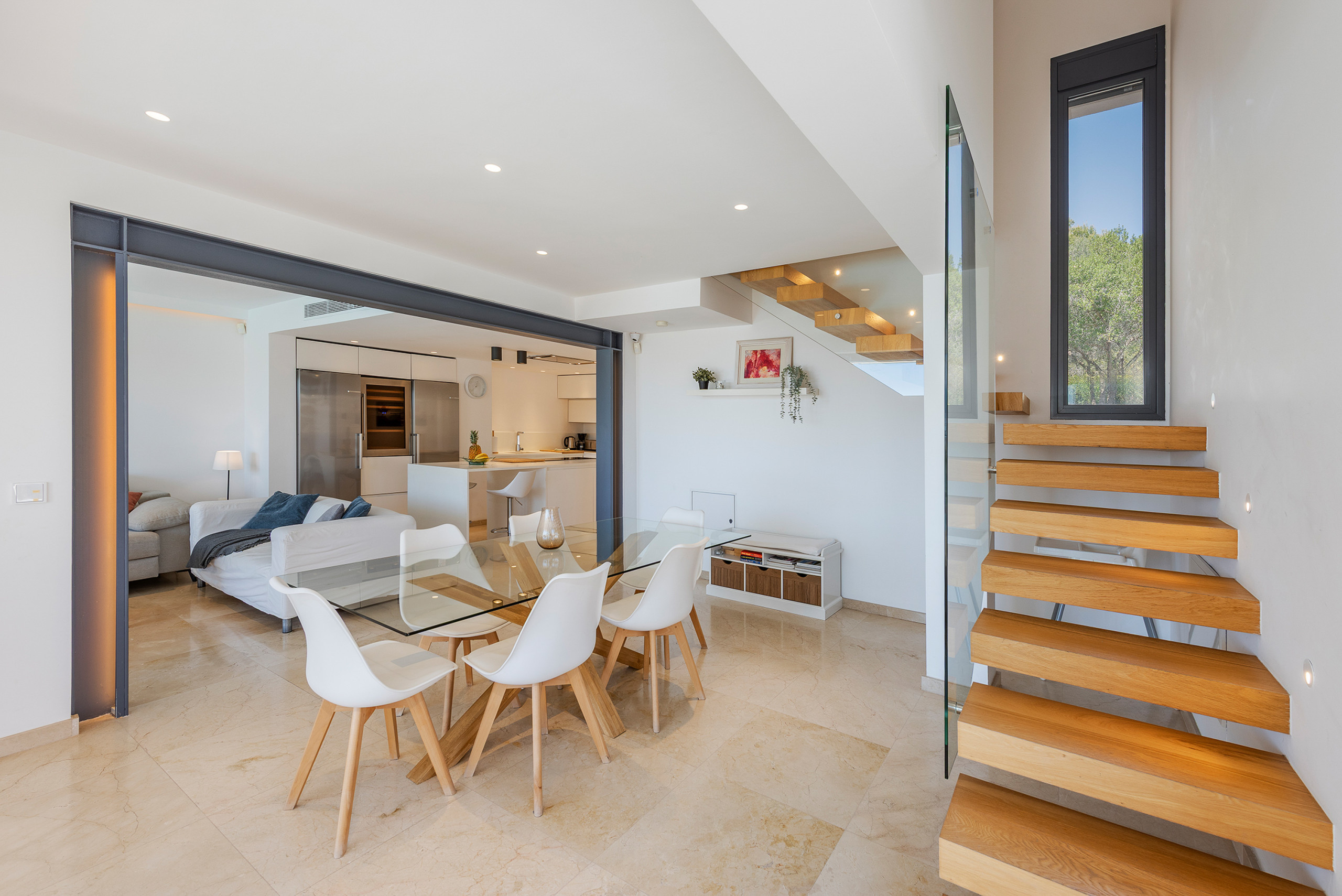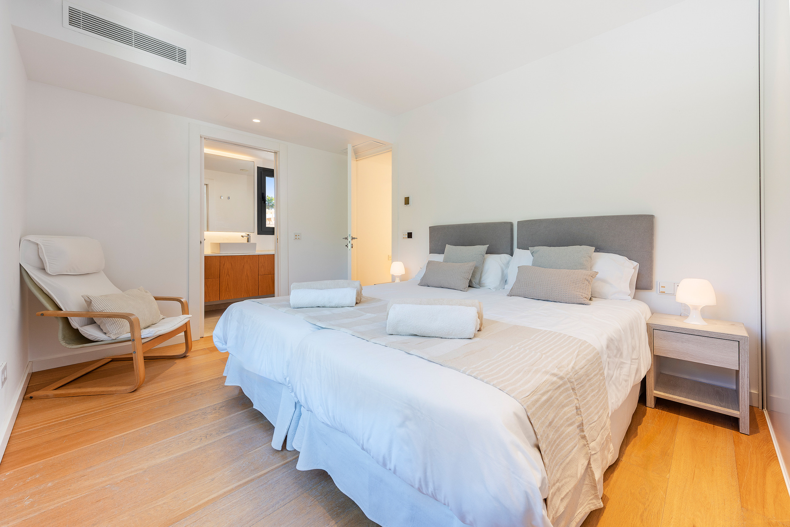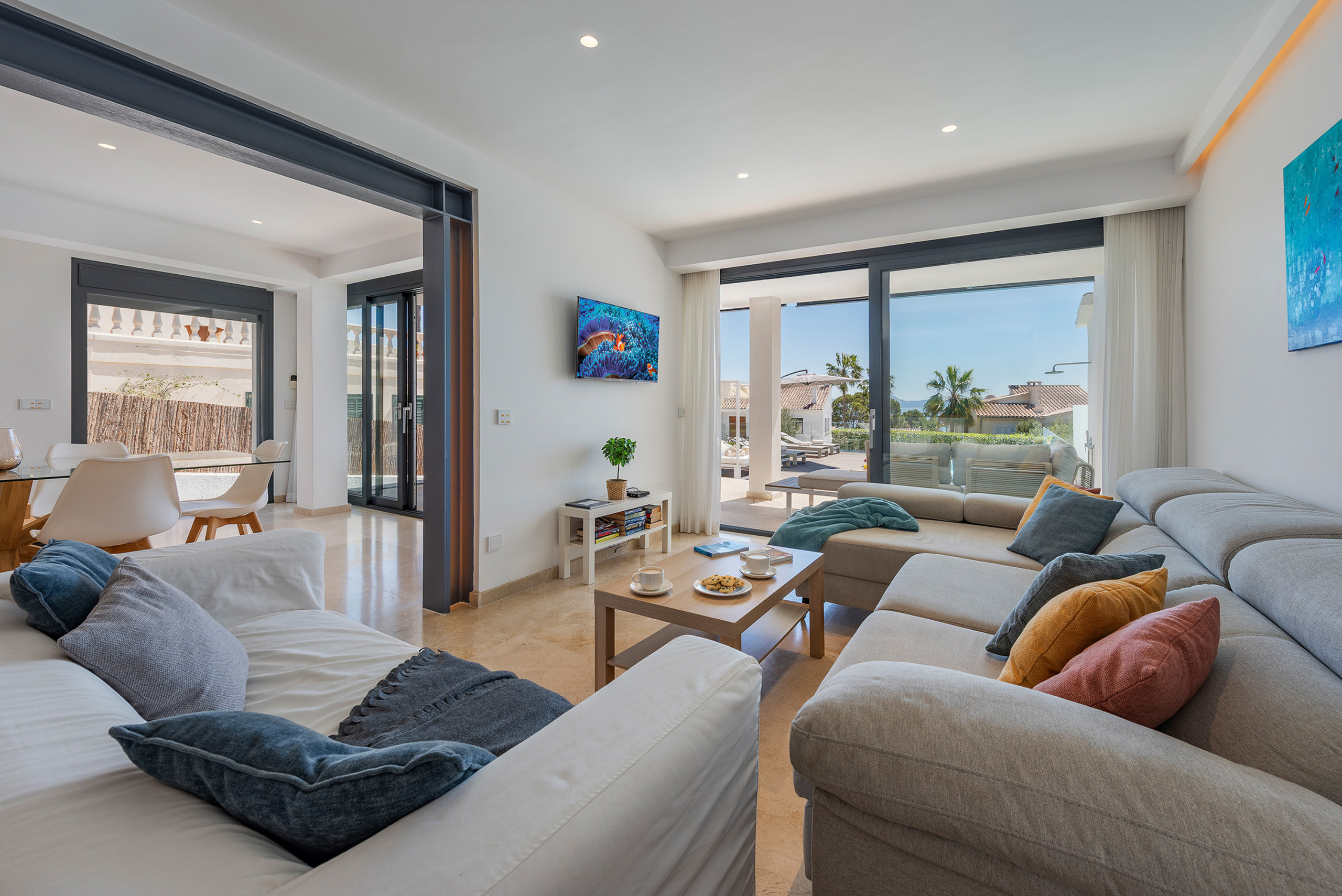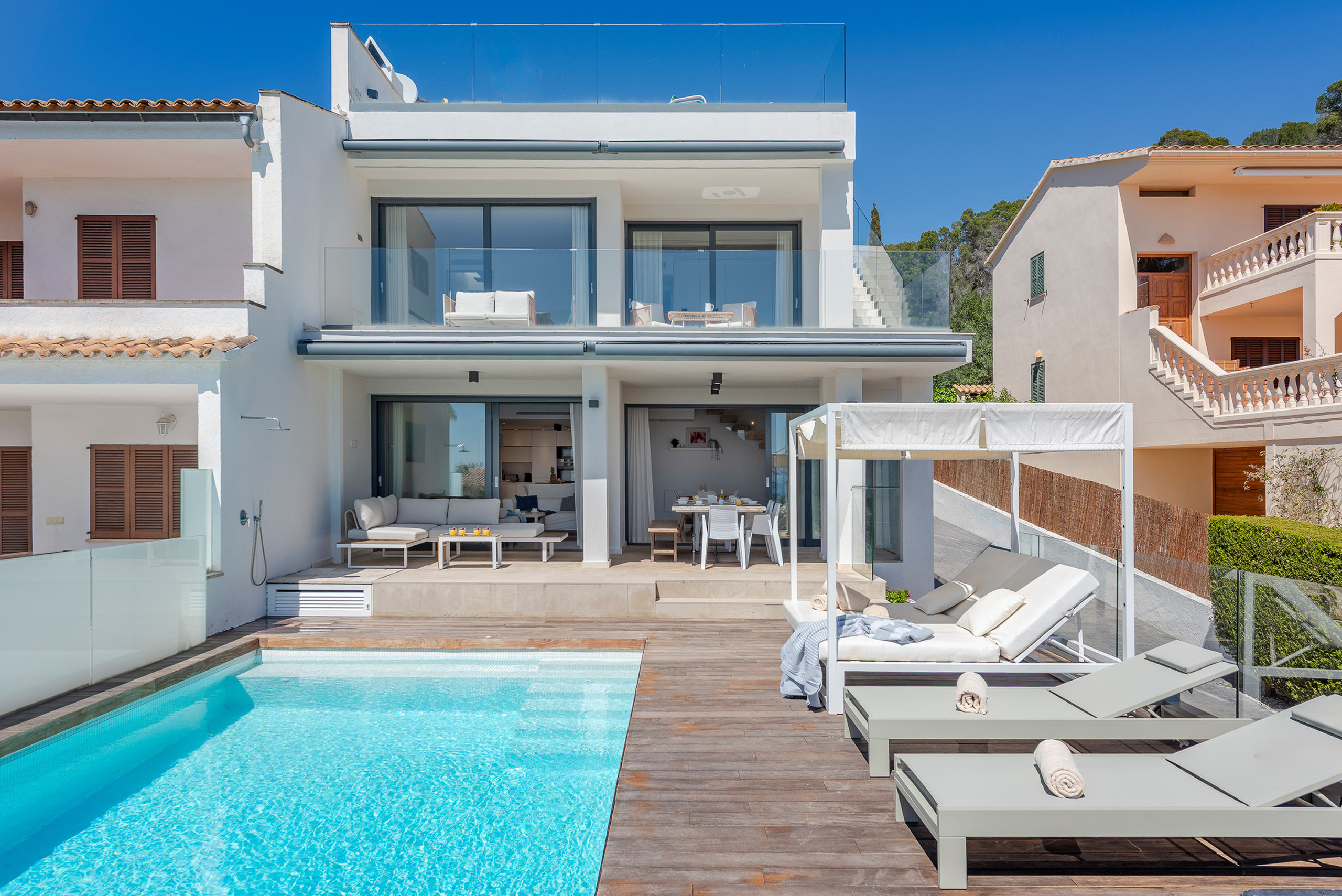Das 208m² moderne Interieur zieht sich über 2 Etagen. Im unteren Bereich gibt es eine gemütliche TV-Ecke mit bequemen Polstermöbeln und Terrassenzugang. Das offene Esszimmer ist hier in den Wohnbereich integriert. Die Küche ist separat angelegt, hat aber direkten Zugang zum Essbereich und ist mit allem ausgestattet was man so in einer gut funktionierenden Küche braucht. Im Erdgeschoss befindet sich ausserdem 1 grossen Doppelschlafzimmer sowie ein Badezimmer. Der restliche Schlafbereich ist in der oberen Etage eingerichtet und besteht aus 3 modernen Doppelschlafzimmer und 2 hübschen Bädern. Alle Bereiche im Haus sind mit Klimaanlage ausgestattet und mit viel Liebe zum Detail gestaltet. Auf Anfrage stellen wir unseren kleinsten Gästen gerne Babybetten und Hochstühle bereit. Gratis Wifi-Internet gehört hier natürlich auch zur Grundausstattung. Das gesamte Mobiliar ist sehr modern und bequem ausgewählt worden, und bietet so die ideale Grundlage für einen erholsamen Urlaub…