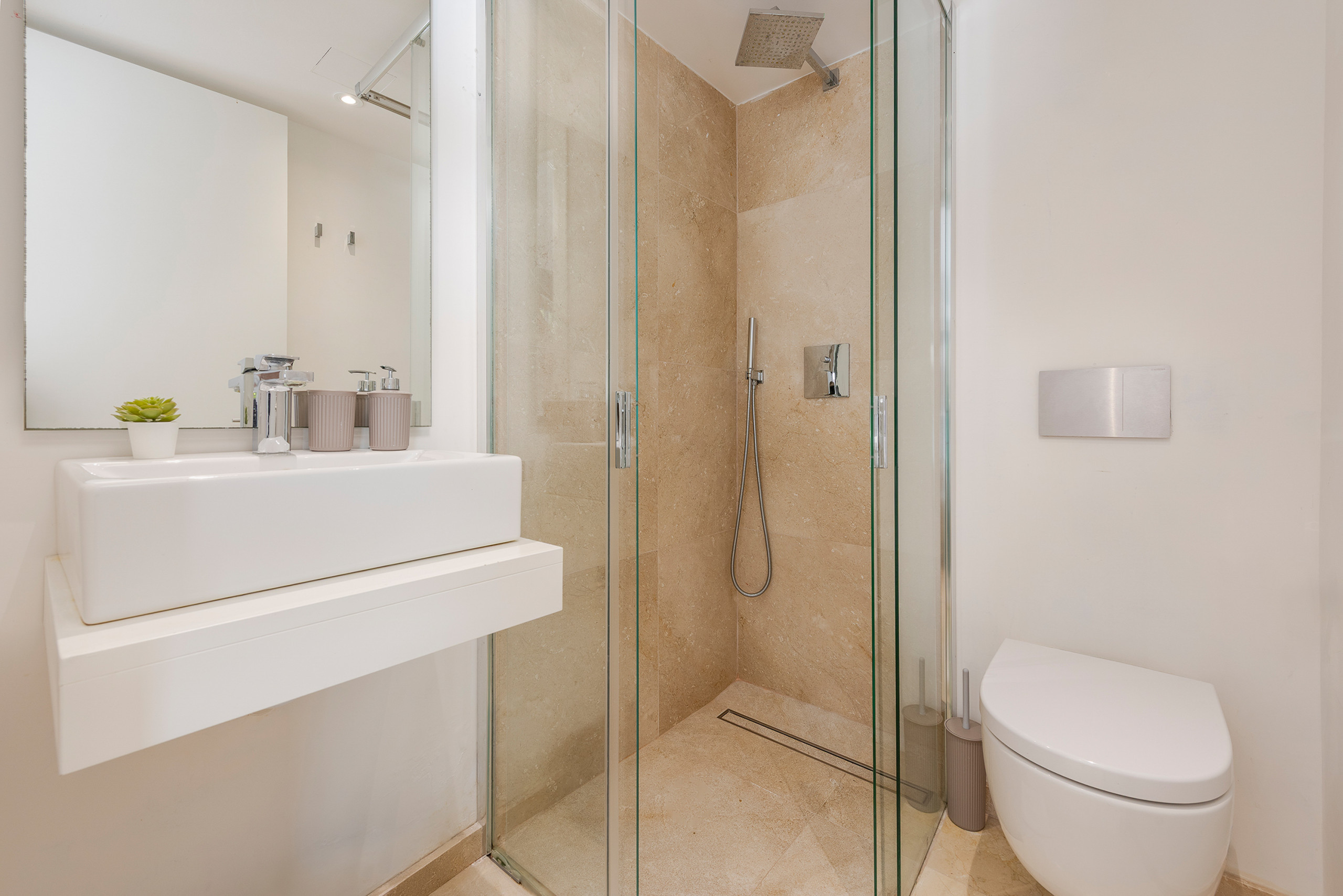 Mit einer Wohnfläche von 235 m² auf einem 417 m² großen Grundstück bietet die Villa ausreichend Platz und Komfort für bis zu 6 Personen. Sie verfügt über 3 helle Schlafzimmer, 3 voll ausgestattete Badezimmer sowie ein zusätzliches Gäste-WC im Erdgeschoss, was eine praktische und funktionale Aufteilung gewährleistet. In einem neu gebauten Anbau befindet sich ein weiteres, sehr privates Schlafzimmer mit zwei Einzelbetten und eigenem Bad en suite, das separat zugänglich ist.