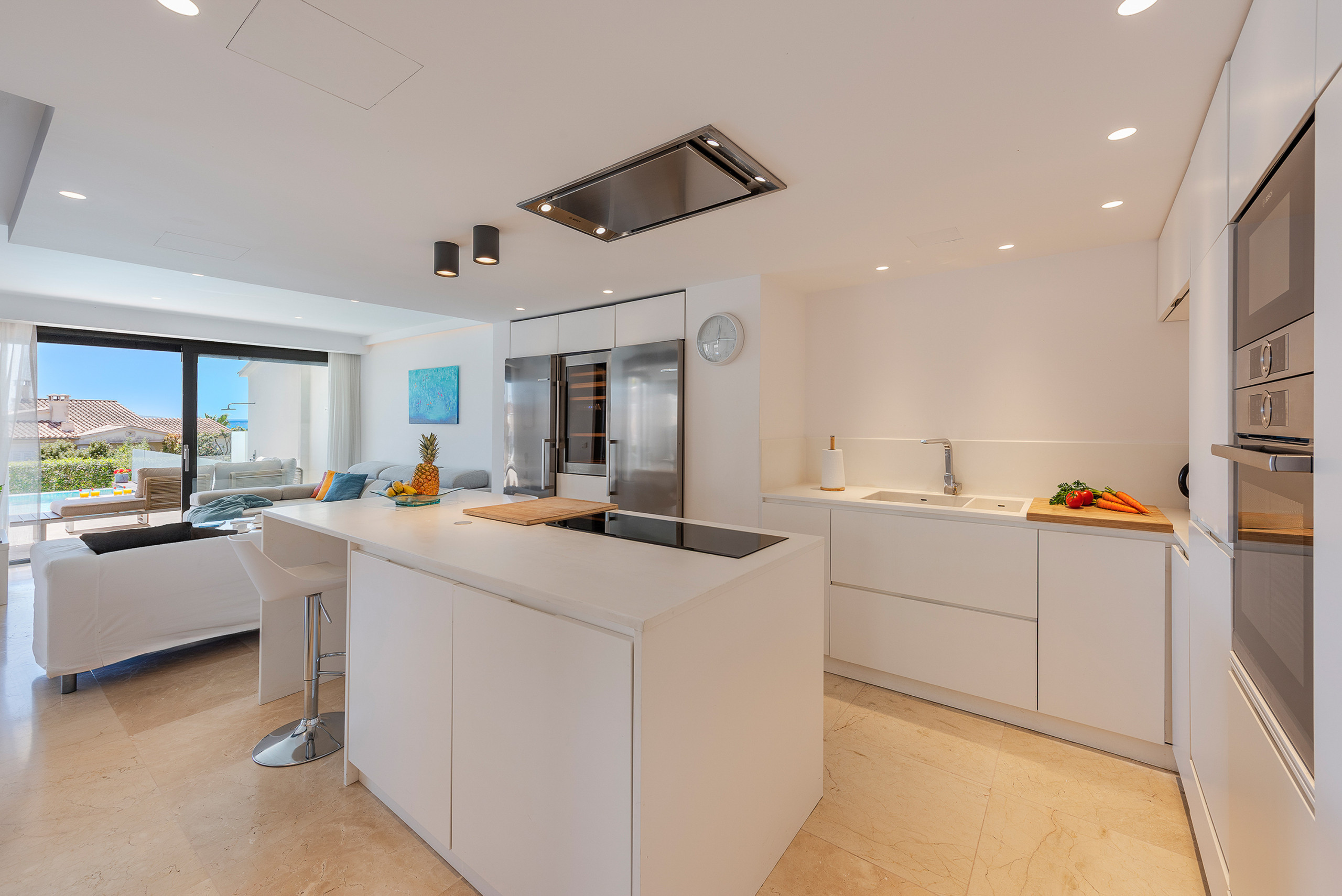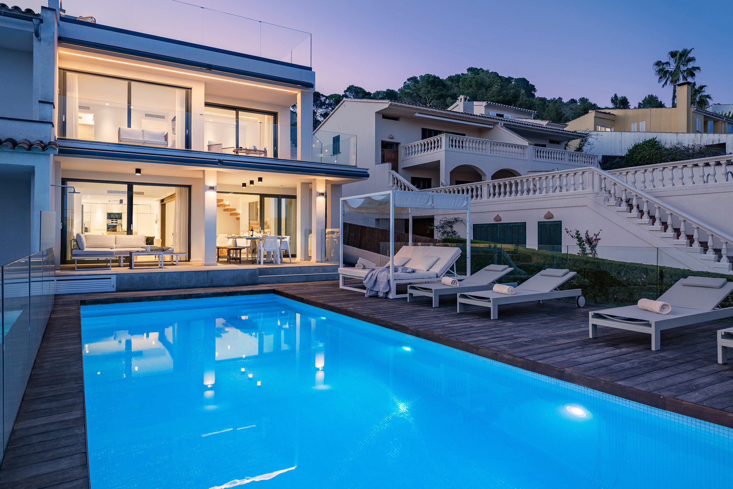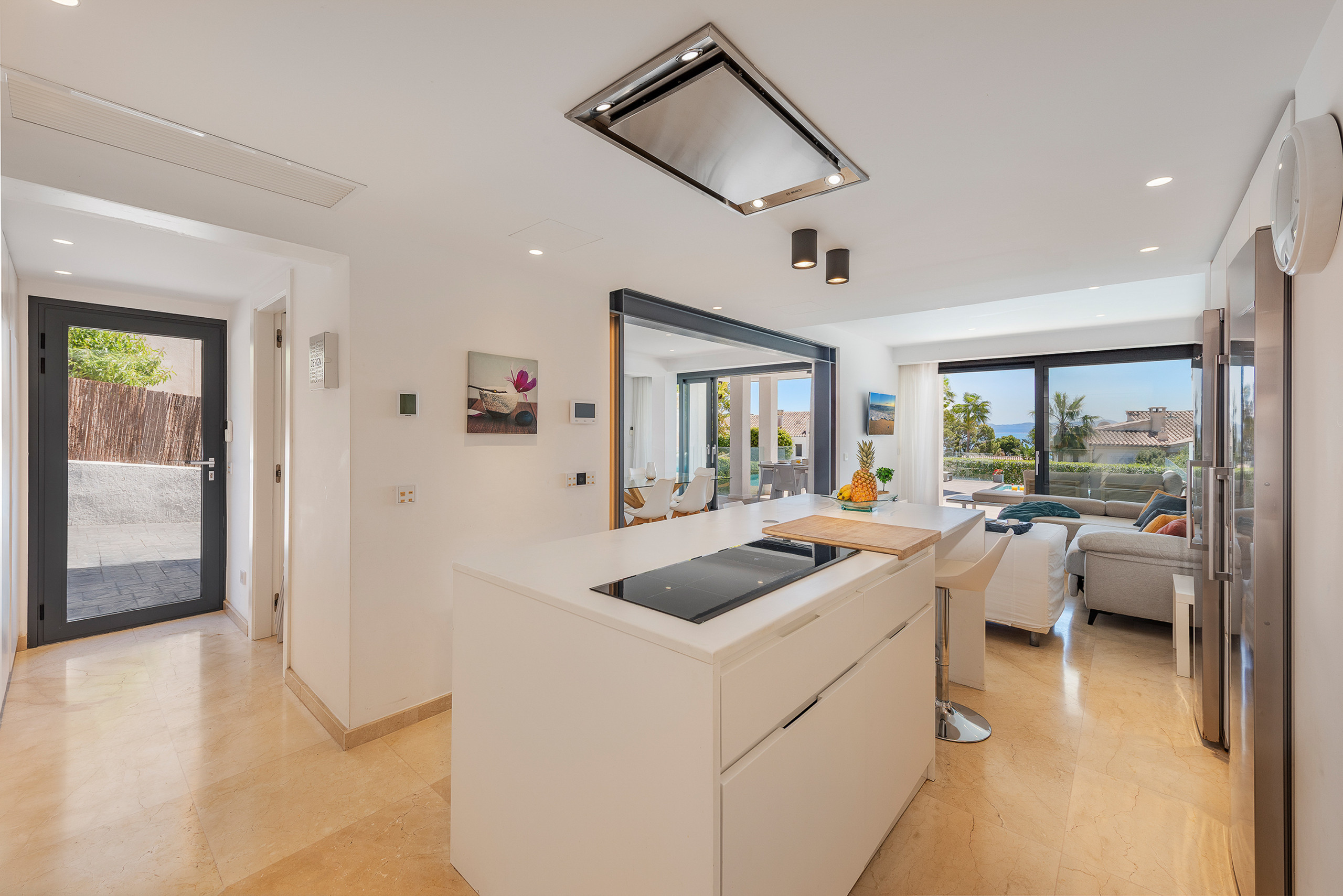 Das Innere überzeugt durch ein modernes und zugleich gemütliches Design mit neutralen Farbtönen, hochwertigen Materialien und einer durchdachten Beleuchtung, die die Großzügigkeit der Räume unterstreicht. Die voll ausgestattete offene Küche ist harmonisch in den Wohn- und Essbereich integriert und schafft einen offenen Raum mit direktem Zugang zur Terrasse. Der Wohn- und Essbereich zeichnet sich durch seine Helligkeit und Weitläufigkeit aus und bietet Kamin, Fernseher sowie direkten Zugang zum Außenbereich, ideal für das mediterrane Lebensgefühl. Im Außenbereich befindet sich ein beeindruckender beheizter Infinity-Pool, umgeben von einer großzügigen Sonnenterrasse mit Liegen und Ruhebereichen. Eine überdachte Terrasse mit Essbereich, Grillzone und Garten rundet das Angebot ab und bietet ideale Voraussetzungen für entspannte Stunden im Freien, sowohl tagsüber als auch abends. Parkmöglichkeiten sind bequem auf der Straße direkt vor der Villa vorhanden.