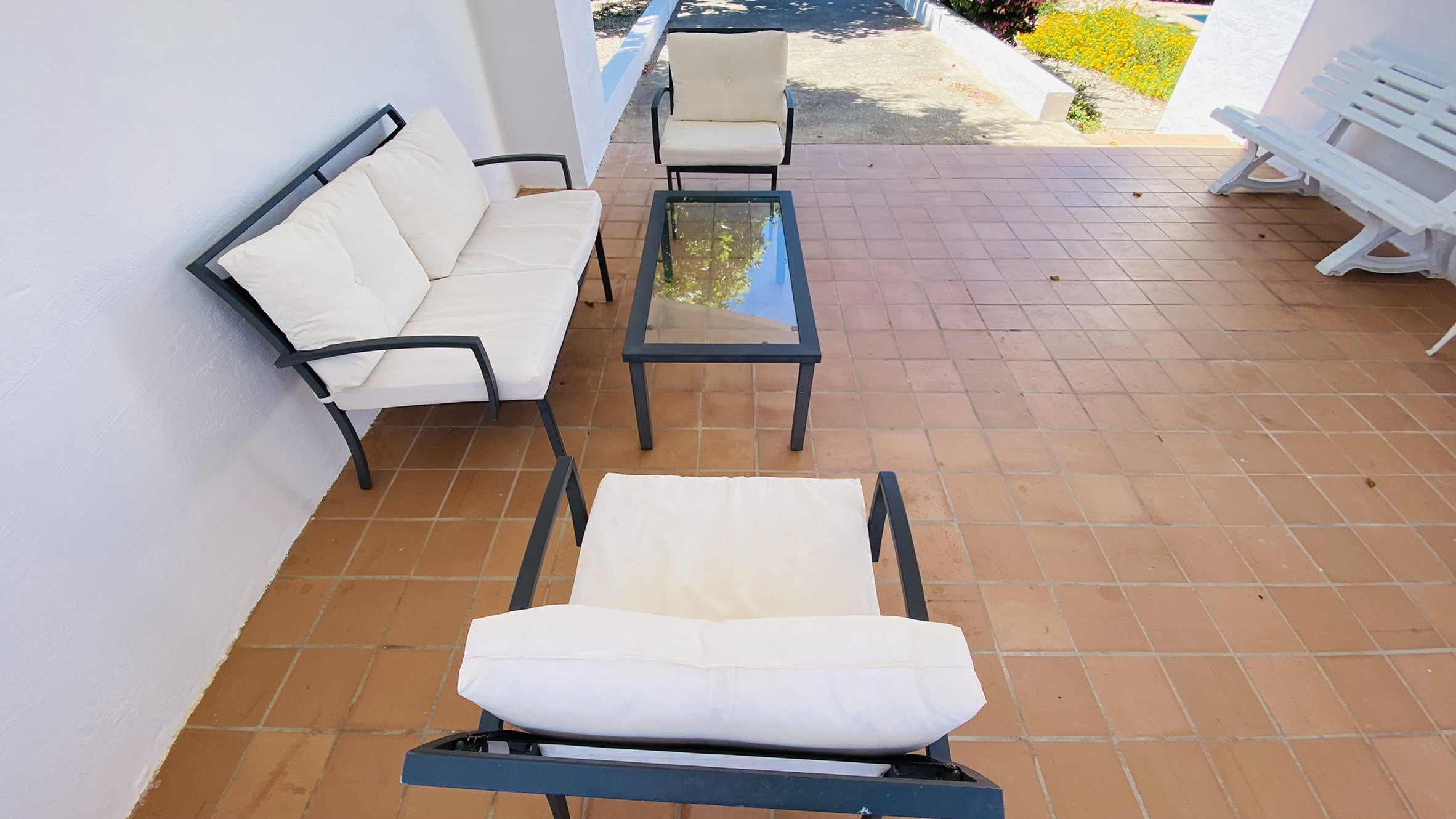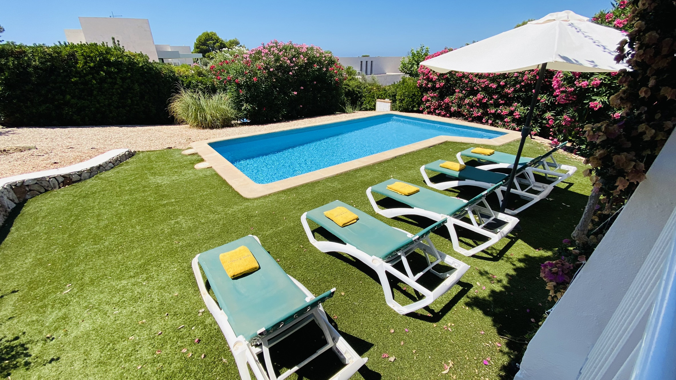 Das Haus verfügt über eine Veranda mit Tisch und Stühlen zum Essen im Freien und Sofas zum Entspannen im Schatten. Es gibt eine Fläche mit künstlichem Rasen mit einheimischer Vegetation und der Pool mit 7m x 3m ist von Terrassenboden umgeben. Es gibt einen gemauerten Grill und eine überdachte Parkfläche.