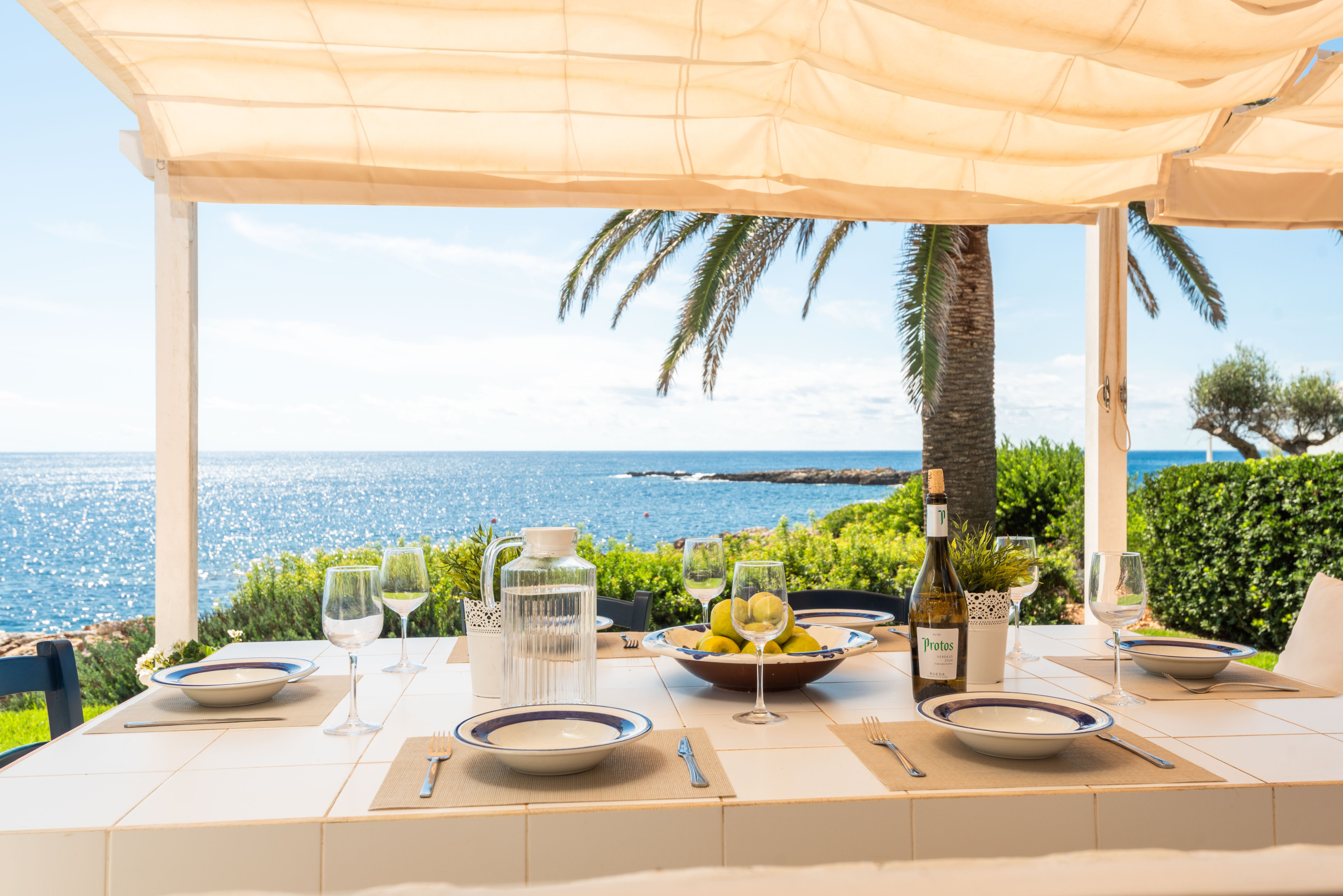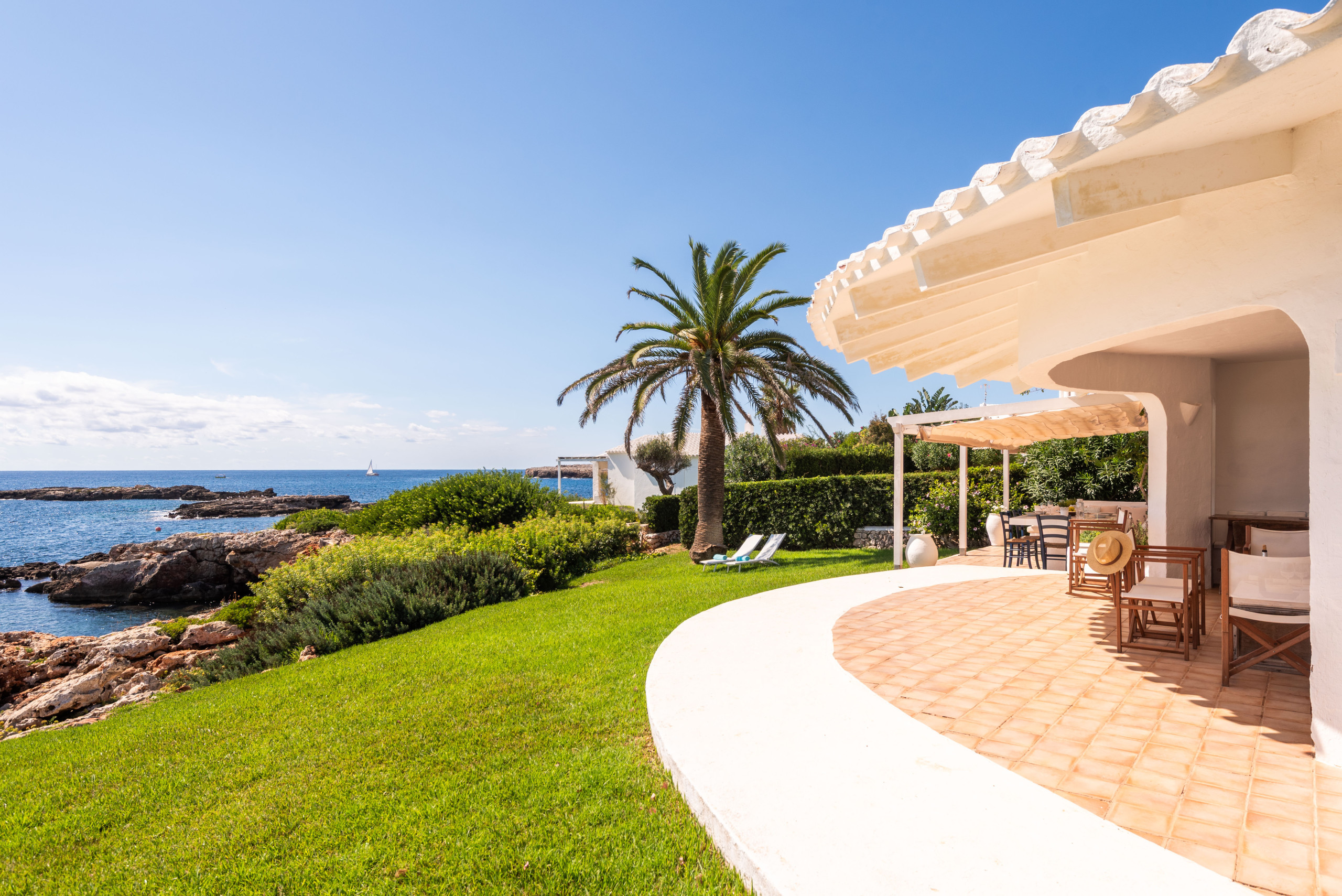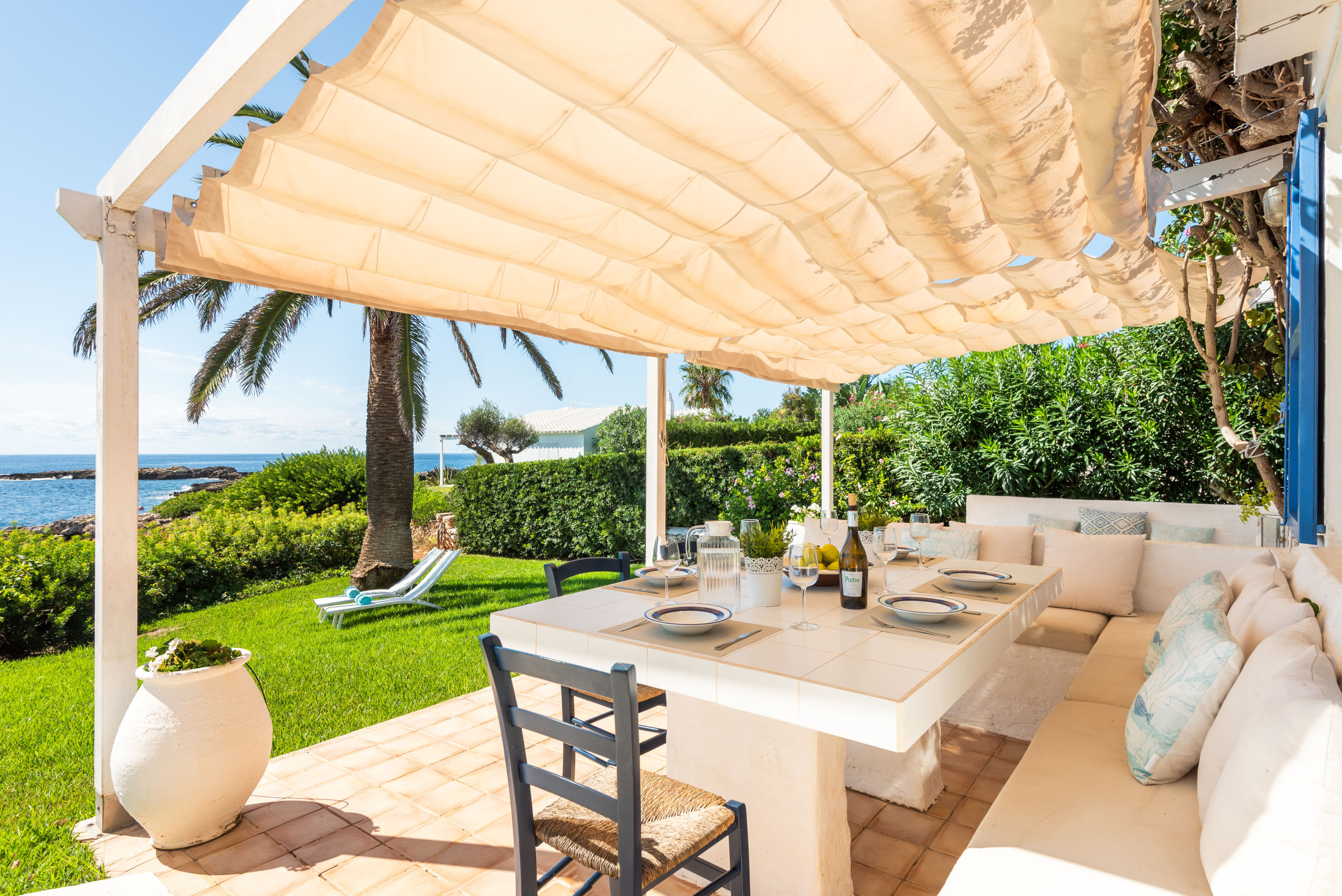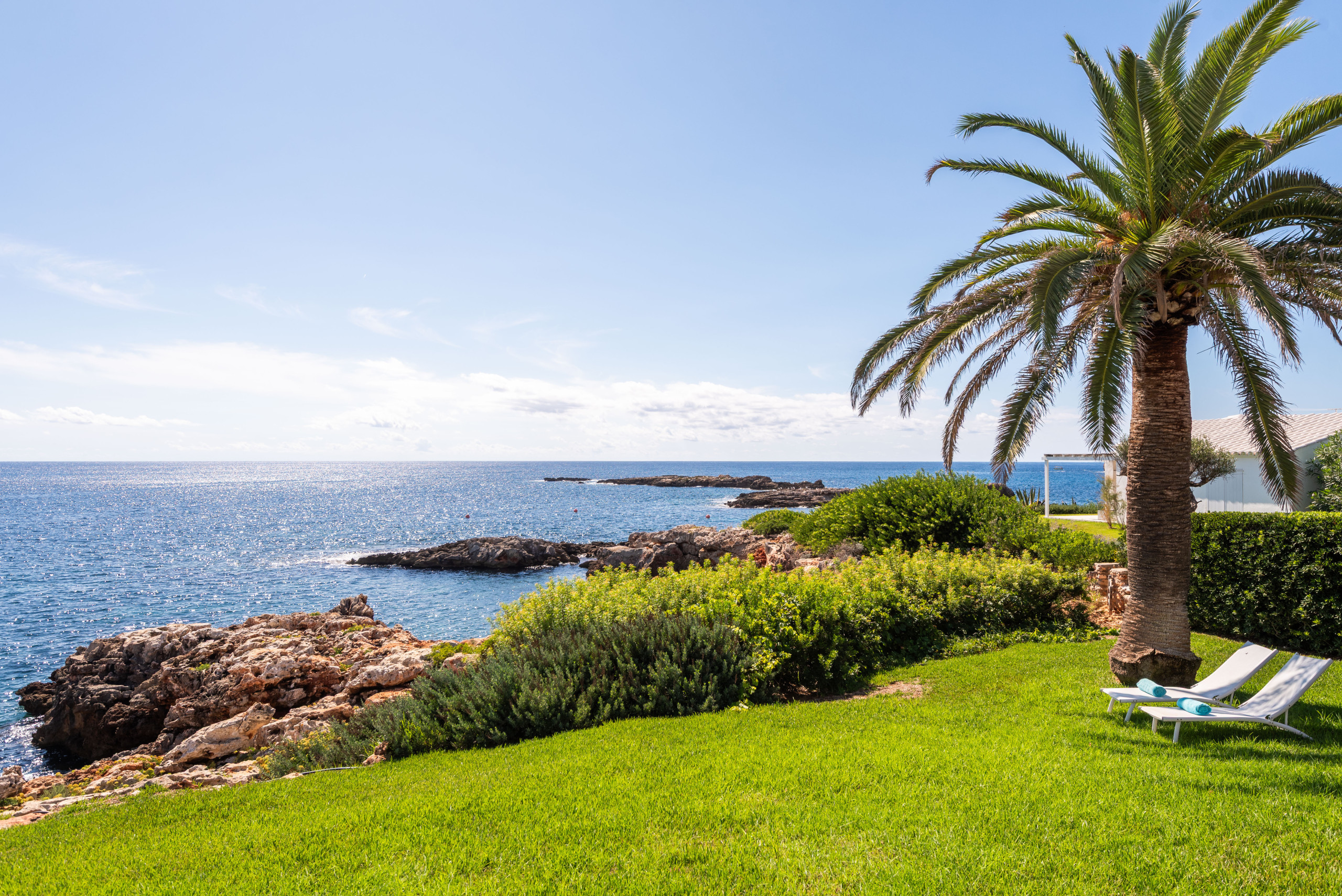 Der Garten hat Rasen bis zu den Felsen, die zum Meer führen, wo man über einige Stufen die kristallklaren Gewässer erreichen kann. Es gibt zwei große überdachte Terrassen mit Sofa, Stühlen und einem Tisch zum Essen oder Entspannen. Von dort aus kann man einen wunderbaren Blick auf die offene See genießen.