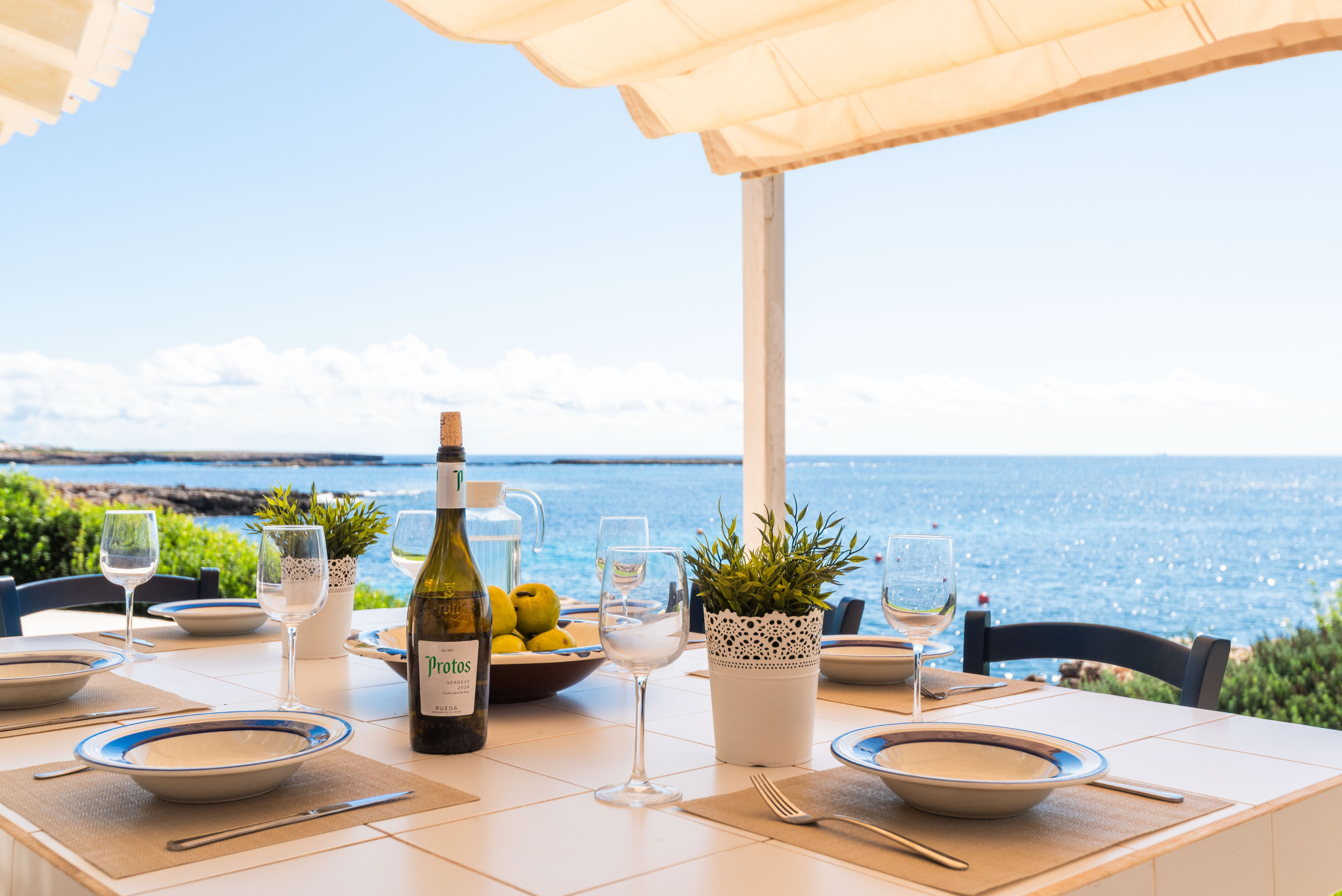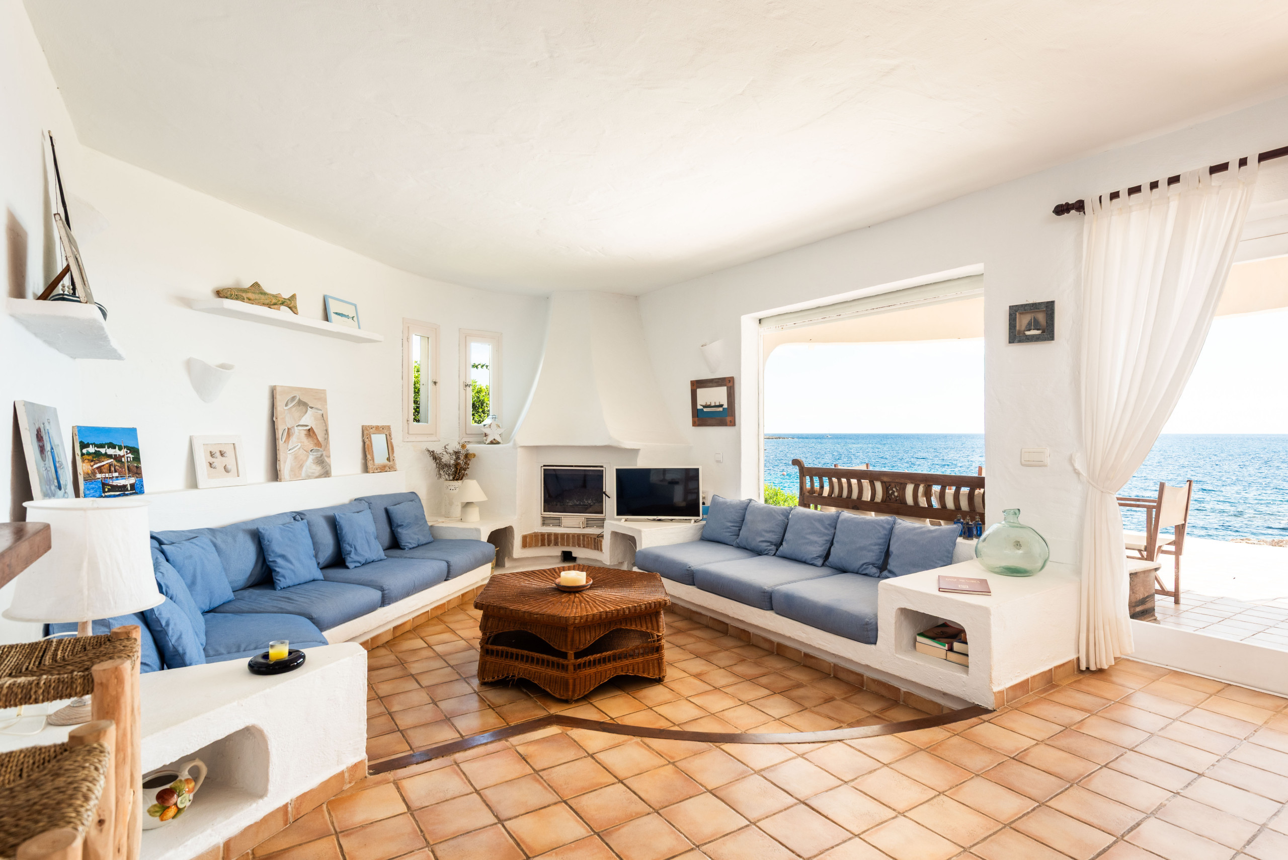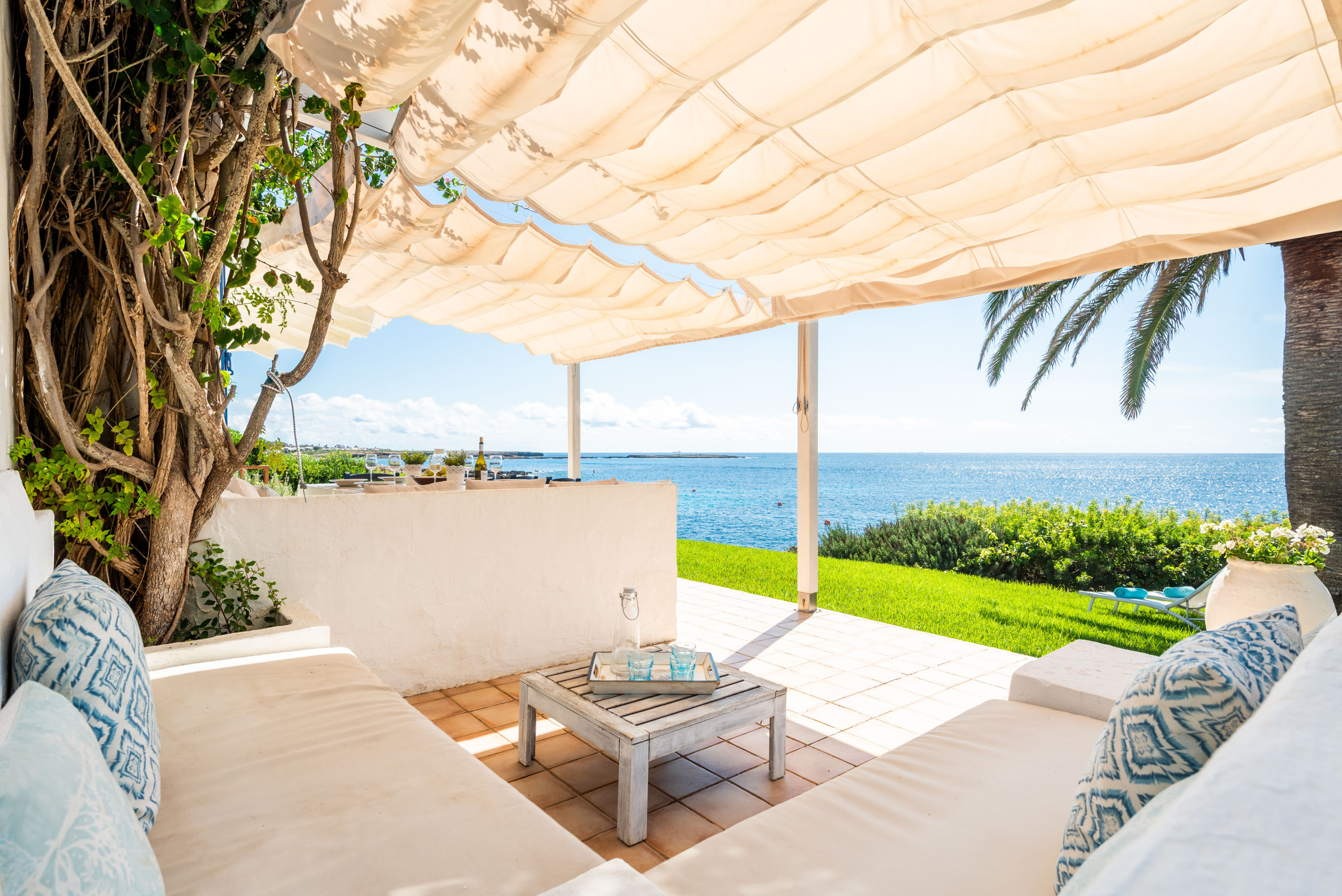 Der Garten hat Rasen bis zu den Felsen, die zum Meer führen, wo man über einige Stufen die kristallklaren Gewässer erreichen kann. Es gibt zwei große überdachte Terrassen mit Sofa, Stühlen und einem Tisch zum Essen oder Entspannen. Von dort aus kann man einen wunderbaren Blick auf die offene See genießen.