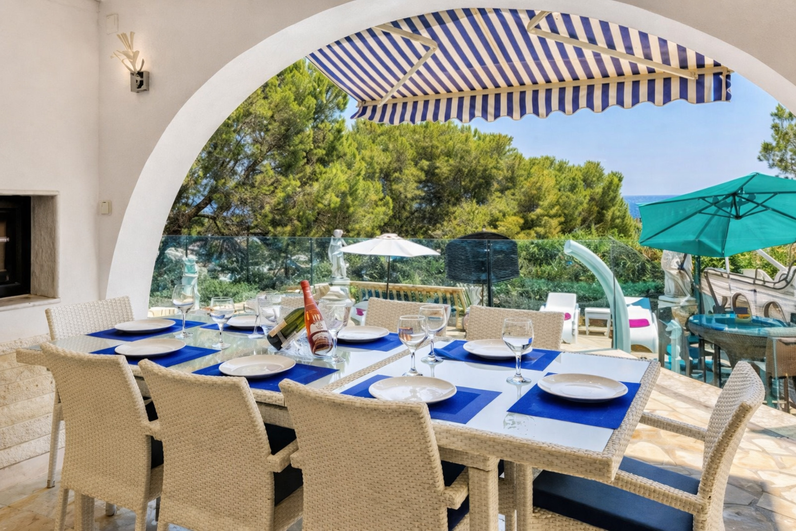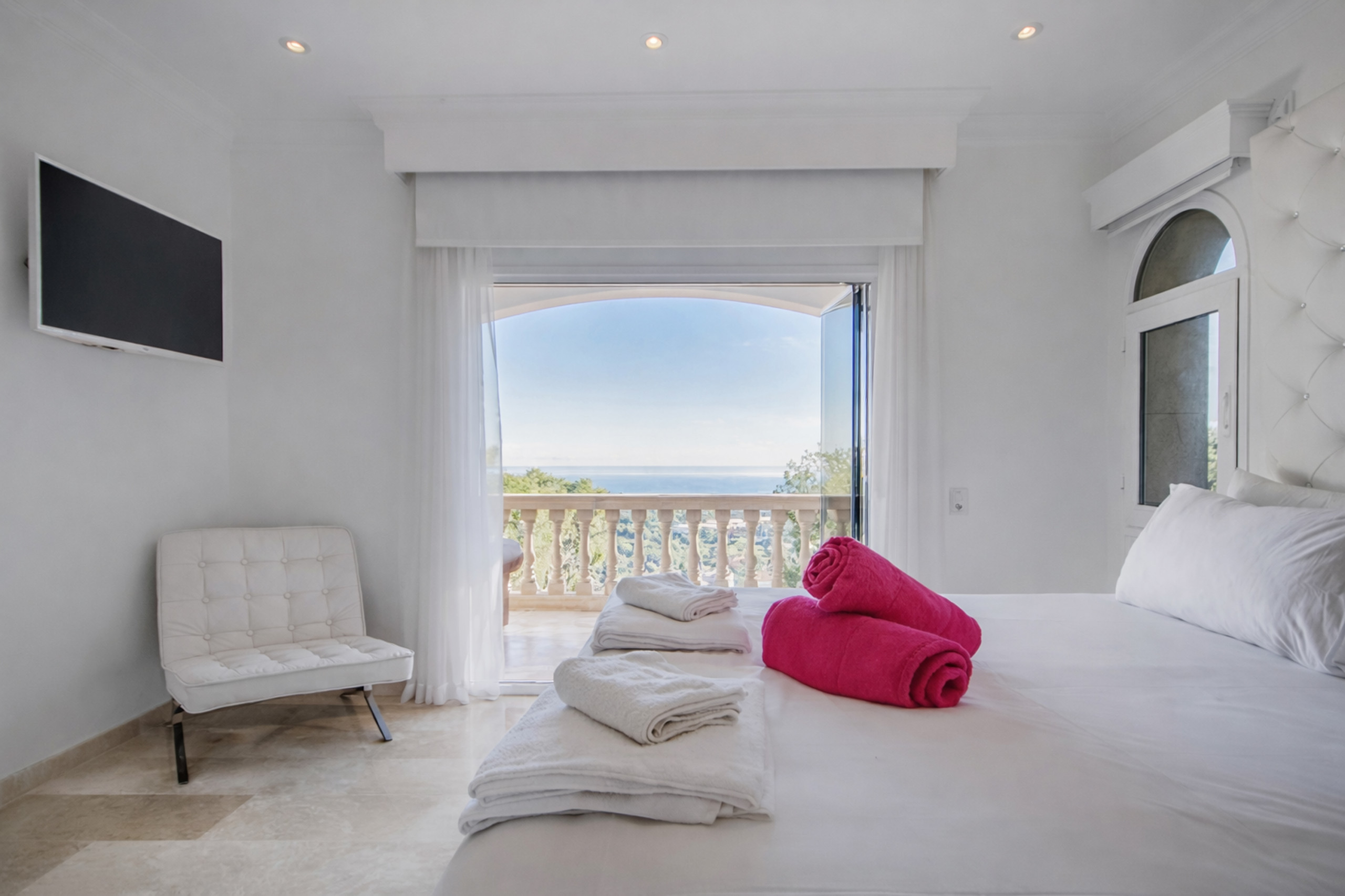 Die Wohnung verteilt sich auf geräumige und lichtdurchflutete Räume, mit einer Architektur, die darauf ausgelegt ist, natürliches Licht und die Verbindung zur Außenwelt maximal zu nutzen. Sie verfügt über fünf Schlafzimmer, vier davon mit Doppelbett und eines mit Etagenbetten, was eine vielseitige und funktionale Verteilung für verschiedene Arten von Gästen bietet. Die Gemeinschaftsbereiche zeichnen sich durch Eleganz und Komfort aus, mit einem großzügigen Wohnzimmer, das sich zu den Außenterrassen öffnet, und einer voll ausgestatteten Küche, die perfekt ist, um entspannte Frühstücke oder lange Abendessen zu teilen. Im Außenbereich bietet die Villa einen privaten Pool, umgeben von Ruhezonen, Liegen und Bereichen, die zum Genießen der Außenluft einladen, begleitet von angenehmen Meerblicken und einer Atmosphäre, die dazu einlädt, jeden Moment zu verlängern.