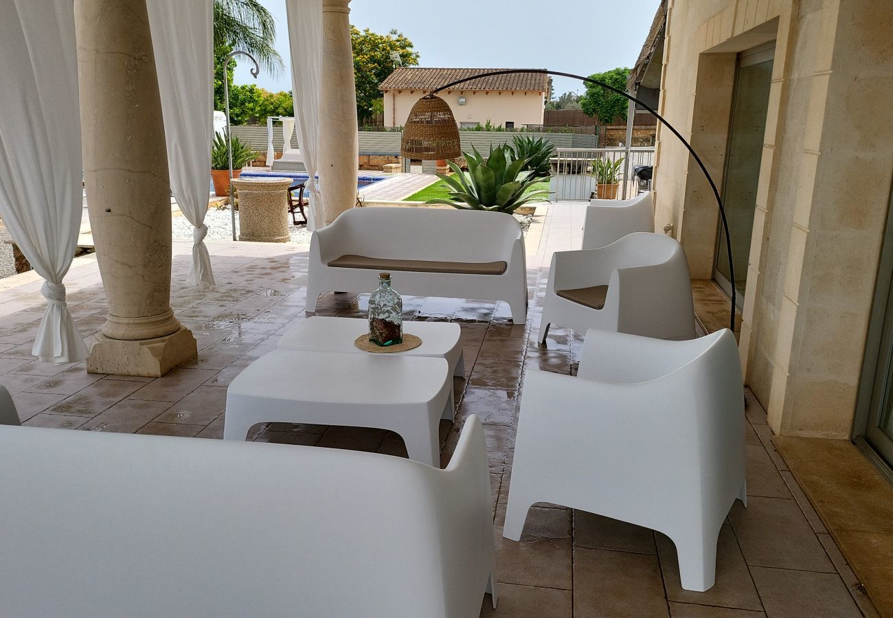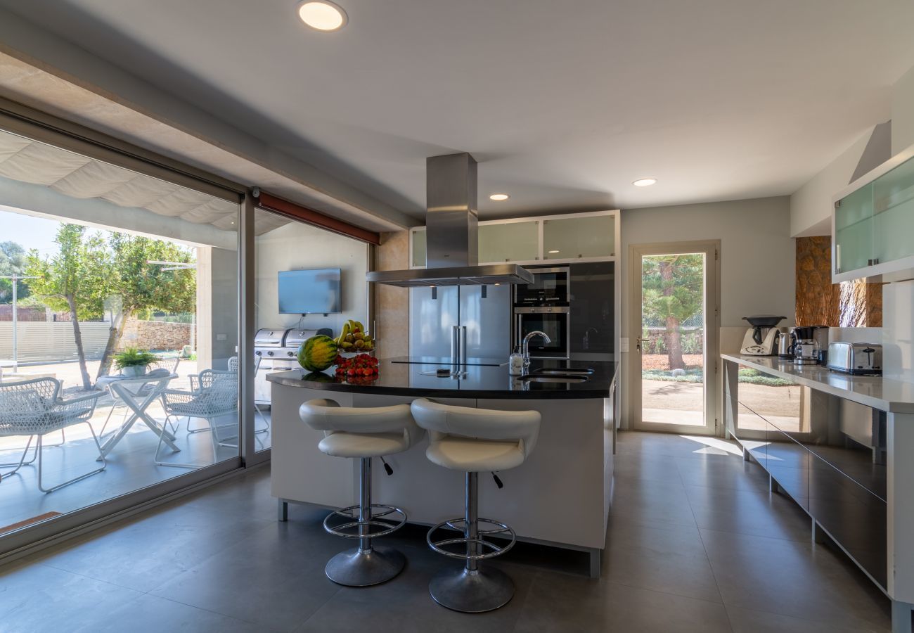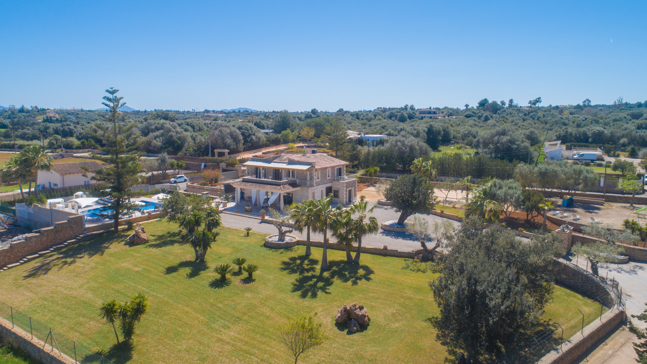 5StarsHome, der führende Anbieter von Ferienvermietungen auf Mallorca und Ibiza, bietet Ihnen diese prächtige Villa auf einem weitläufigen Grundstück von 8.000 m² mit Oliven- und Palmenbäumen. Der gesamte Hof ist mit einem großen Stahltor umzäunt, das Zugang zu diesem vielfältigen Gartenparadies bietet. Zu den Annehmlichkeiten gehören grüne Rasenflächen, ein Kinderspielplatz, Beachvolleyball- und Fußballfelder, Tischtennis und ein riesiger Salzwasserpool (10m x 12m) mit Liegestühlen, Sonnenschirmen, einer Außendusche und einem Chill-out-Bereich unter einem mediterranen Sonnensegel. Das Haus bietet eine geräumige, überdachte Terrasse mit bequemen Gartenmöbeln, perfekt für Familienessen am langen Tisch.