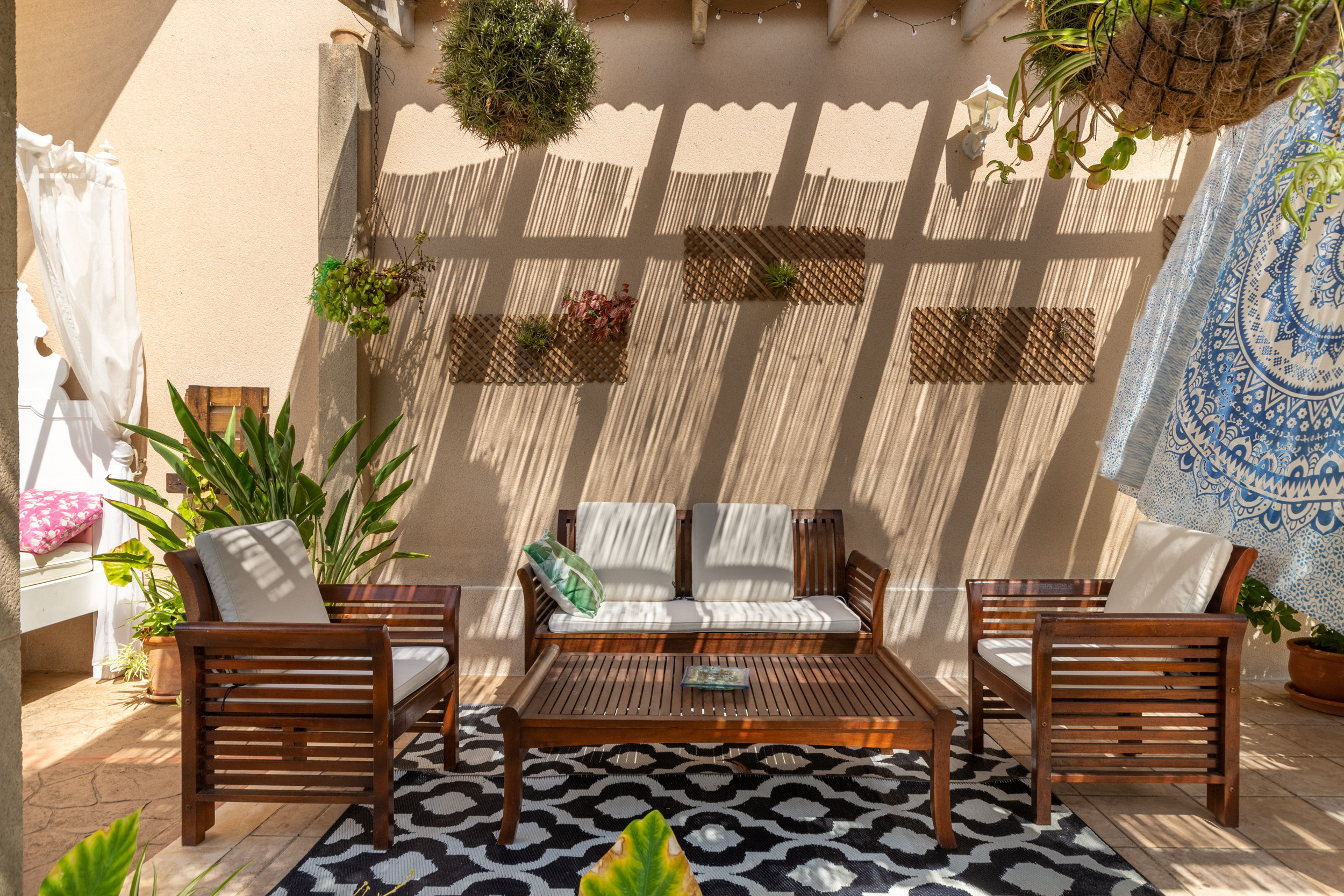 Geräumige Terrasse mit bequemer Möblierung, Grill, Sonnenliegen und Bereichen im Schatten und in der Sonne nach Ihren Vorlieben.
