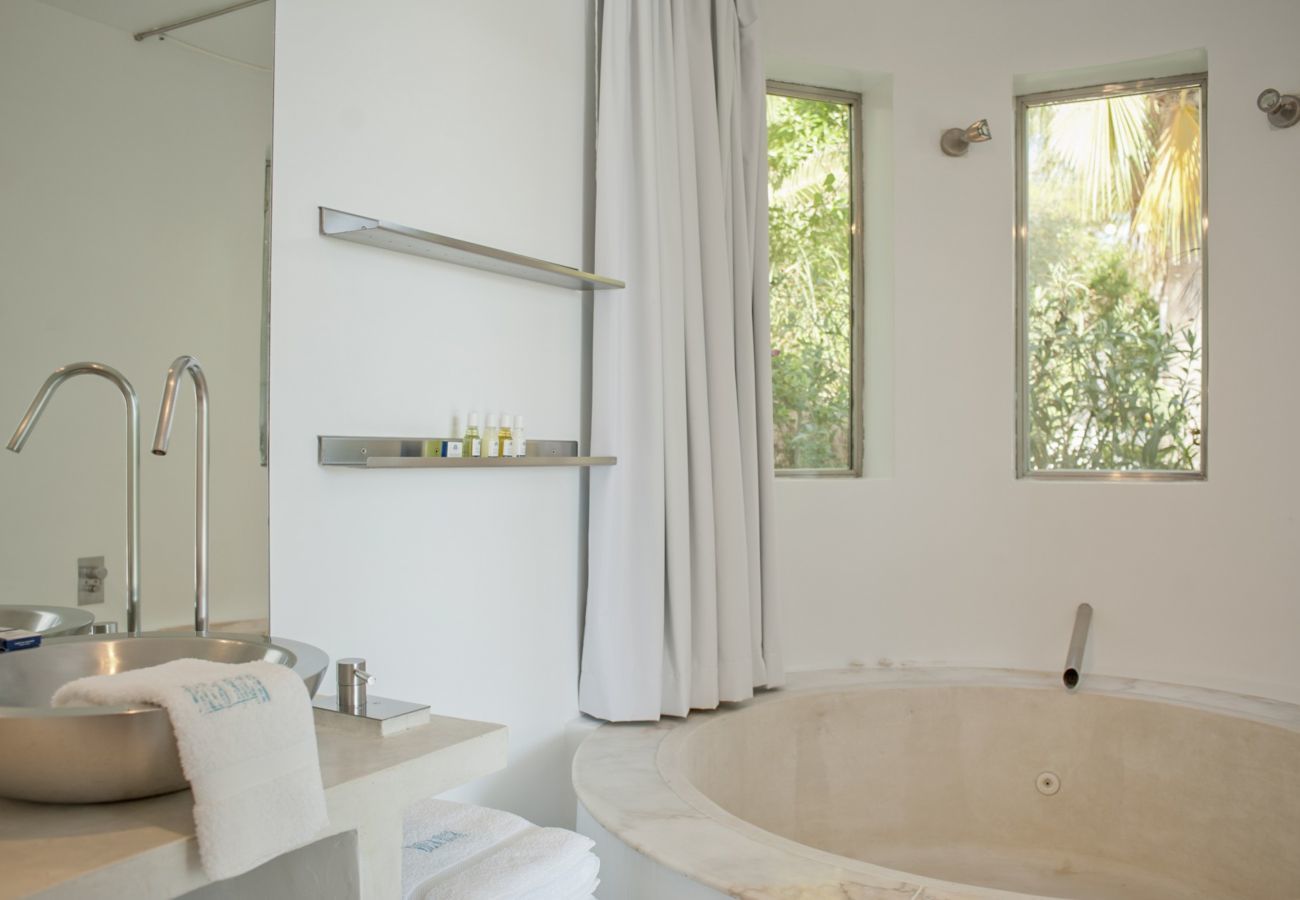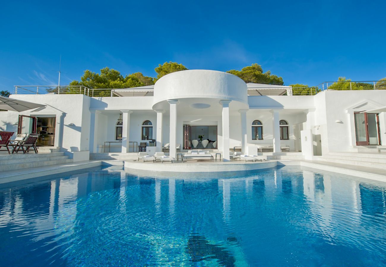 Diese beeindruckende Villa mit Panoramablick auf die idyllische Bucht von Cala Jondal bietet großzügige Außenbereiche und ein elegantes Haus, das bequem Platz für bis zu 10 Personen bietet. Die fünf Doppel-Suiten sind mit privaten Badezimmern, Klimaanlage, Flachbildfernsehern mit Satellitenanschluss, Bose-Soundsystem und Minibar ausgestattet und sorgen für höchsten Komfort und maximale Privatsphäre. Das moderne, zeitlose Design überzeugt mit lichtdurchfluteten Innenräumen, strahlend weißen Wänden und stilvollen Details, die das mediterrane Flair perfekt unterstreichen. Im Innenbereich erwartet Sie ein offener Wohnbereich mit direktem Zugang zum beheizten Pool mit Blick auf das Mittelmeer. Im Außenbereich laden gepflegte Gärten, sonnige Terrassen und ein Jacuzzi zum Entspannen ein. Besondere Highlights der Villa sind ein Spa-Bereich mit Dampfbad, Sauna, privatem Fitnessraum und ein Unterwasser-Nachtclub mit Blick auf den Pool – für einen Aufenthalt, der unvergesslich bleibt.