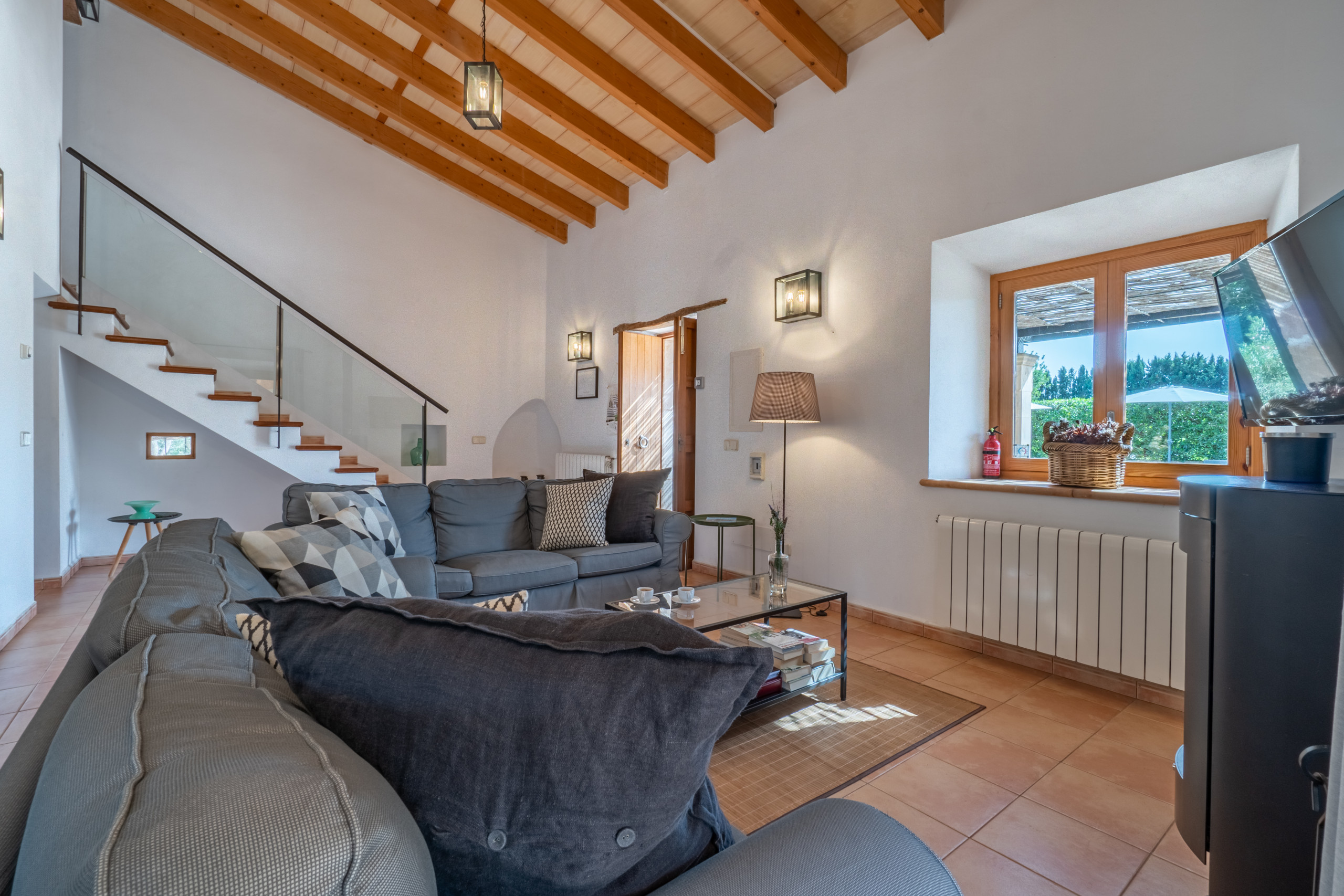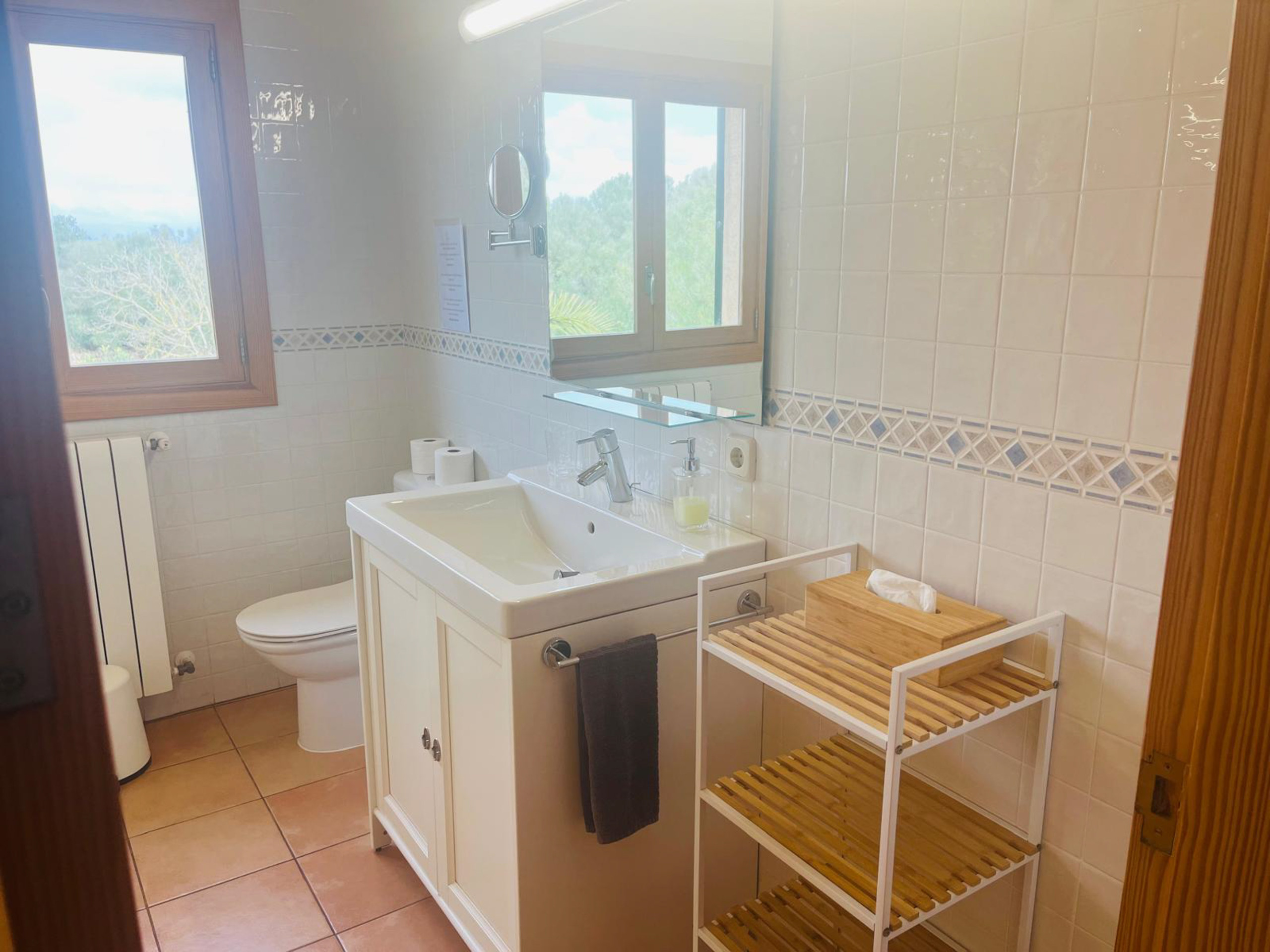 Die Villa, die auf einem Grundstück von 7.000 m² errichtet wurde, verfügt über 130 m², verteilt auf zwei Etagen. Im Erdgeschoss befinden sich zwei Doppelschlafzimmer, ein vollständiges Badezimmer mit Badewanne, ein geräumiges Wohnzimmer mit Kamin und Sitzbereich, ein Esszimmer mit direktem Zugang zur separaten Küche und Ausgang zur Veranda, perfekt für Mahlzeiten im Freien. Die obere Etage beherbergt ein Hauptschlafzimmer mit eigenem Badezimmer und Badewanne sowie eine private Terrasse mit Blick auf die Serra de Tramuntana, ideal zum Genießen der mallorquinischen Sonnenuntergänge. Das Innere zeichnet sich durch sein modernes und helles Design aus, kombiniert mit einer gemütlichen und funktionalen Einrichtung.