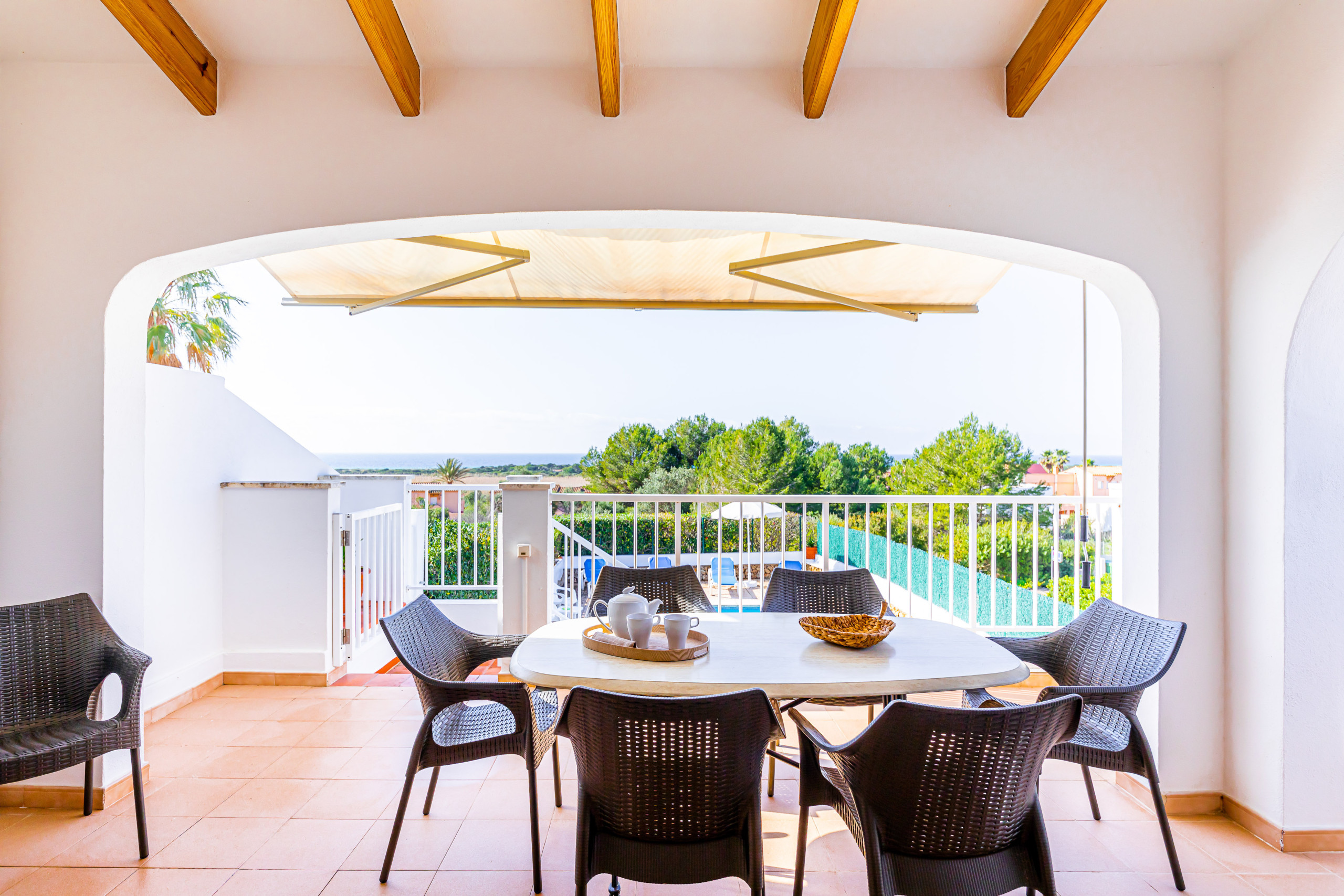 Überdachte Terrasse mit Tischtennisplatte und Meerblick.