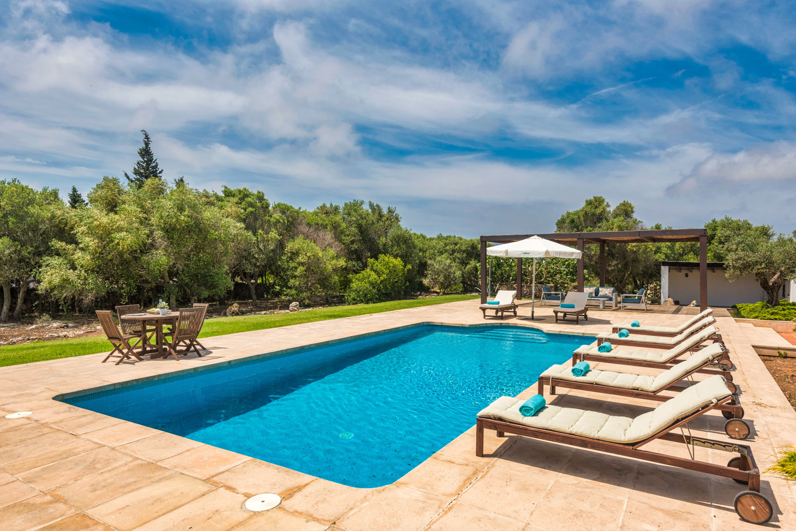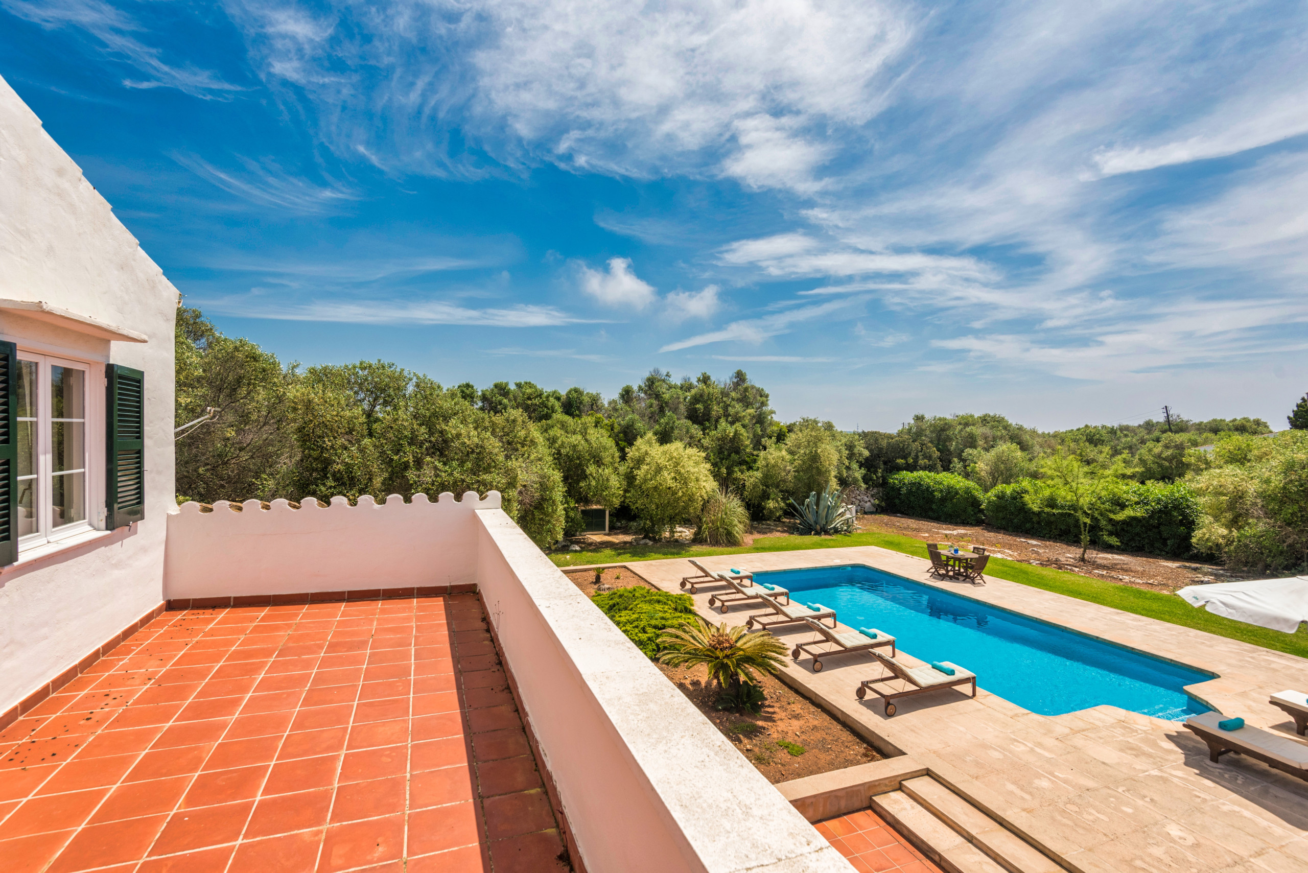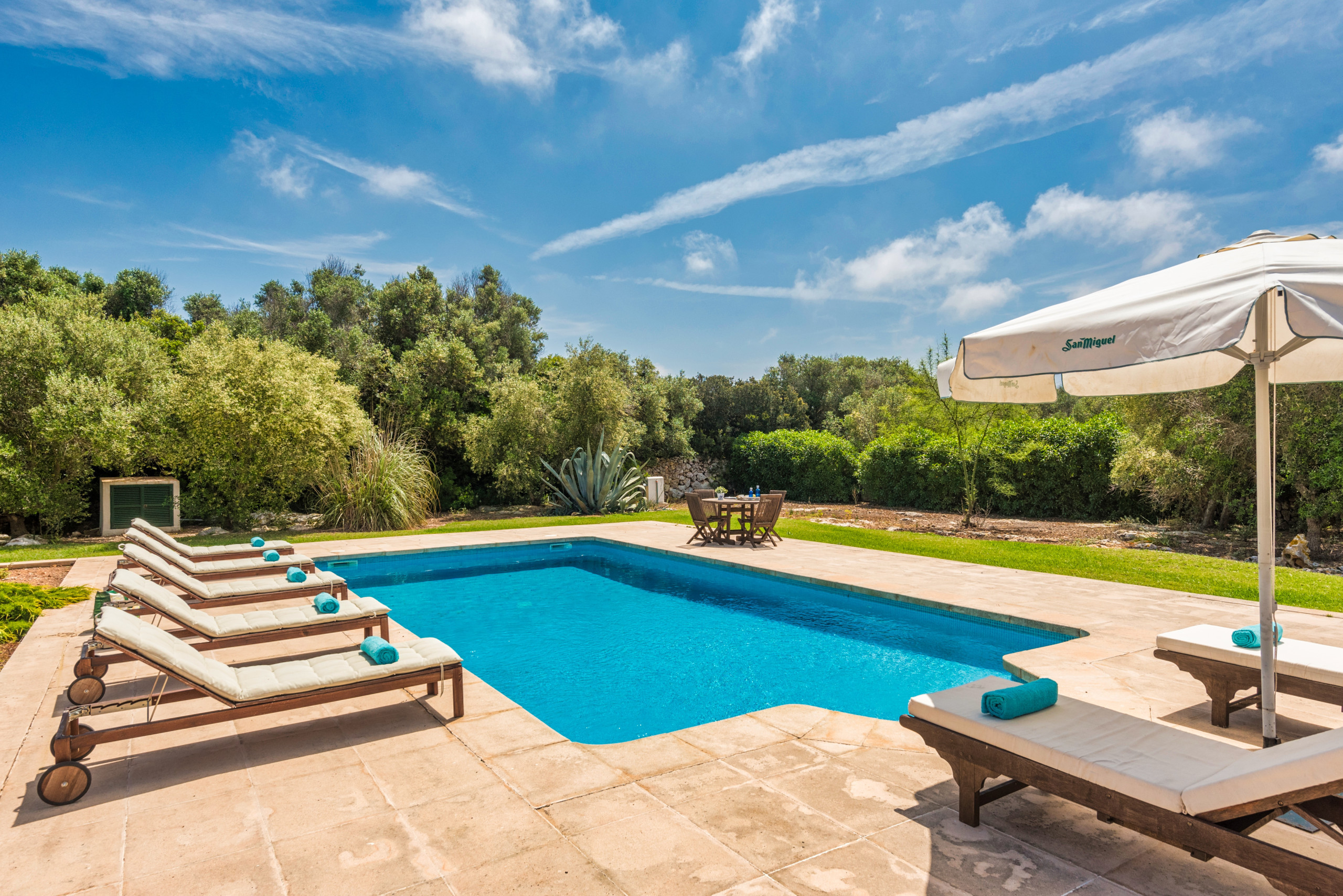 La dispone de un extenso jardín (8.000 m2) con zonas de césped y arbolado. La piscina de 10 x 5 metros tiene escaleras romanas. El exterior cuenta con un porche con mobiliario para comer al aire libre a la sombra, y adicionalmente, hay otro porche junto al típico horno de pan menorquín, con mobiliario para sentarse a leer o descansar.