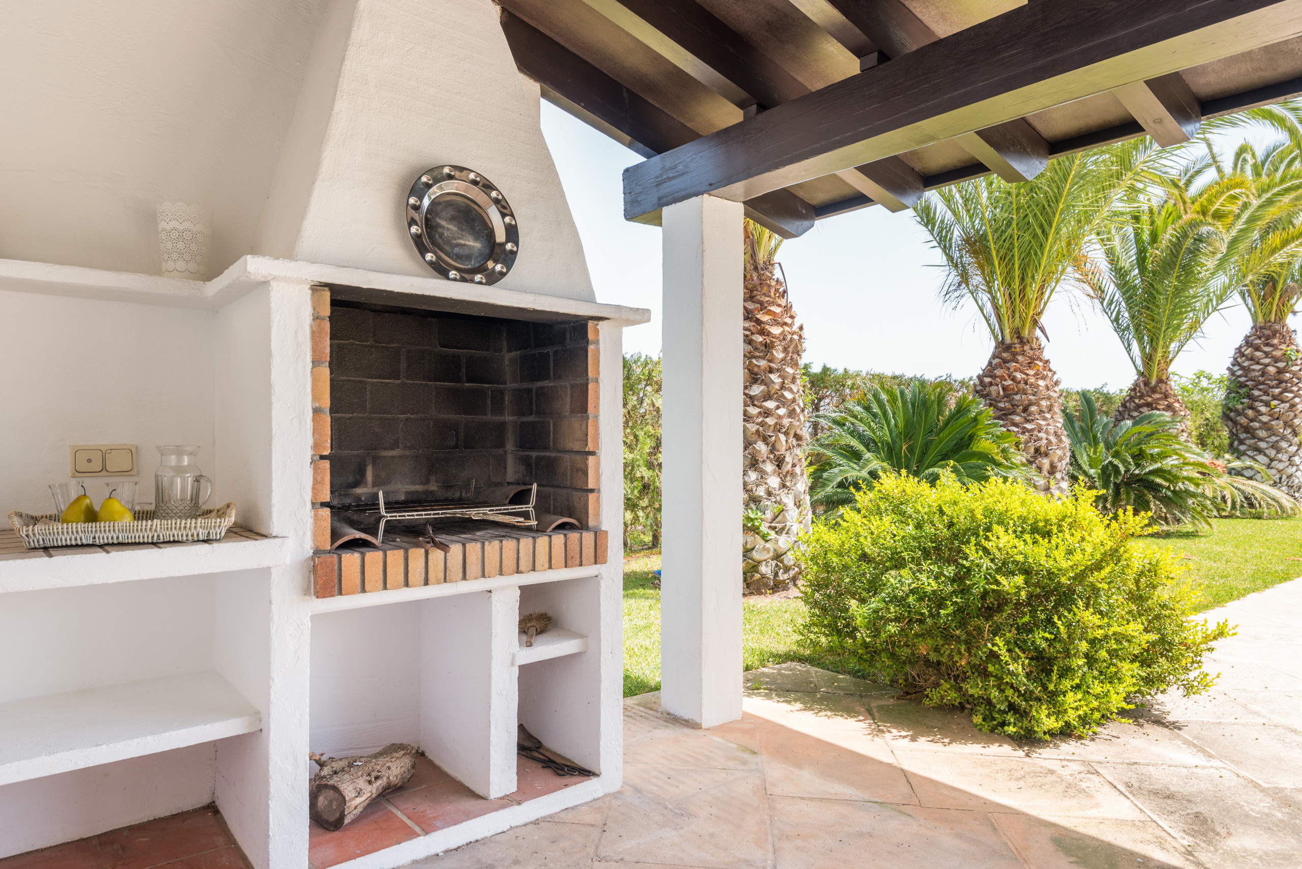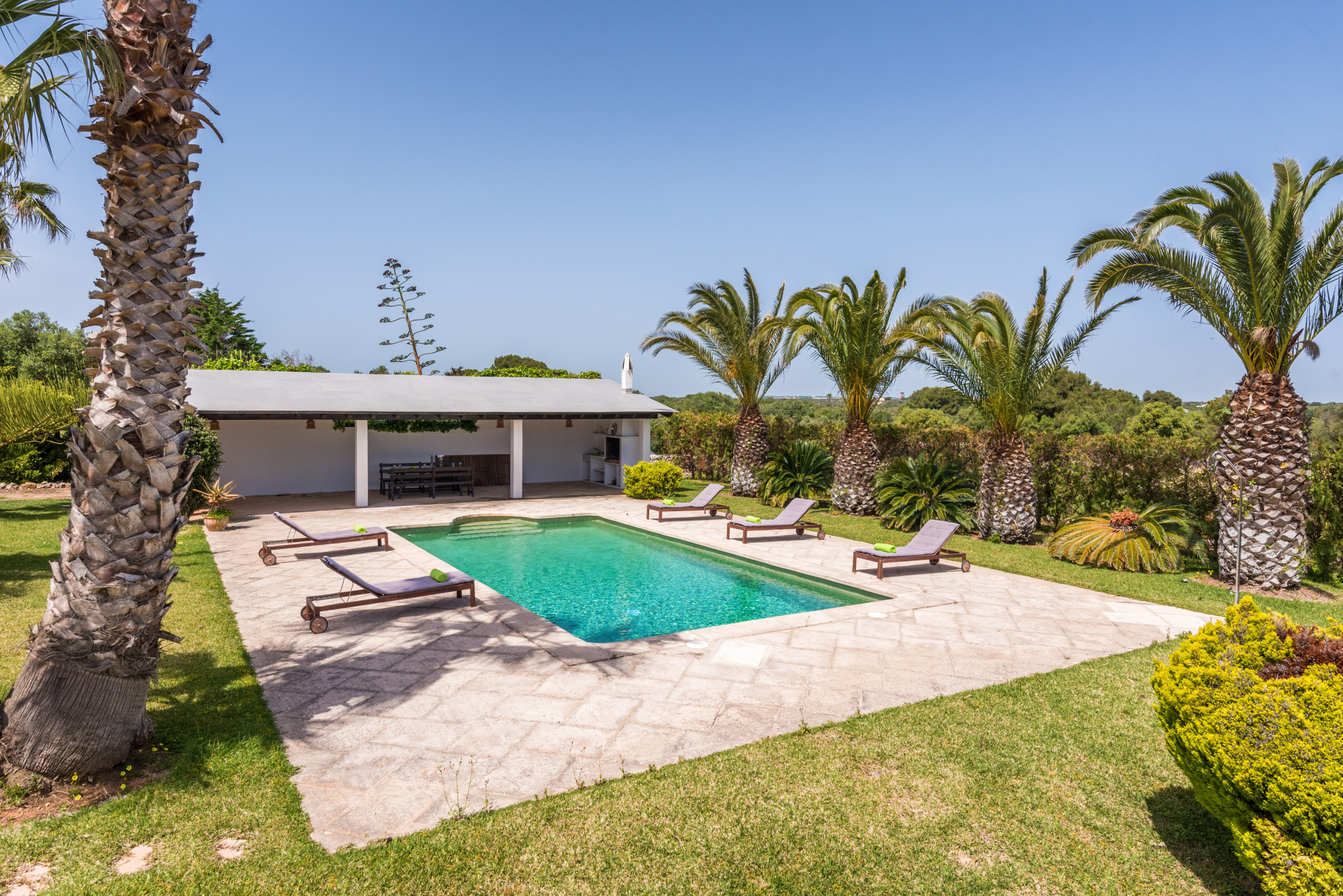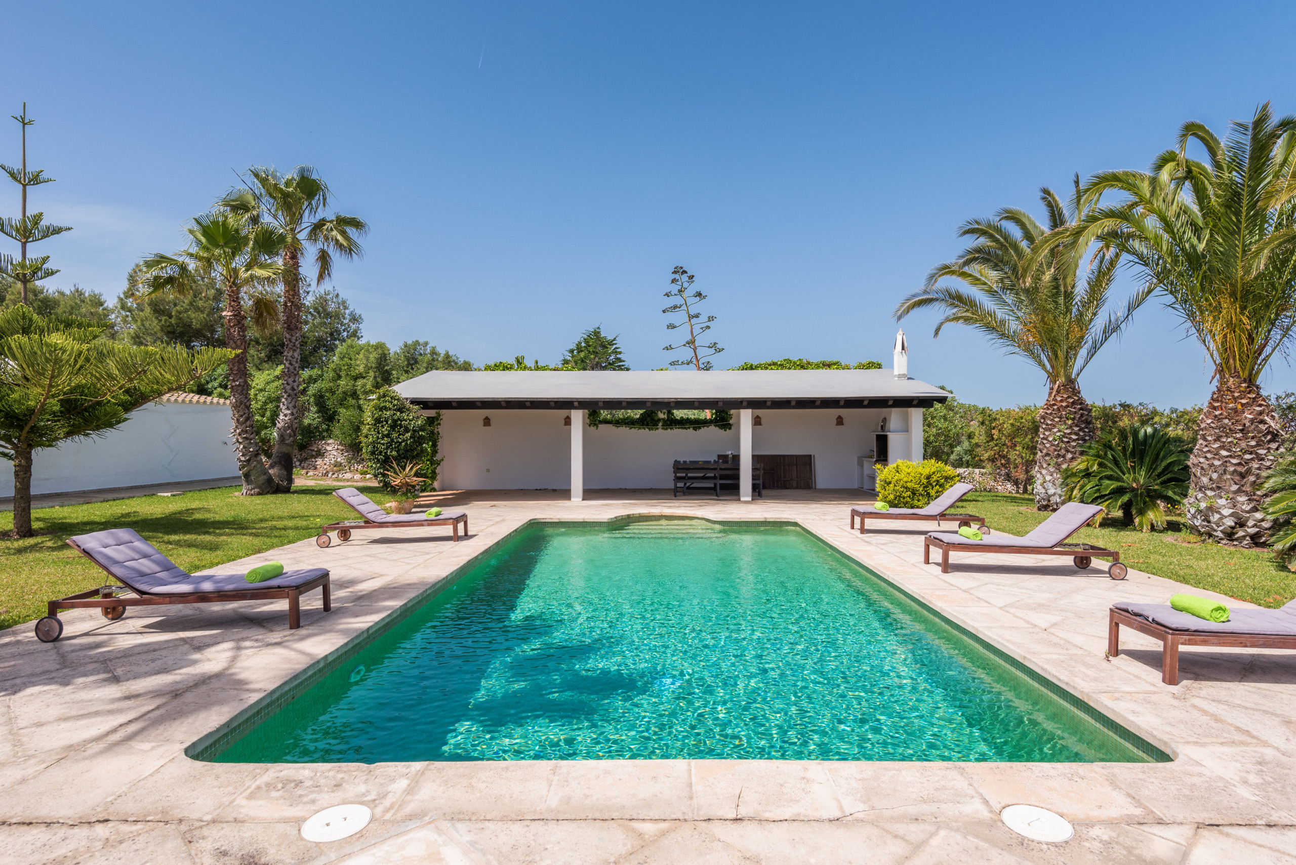La dispone de un extenso jardín (8.000 m2) con zonas de césped y arbolado. La piscina de 10 x 5 metros tiene escaleras romanas. El exterior cuenta con un porche con mobiliario para comer al aire libre a la sombra, y adicionalmente, hay otro porche junto al típico horno de pan menorquín, con mobiliario para sentarse a leer o descansar.