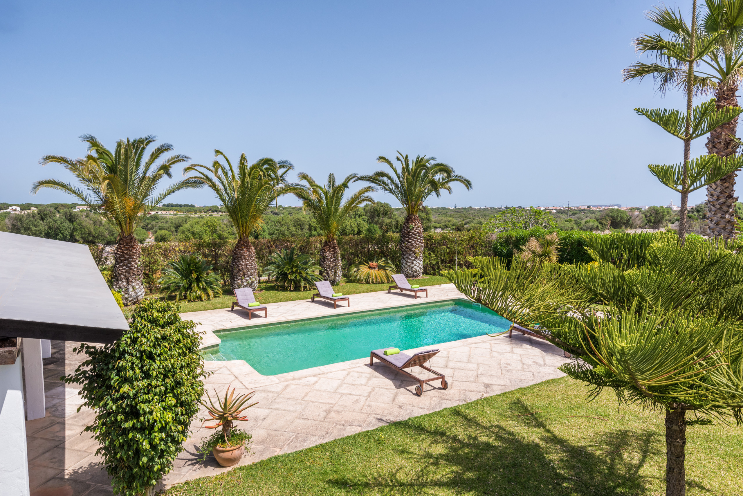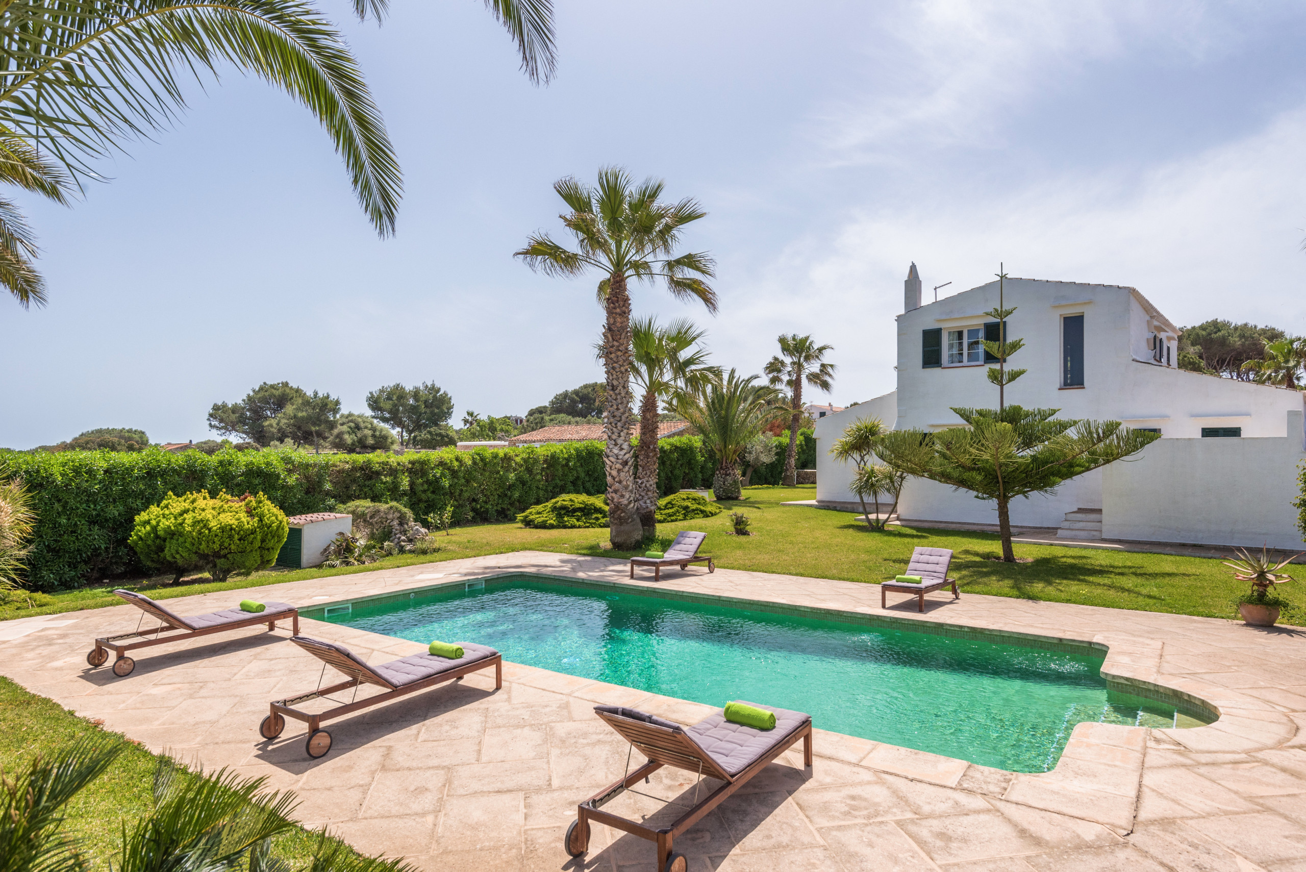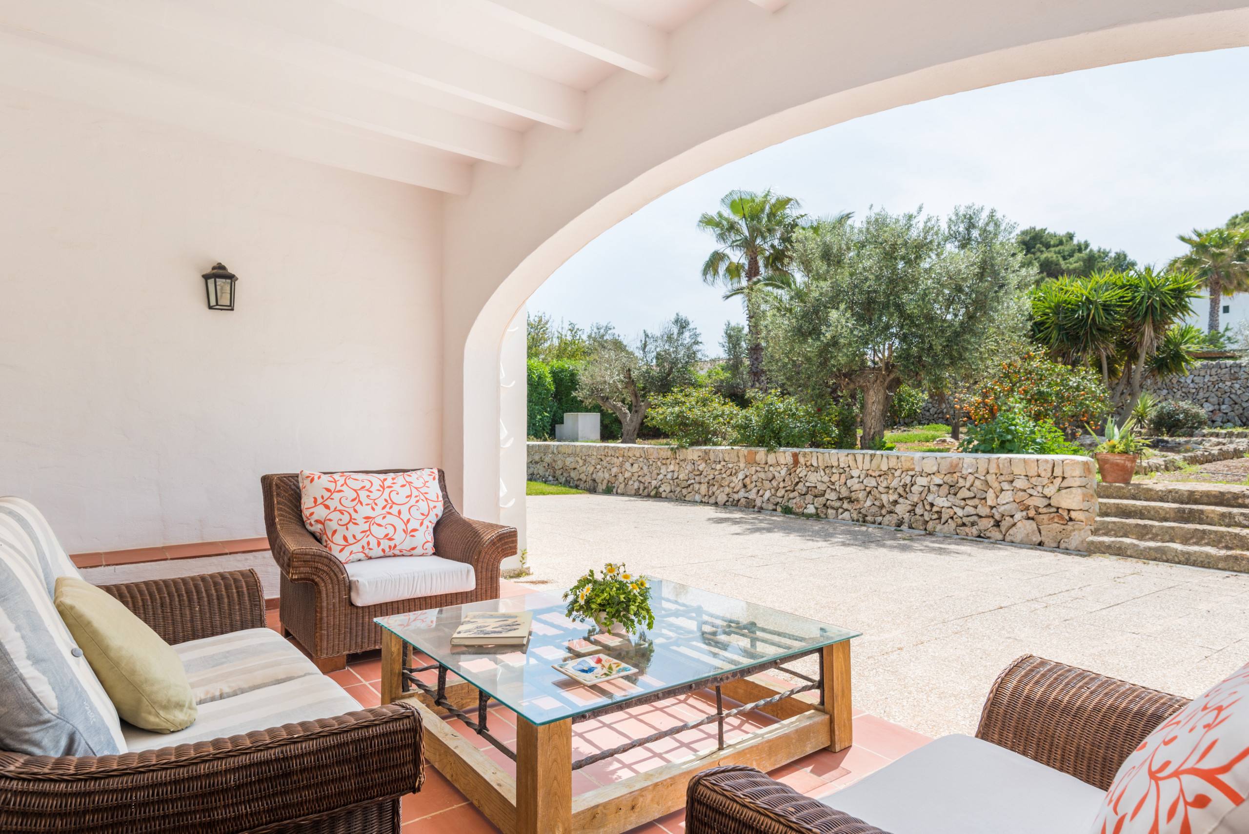 La dispone de un extenso jardín (8.000 m2) con zonas de césped y arbolado. La piscina de 10 x 5 metros tiene escaleras romanas. El exterior cuenta con un porche con mobiliario para comer al aire libre a la sombra, y adicionalmente, hay otro porche junto al típico horno de pan menorquín, con mobiliario para sentarse a leer o descansar.