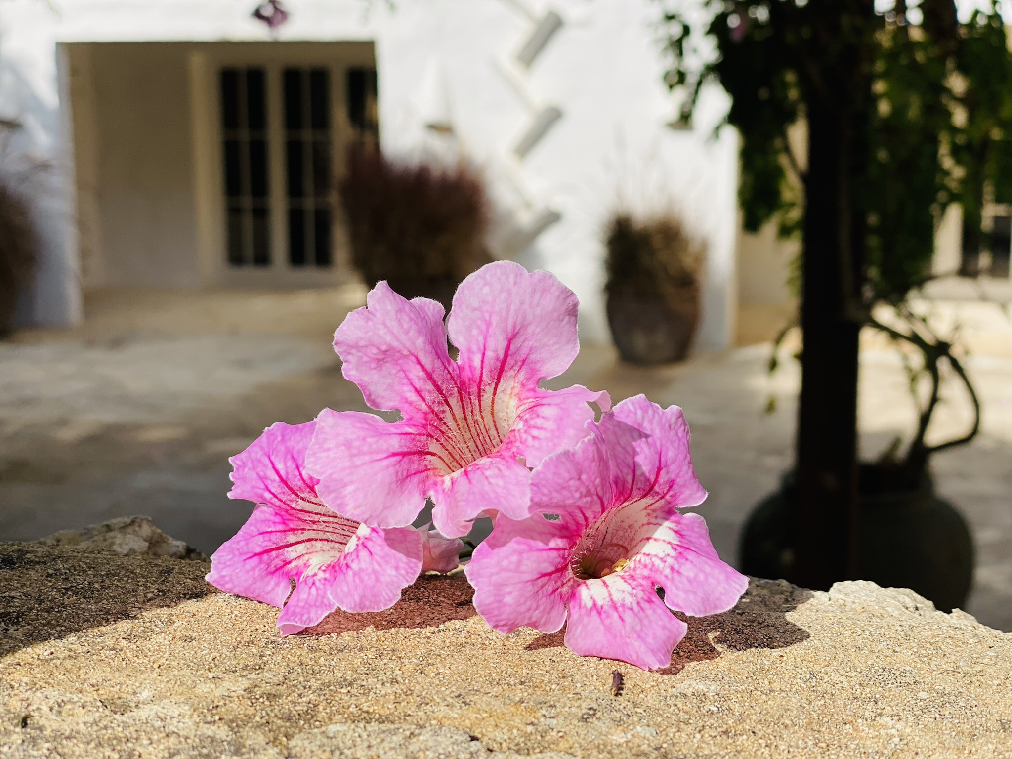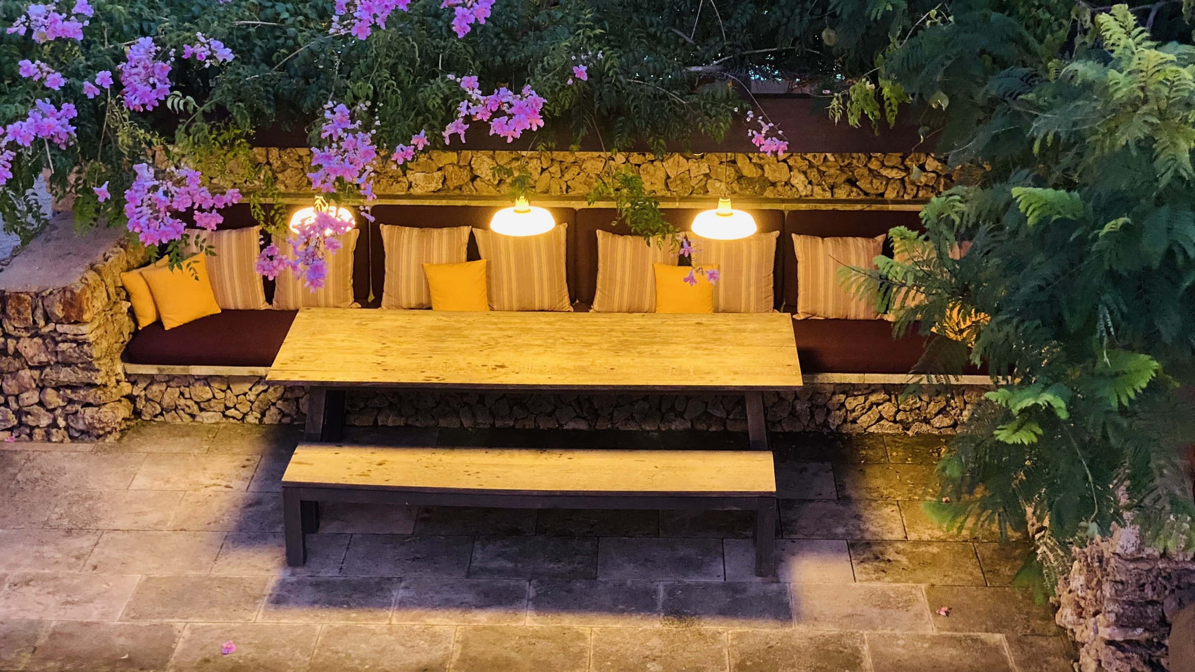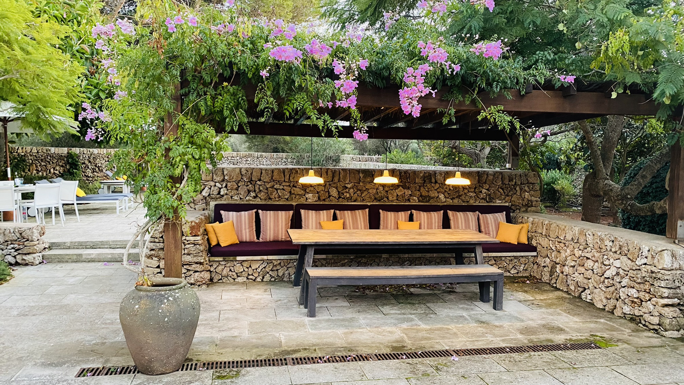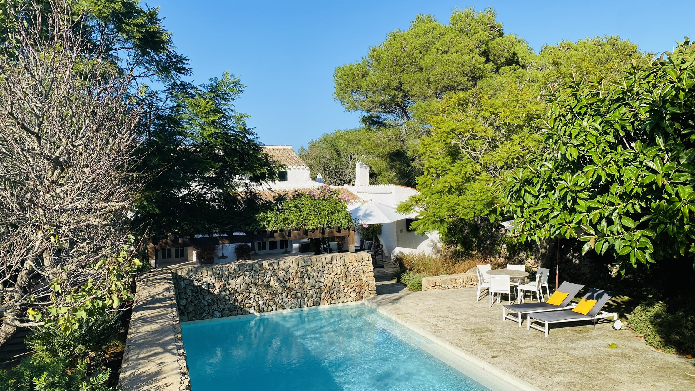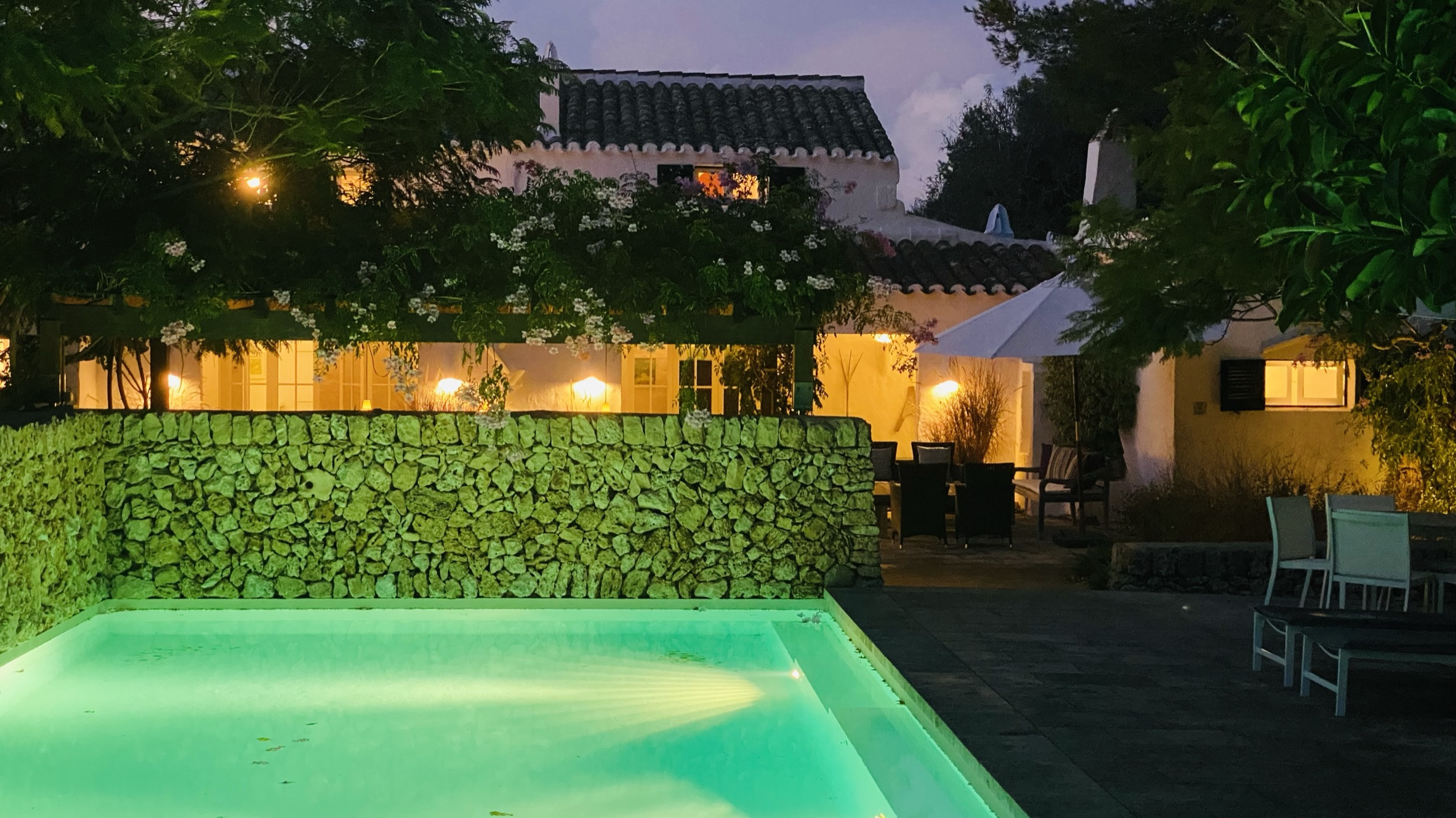 La propiedad cuenta con dos terrazas, una al lado de la piscina y la otra delante de la casa. La piscina, de diseño, tiene escaleras romanas en todo el lateral, y está rodeada de pared seca al otro. La terraza delante de la casa tiene una pérgola con una mesa y dos bancos de obra para comer al aire libre. El hall de entrada de la casa se puede convertir en un porche cubierto, abriendo las grandes puertas cristaleras.