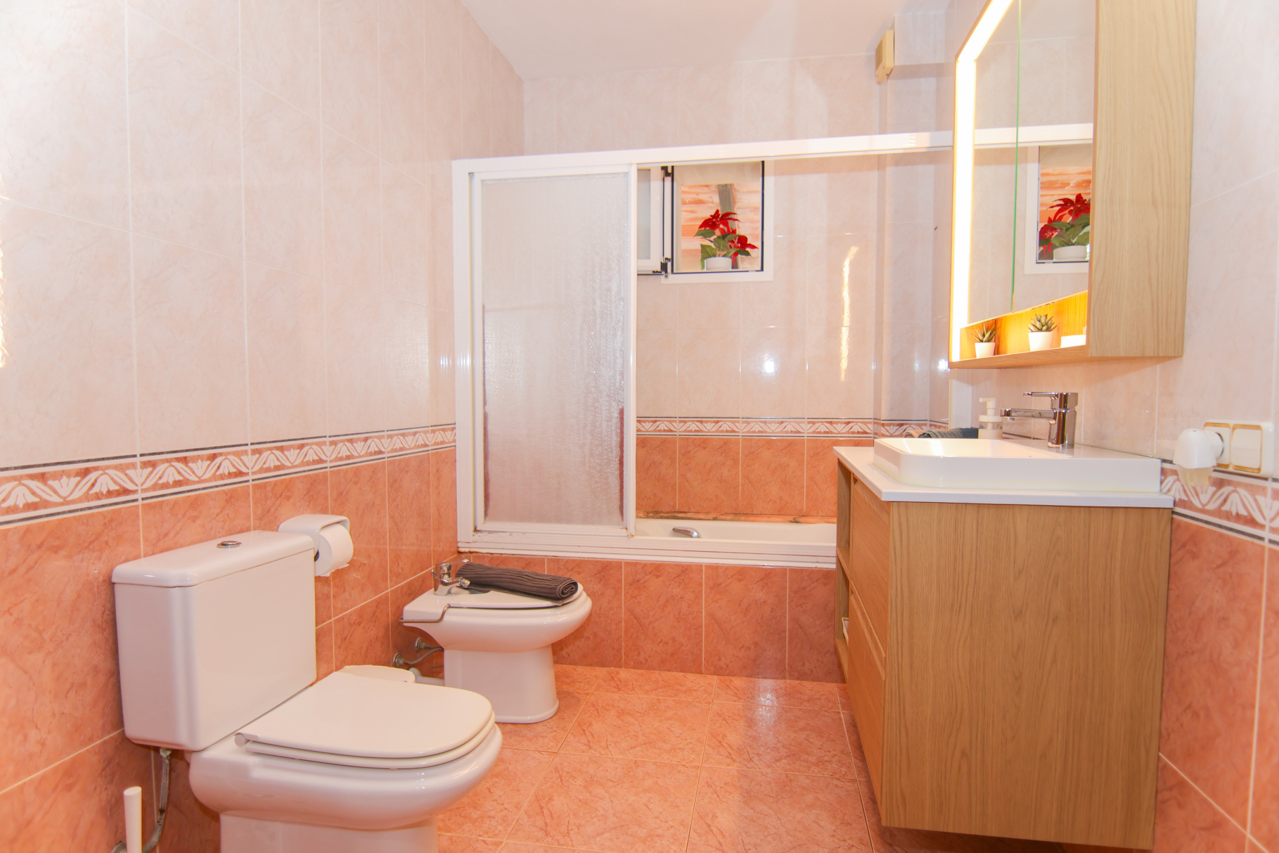 Hay tres dormitorios, uno con cama de matrimonio y dos con dos camas individuales y dos baños, uno con bañera y otro con ducha.