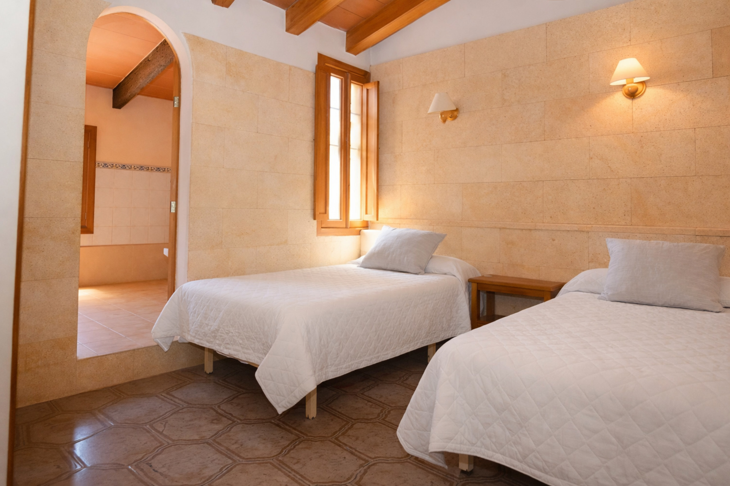 Hay cuatro dormitorios, todos con dos camas individuales, y dos baños, en la planta alta tres y un baño; La cuarta habitación y el segundo baño están en la planta baja.