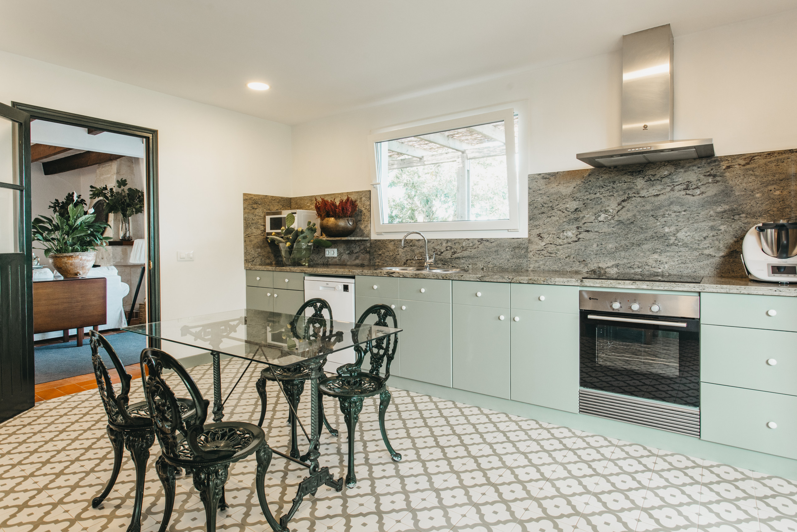 El interior está equipado con todas las comodidades modernas: WiFi de alta velocidad, televisión, plancha, chimenea para noches frías y una cocina totalmente equipada con electrodomésticos de última generación. Destacan elementos como lavadora, secadora, horno, microondas, cafetera y una amplia variedad de menaje de cocina que facilitará la preparación de deliciosas comidas.
