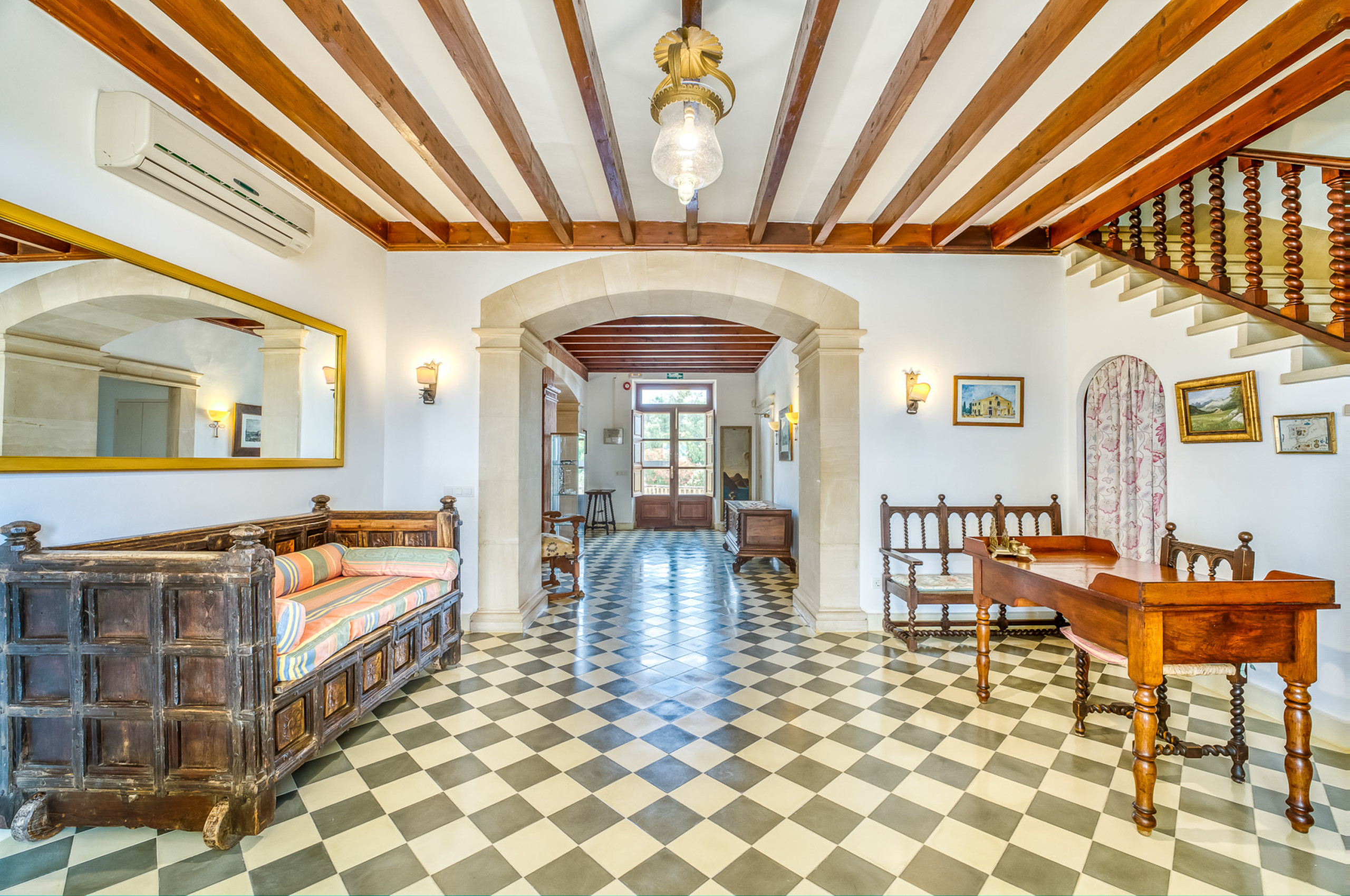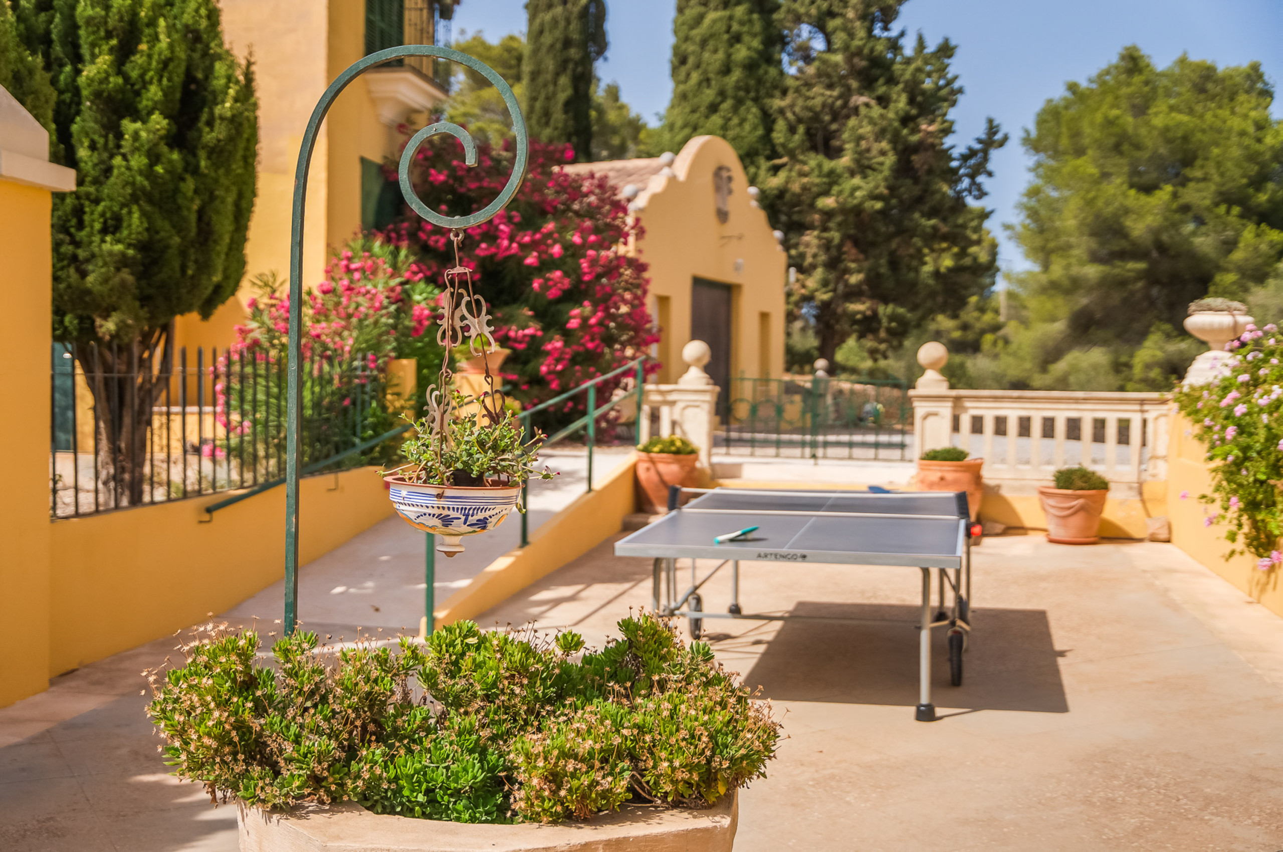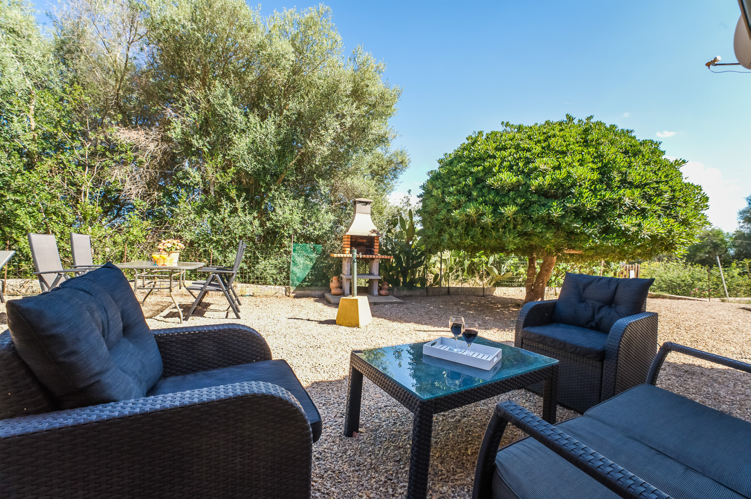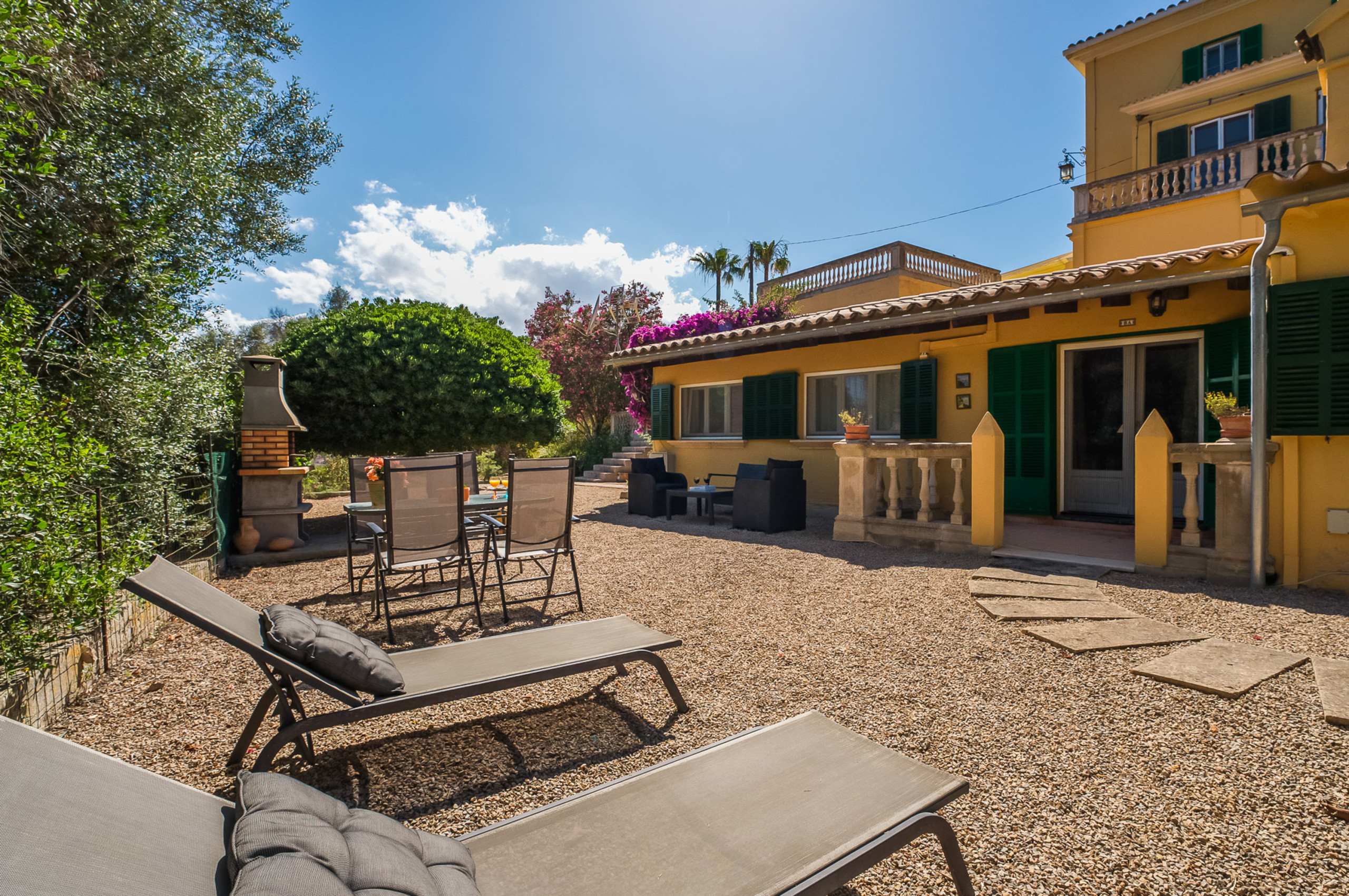 Las zonas exteriores están pensadas para aprovechar al máximo el privilegiado clima de Mallorca. Una amplia piscina se integra perfectamente en el entorno natural y ofrece agradables vistas al campo. Las terrazas espaciosas permiten tomar el sol con comodidad, mientras que las zonas de comedor exterior son ideales para desayunos relajados y largas cenas al aire libre. La barbacoa y la mesa de ping pong aportan un ambiente distendido, y la extensa parcela ofrece espacio suficiente para descansar y desconectar en plena naturaleza.