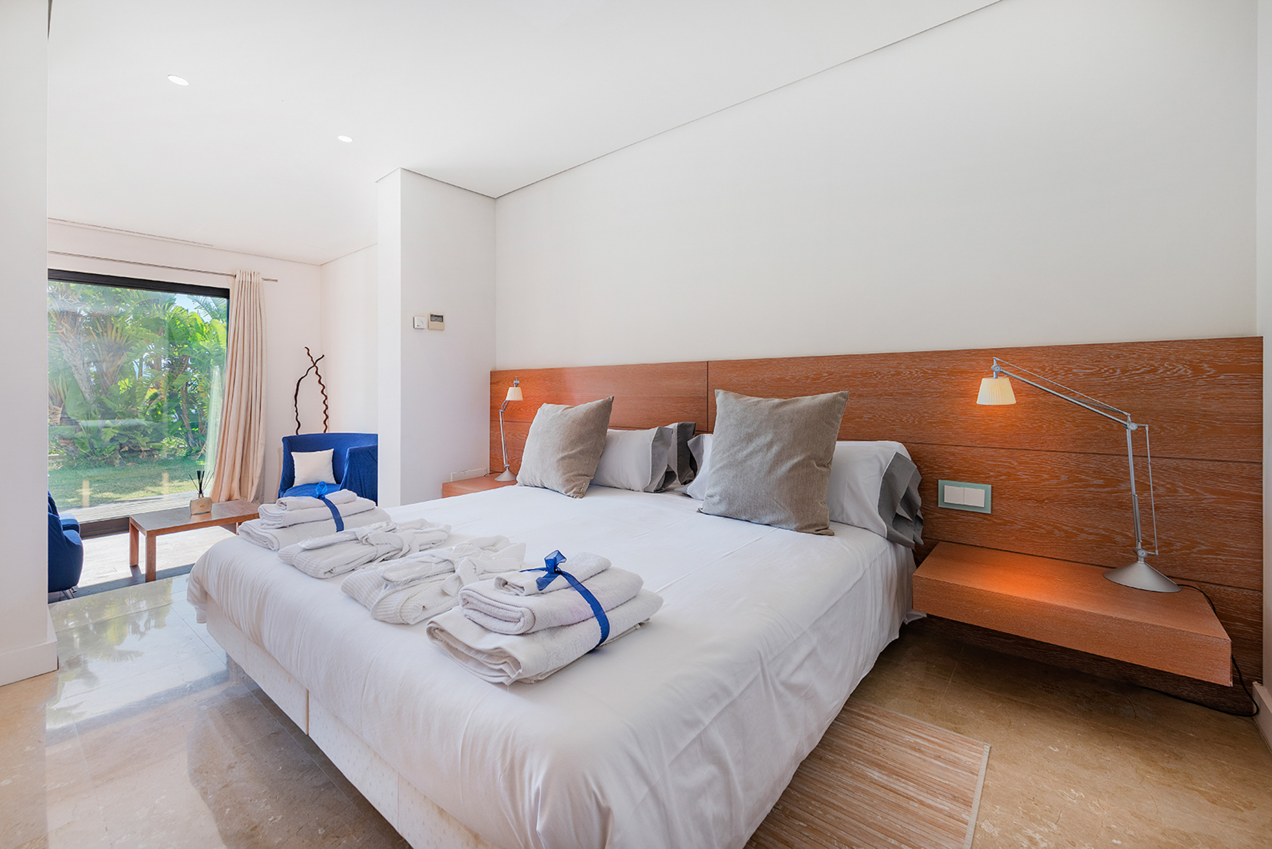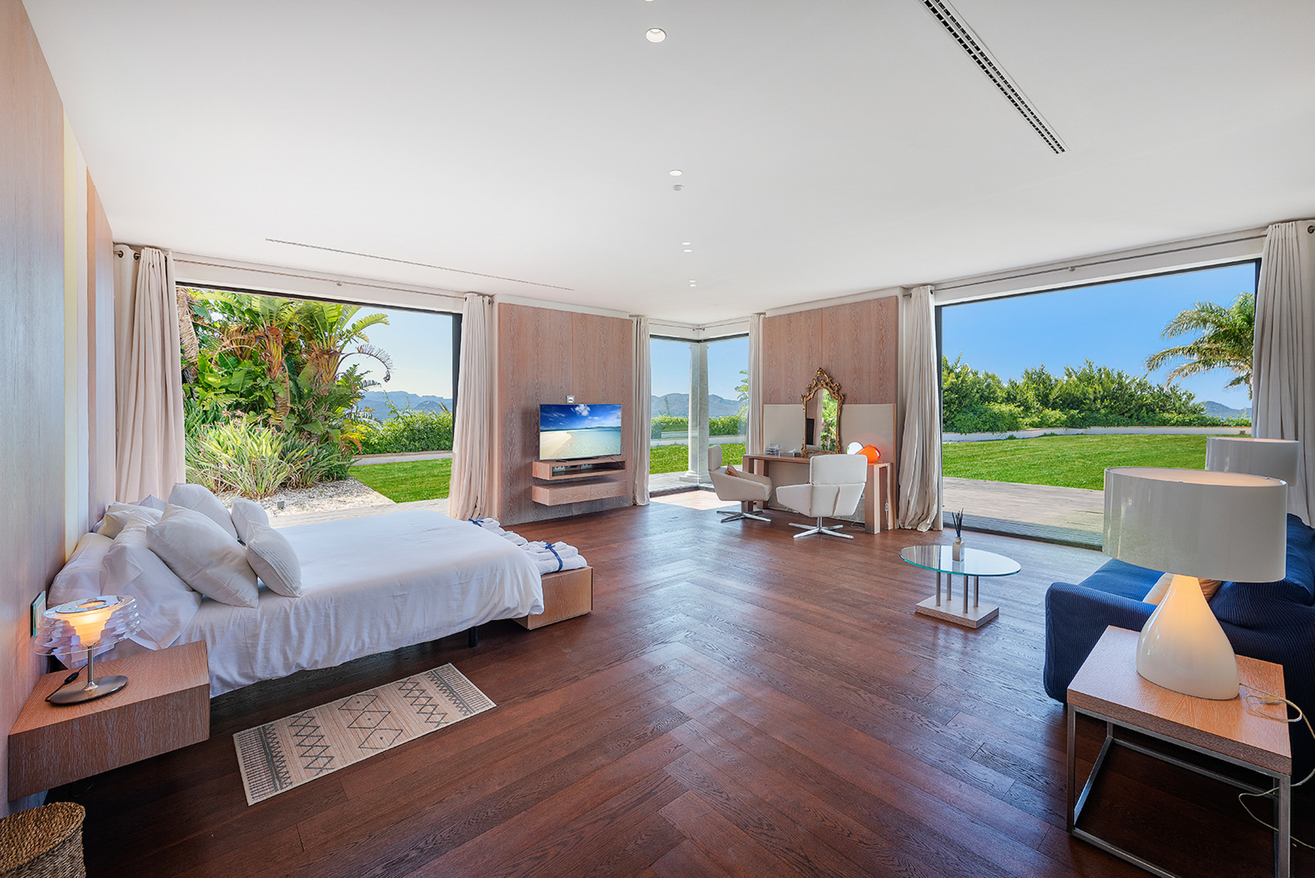 El gran interior de 200 m² está separado del jardín por 2 puertas de vidrio correderas gigantes. La elegante zona de vivir compartida se extiende por toda la planta baja. El acogedor rincón de TV se combina con el comedor y la cocina moderna con una gran sala de estar abierta. En la planta baja también hay 1 gran habitación doble y un baño. La otra area de dormir está instalada en la planta superior y consta de 4 dormitorios dobles modernos y 3 baños en mismo estilo (2 de ellos en suite). Todas las áreas de la casa están equipadas con aire acondicionado y muebles súper modernos. Mucha luz natural incidental crea un ambiente de vida positivo en toda la casa. A petición, ofreceremos cunas y tronas para nuestros huéspedes más pequeños. Por supuesto, Internet wifi gratis también es parte del equipamiento básico. Todo el mobiliario es de muy alta calidad y muy comfortable, ideal para unas vacaciones relajantes que prometen el descanso deseado...