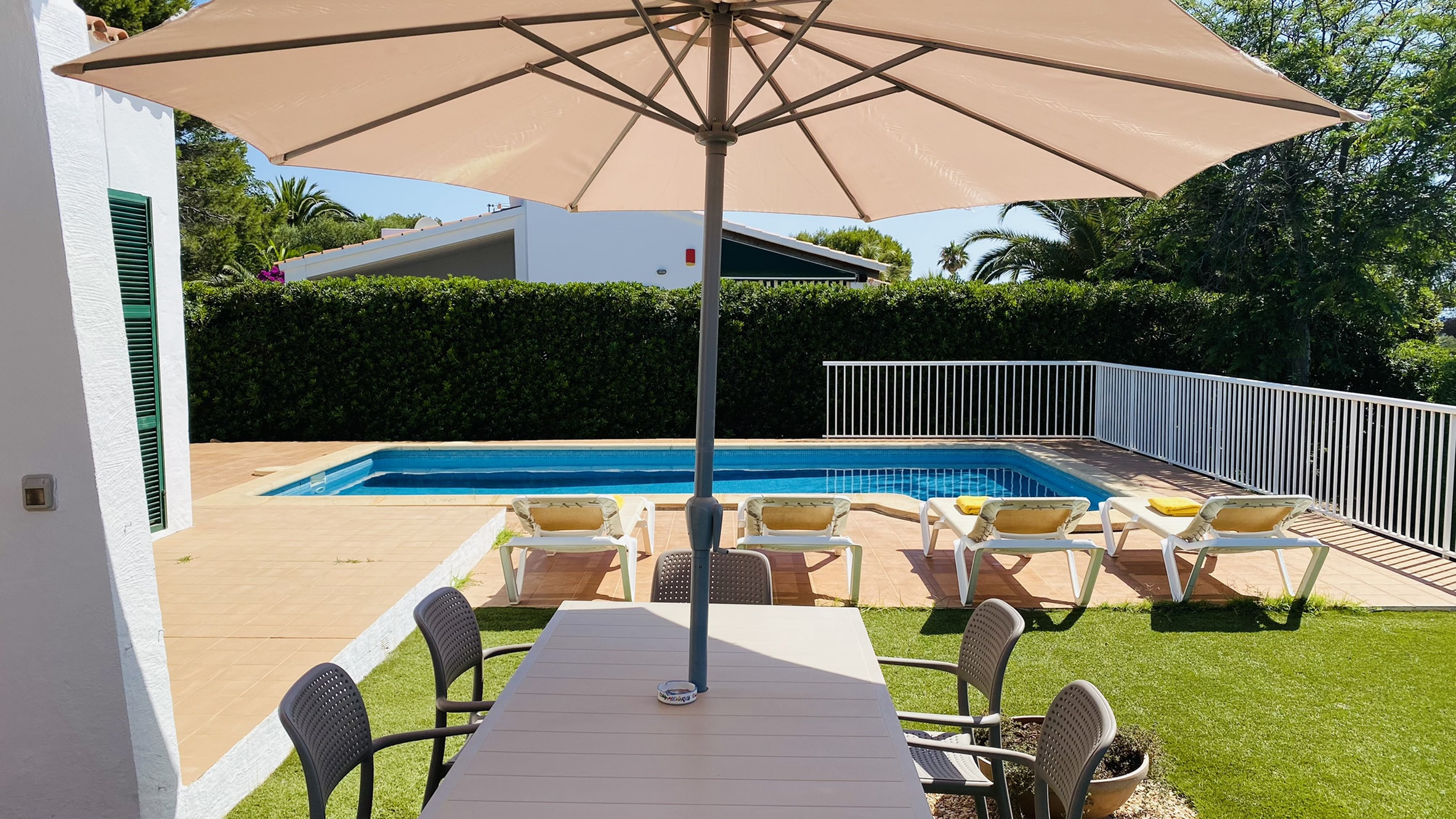 La casa cuenta con un porche con mesa y sillas para comer al aire libre y sofás para relajarse a la sombra. Tiene un área de césped artificial con vegetación autóctona y la piscina, de 7mx3m, está rodeada de suelo de terraza. Hay barbacoa de obra y porche para aparcar a la sombra.