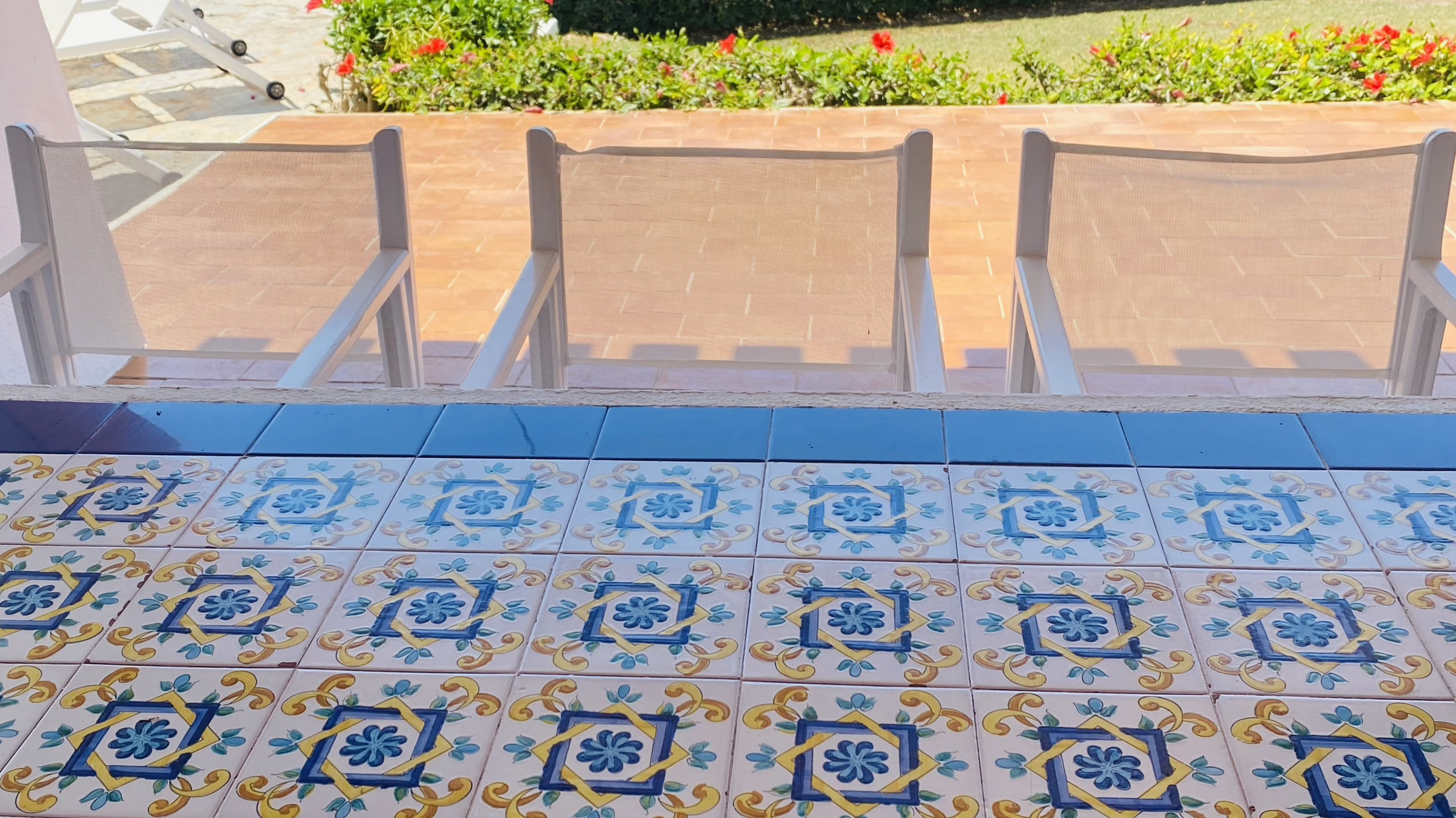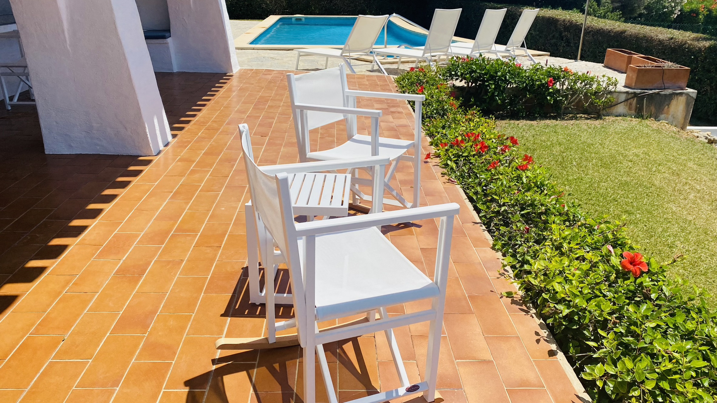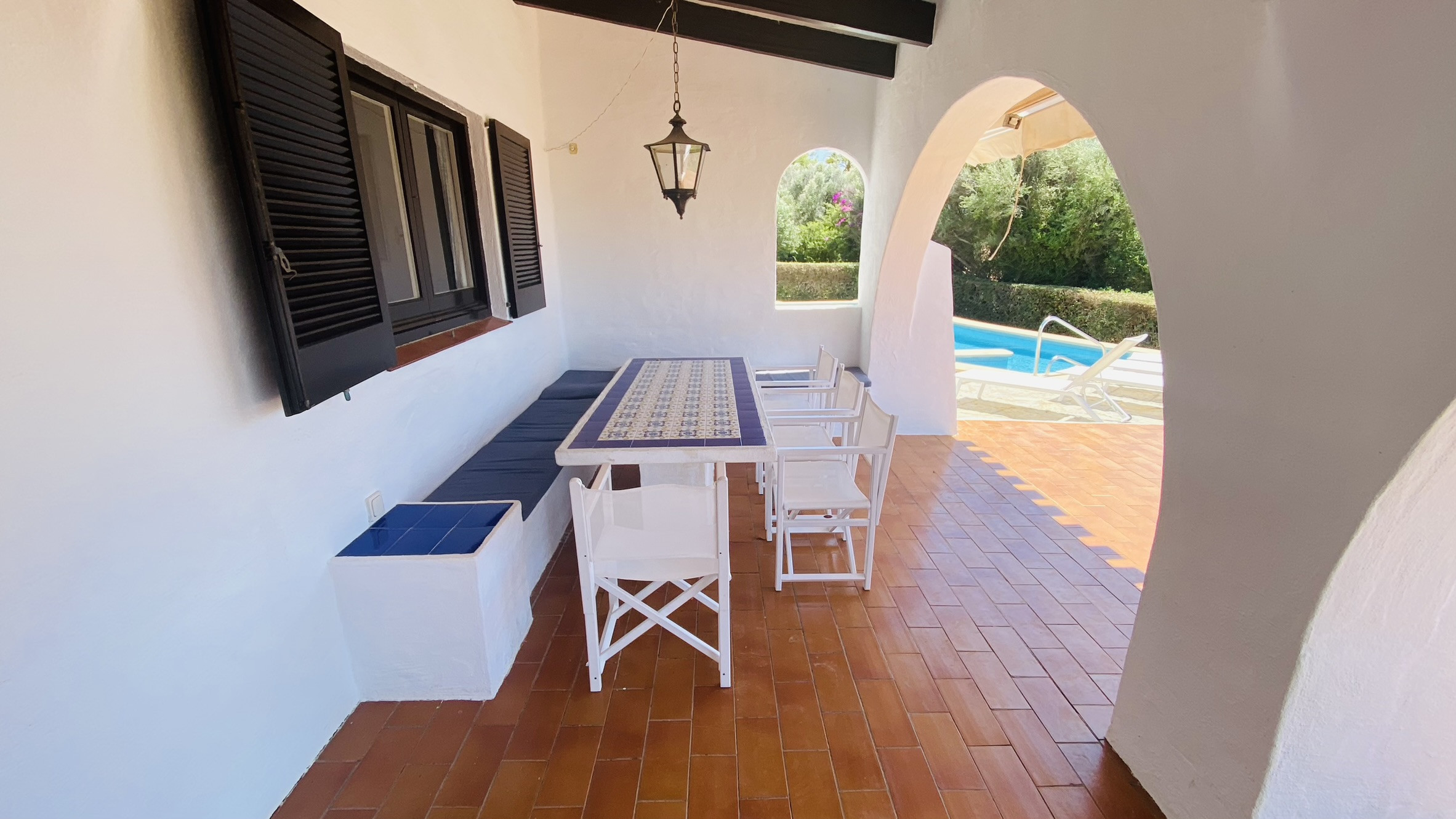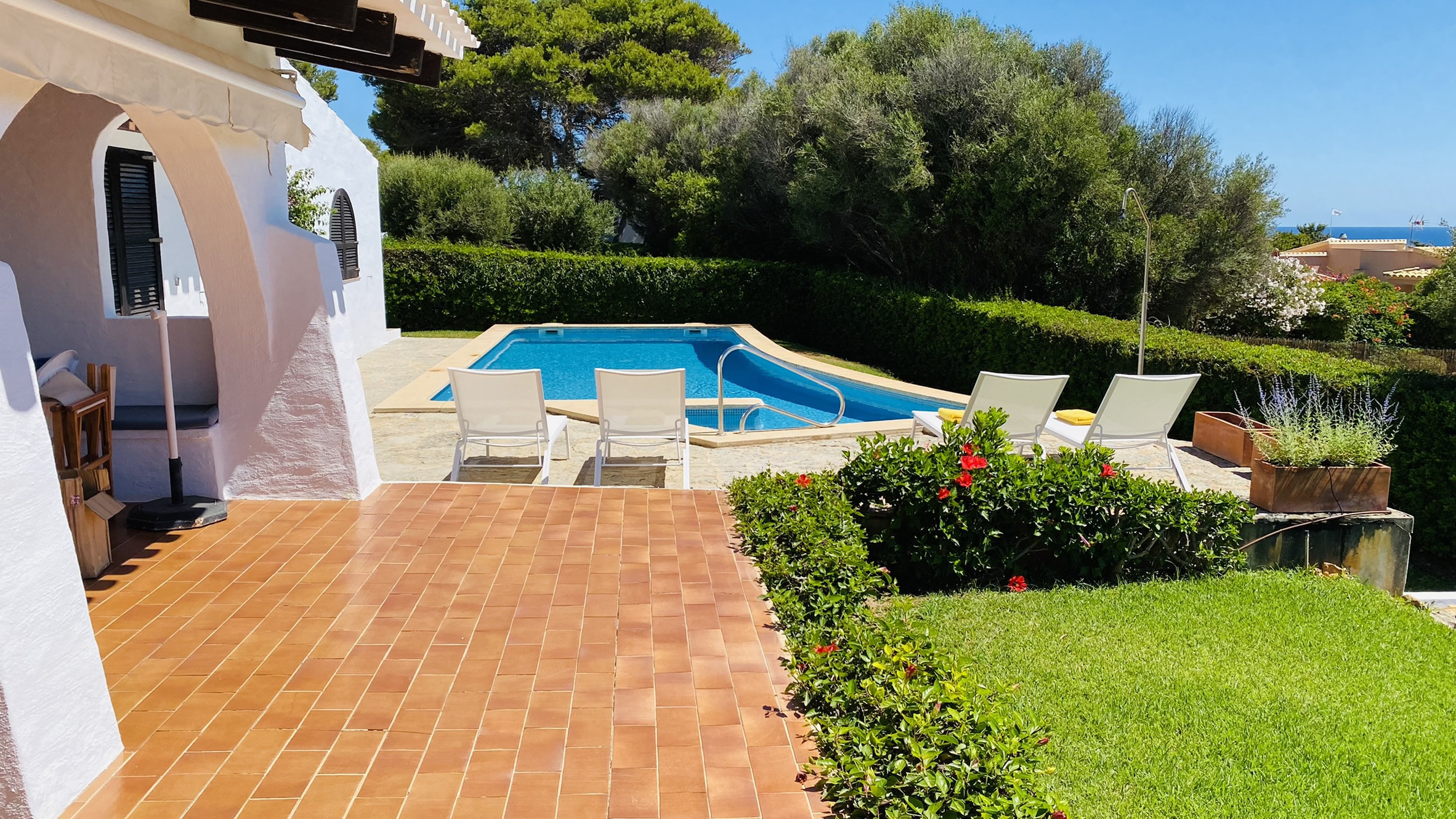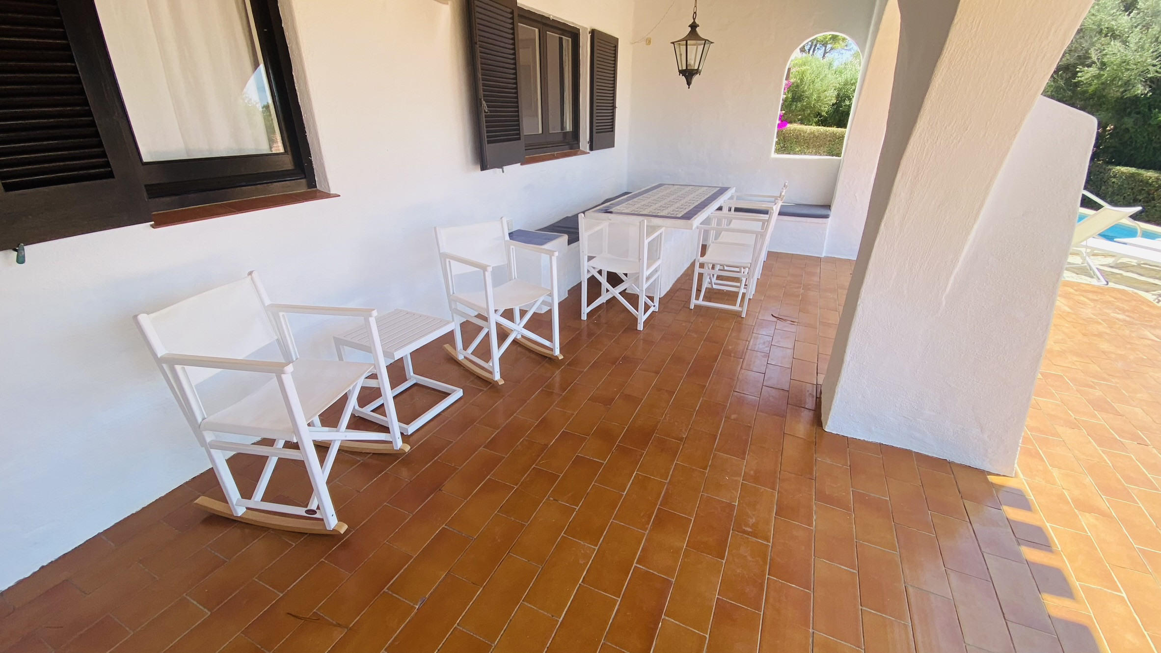 La casa tiene un amplio porche con vistas parciales al mar, amueblado con una mesa y bancos de obra para comer al aire fresco. La piscina (8m x 4m) tiene escalones de obra para acceder a ella y está rodeada de césped y terrazas para tomar el sol. El jardín cuenta con una amplia zona de césped.