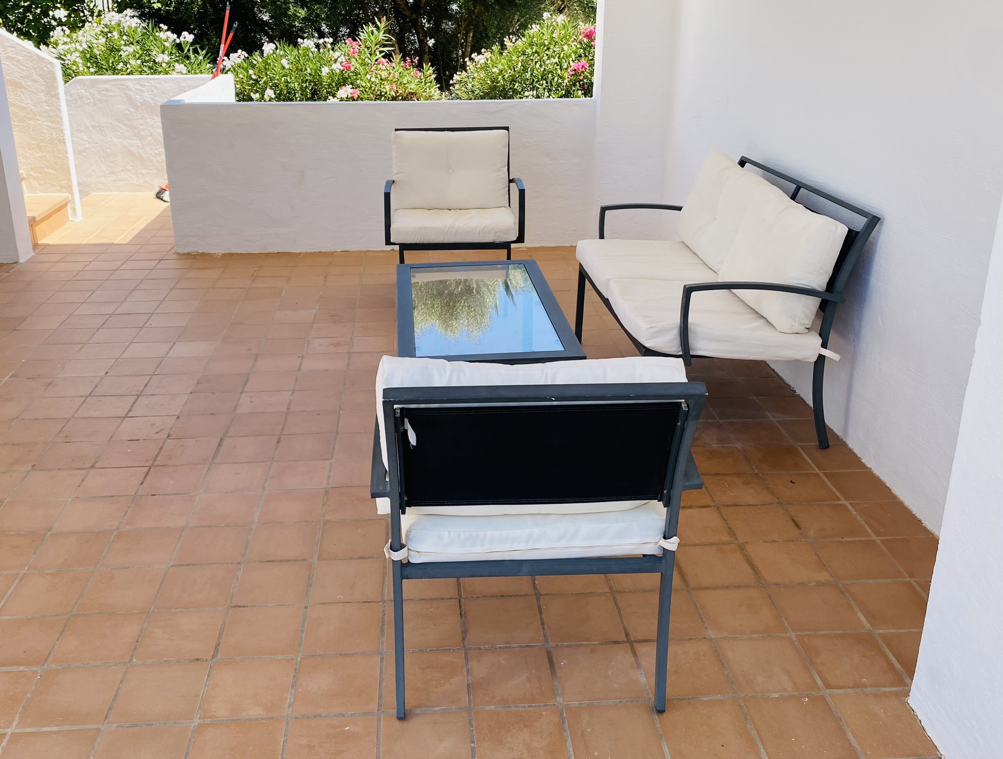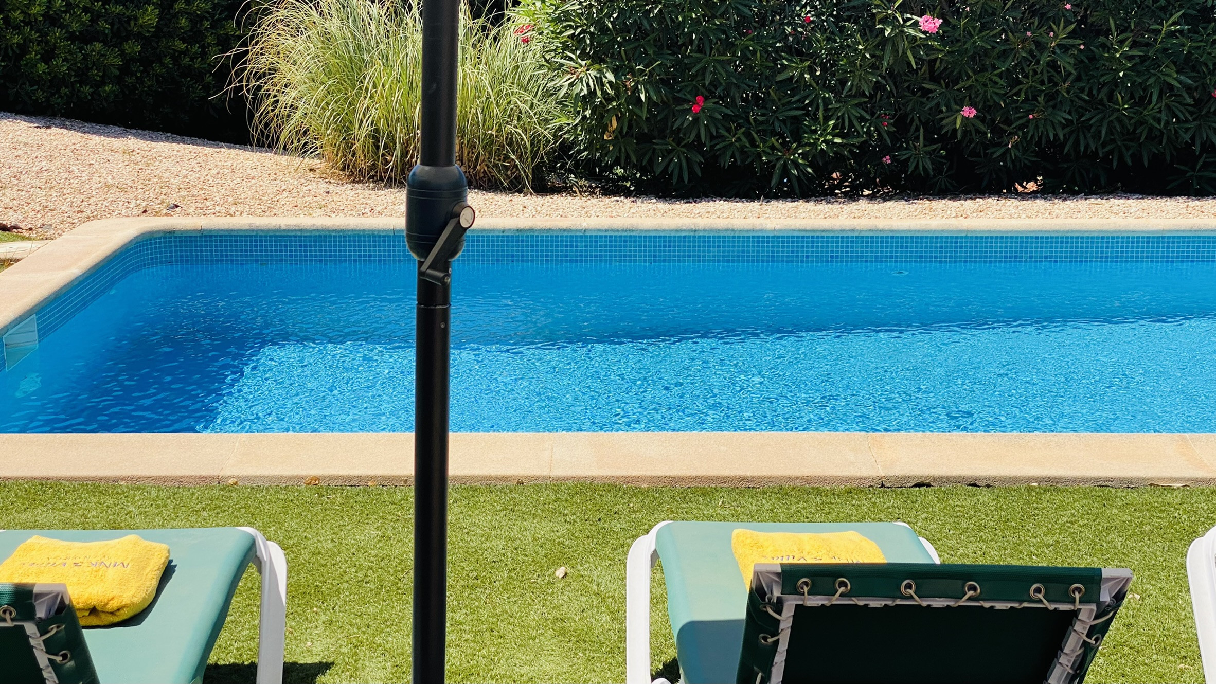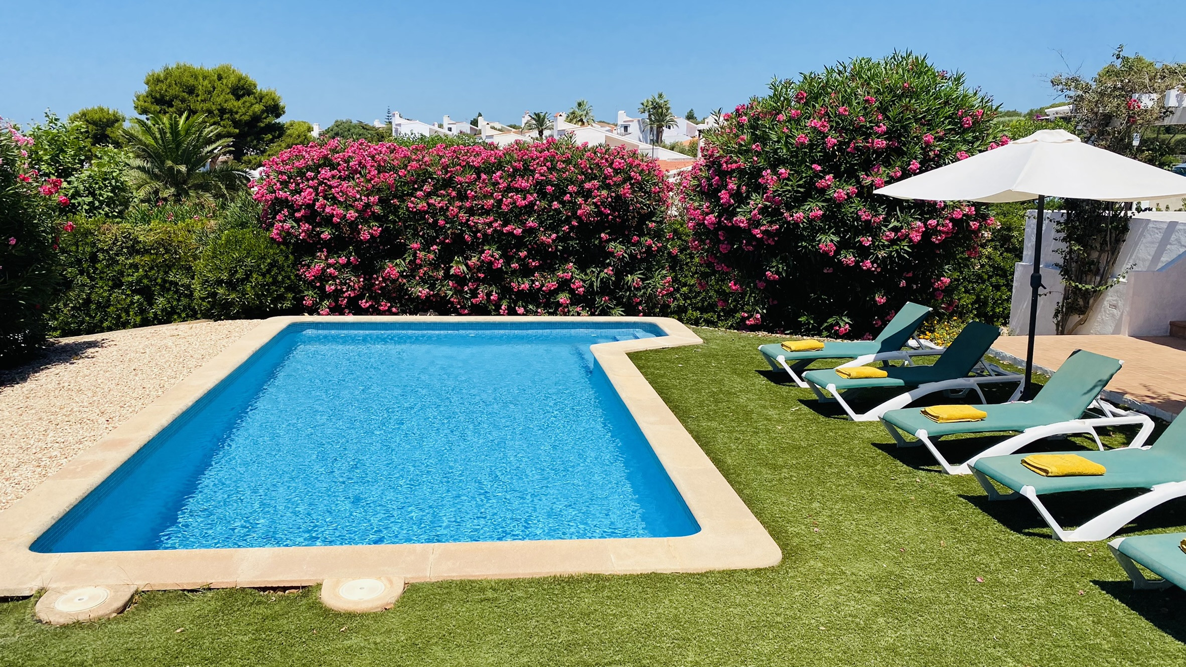 La casa cuenta con un porche, conectado al comedor, y amueblado con mesa y sillas para comer a la sombra. La piscina mide 8m x 5m y está rodeada de un amplio jardín, con vegetación y flores autóctonas, césped artificial y zonas de sombra natural. Hay una barbacoa de obra y sofás exteriores para relajarse al aire libre.