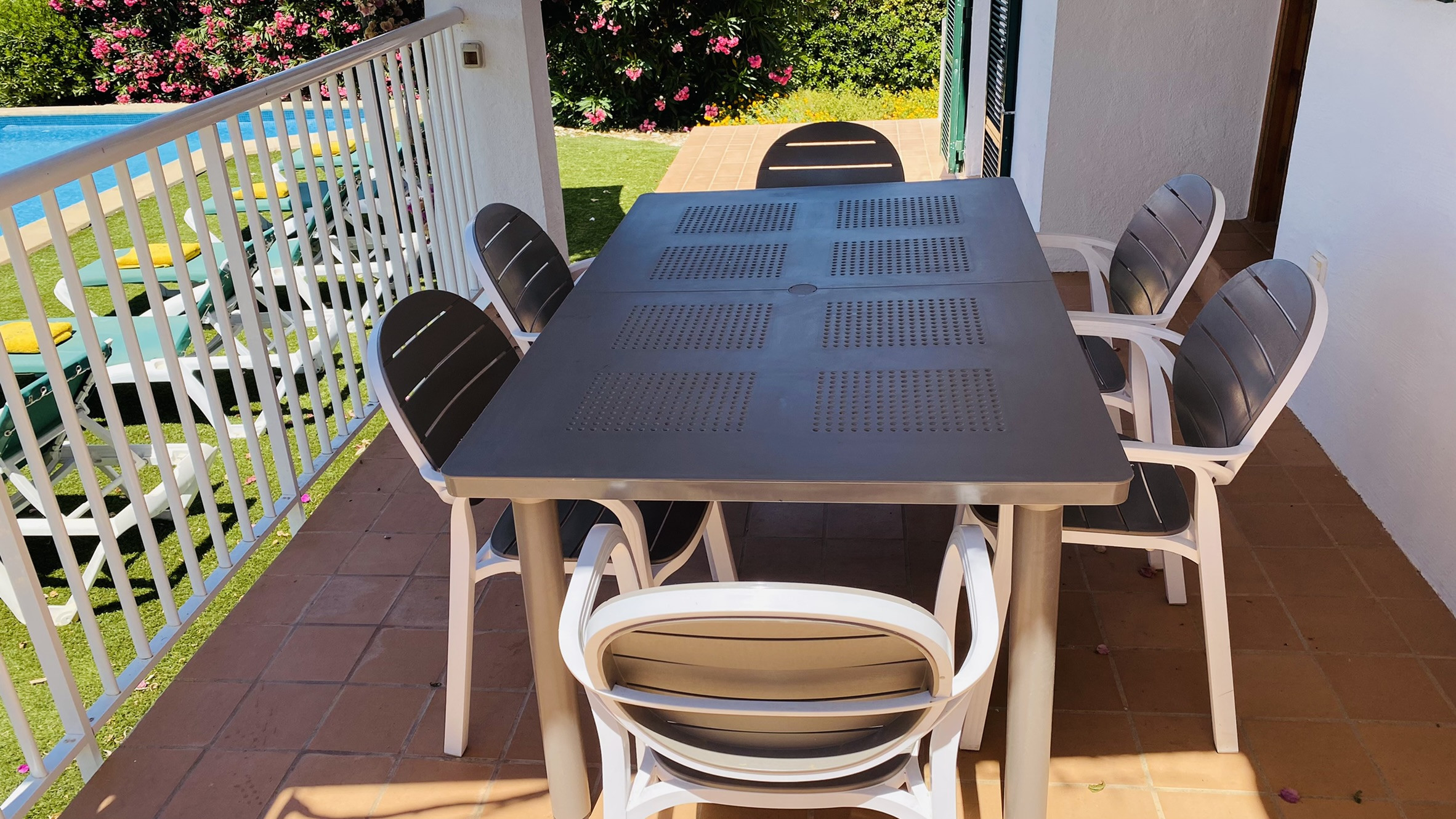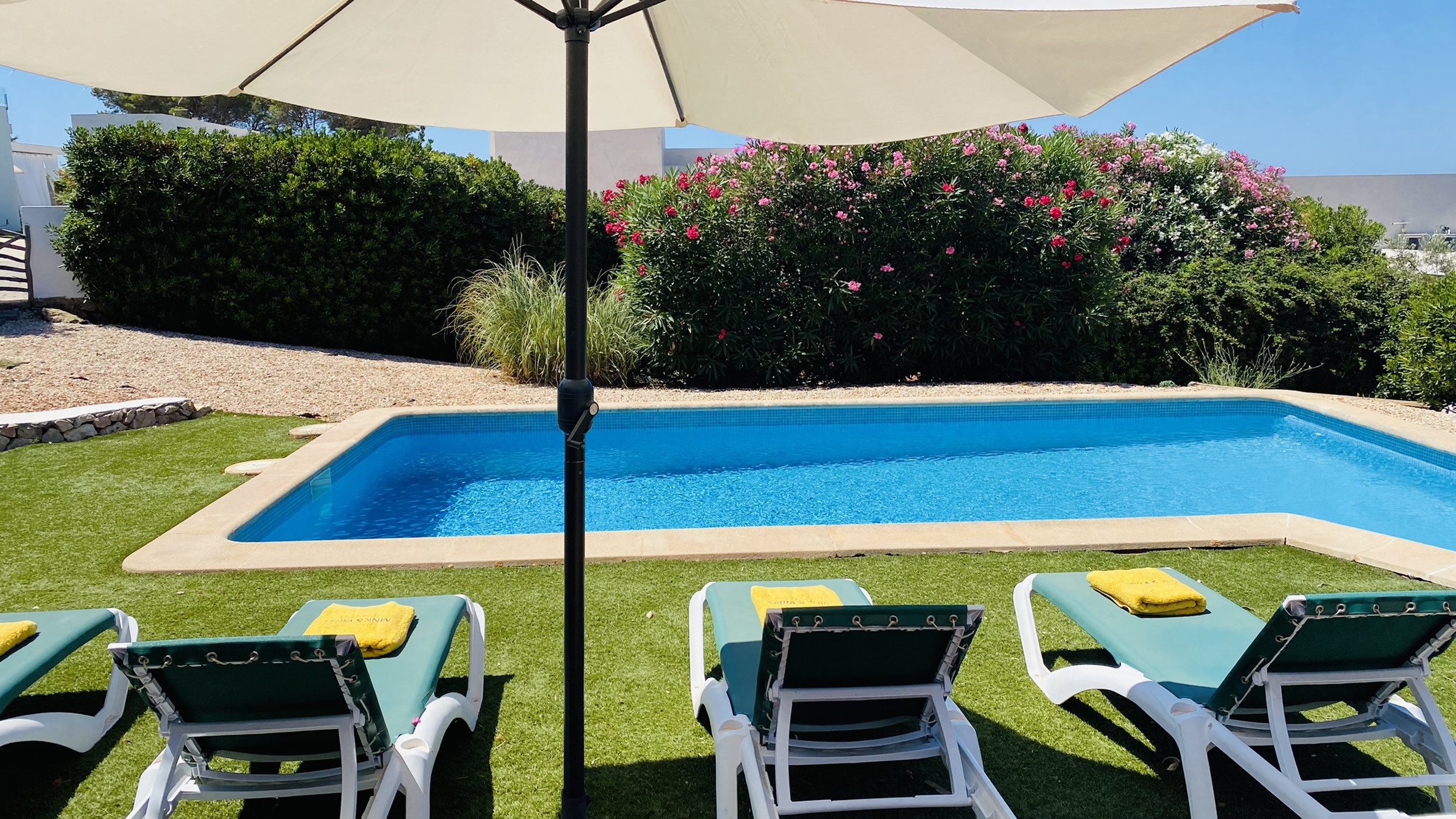 La casa cuenta con un porche con mesa y sillas para comer al aire libre y sofás para relajarse a la sombra. Tiene un área de césped artificial con vegetación autóctona y la piscina, de 7mx3m, está rodeada de suelo de terraza. Hay barbacoa de obra y porche para aparcar a la sombra.