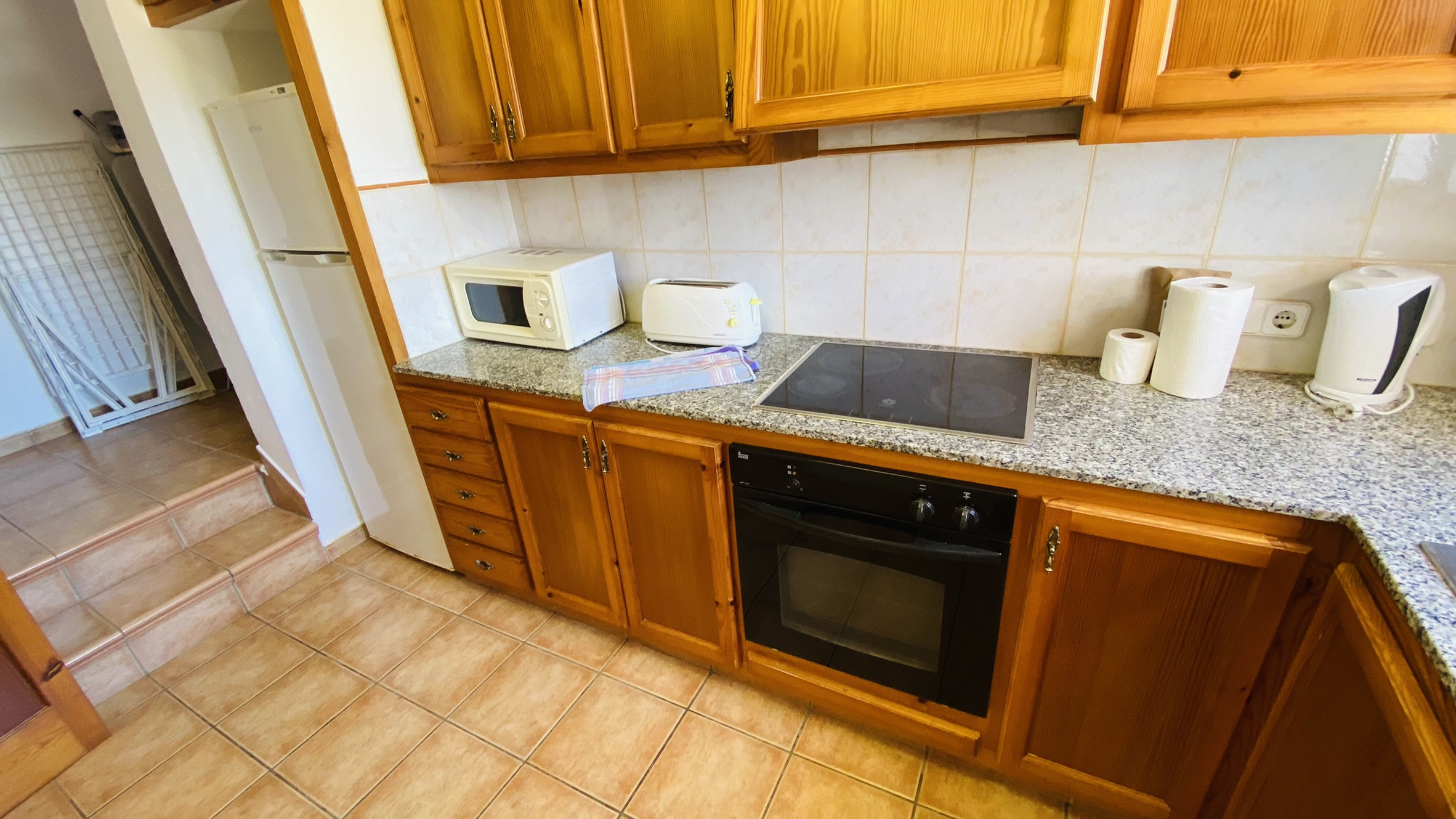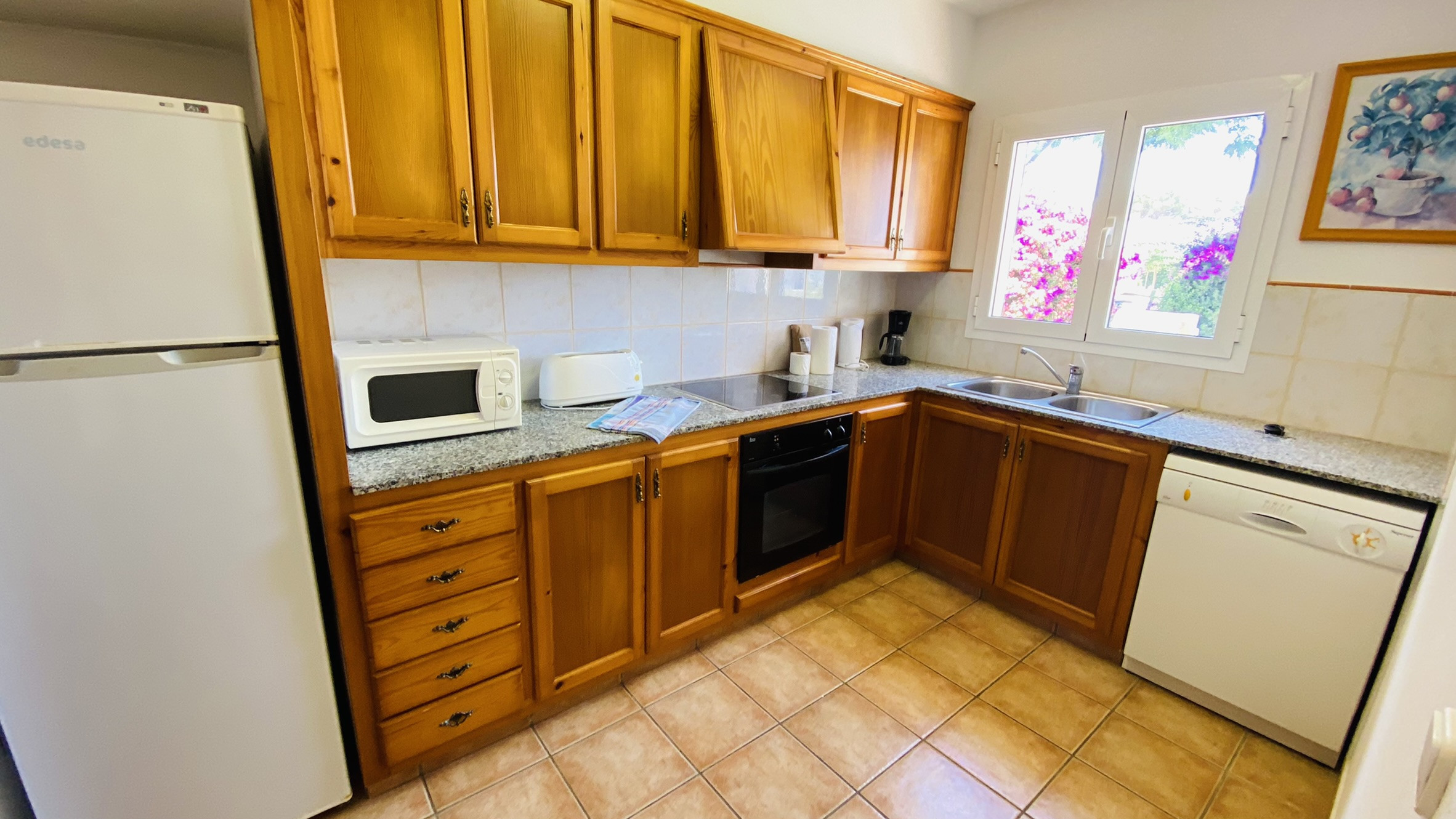 La cocina americana está totalmente equipada con electrodomésticos de última generación, incluyendo lavadora, lavavajillas, horno, microondas, cafetera y una amplia variedad de menaje. Además, cuenta con aire acondicionado y bomba de calor para mantener una temperatura perfecta durante todo el año.