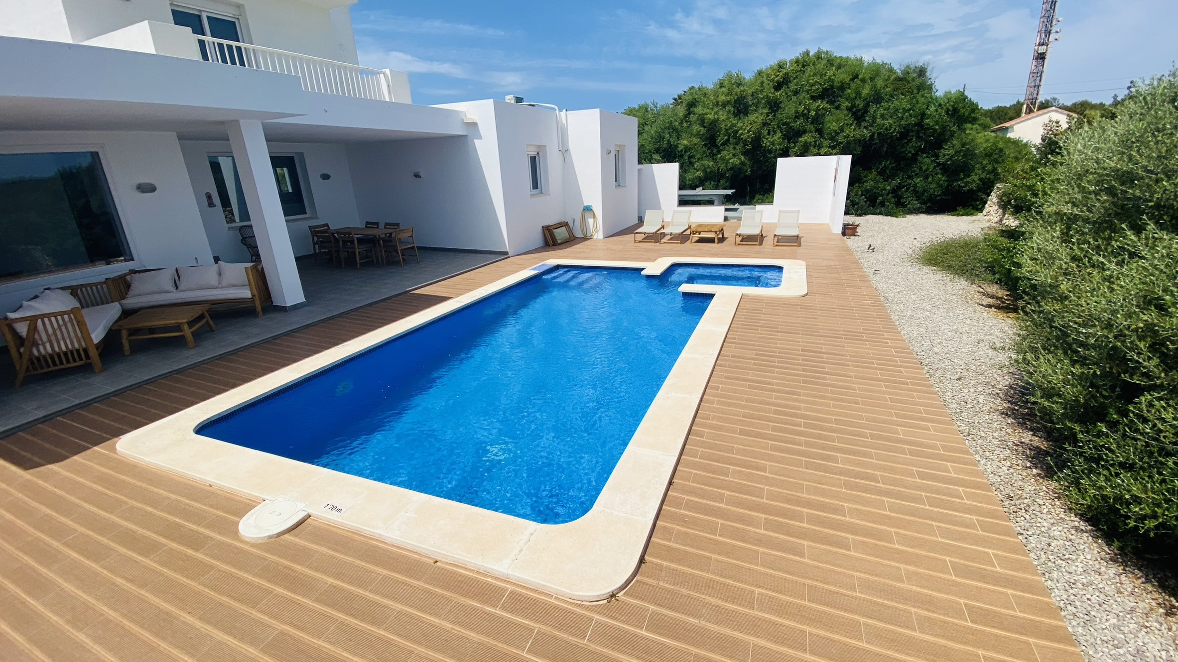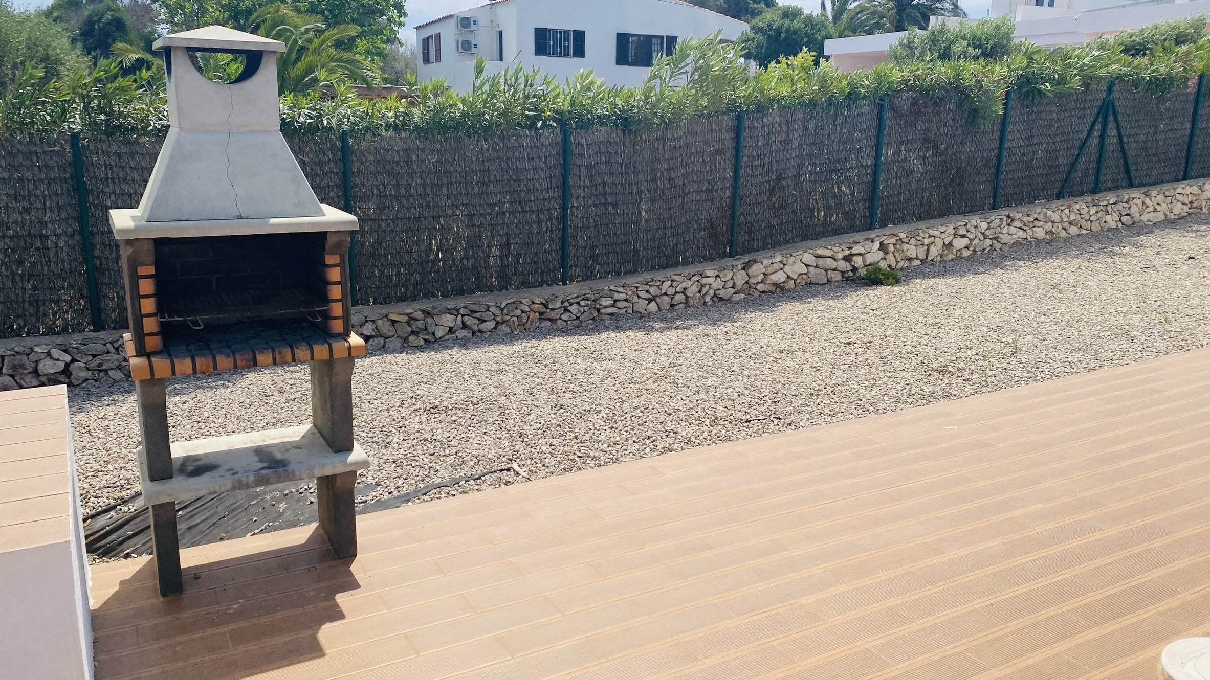 La casa cuenta con un porche con mesa y sillas para comer al aire libre y sofás para relajarse a la sombra. Tiene un área de césped artificial con vegetación autóctona y la piscina, de 7mx3m, está rodeada de suelo de terraza. Hay barbacoa de obra y porche para aparcar a la sombra.
