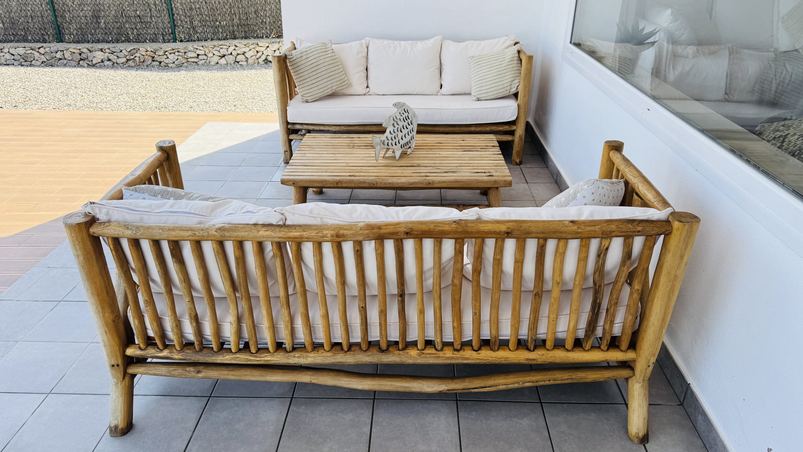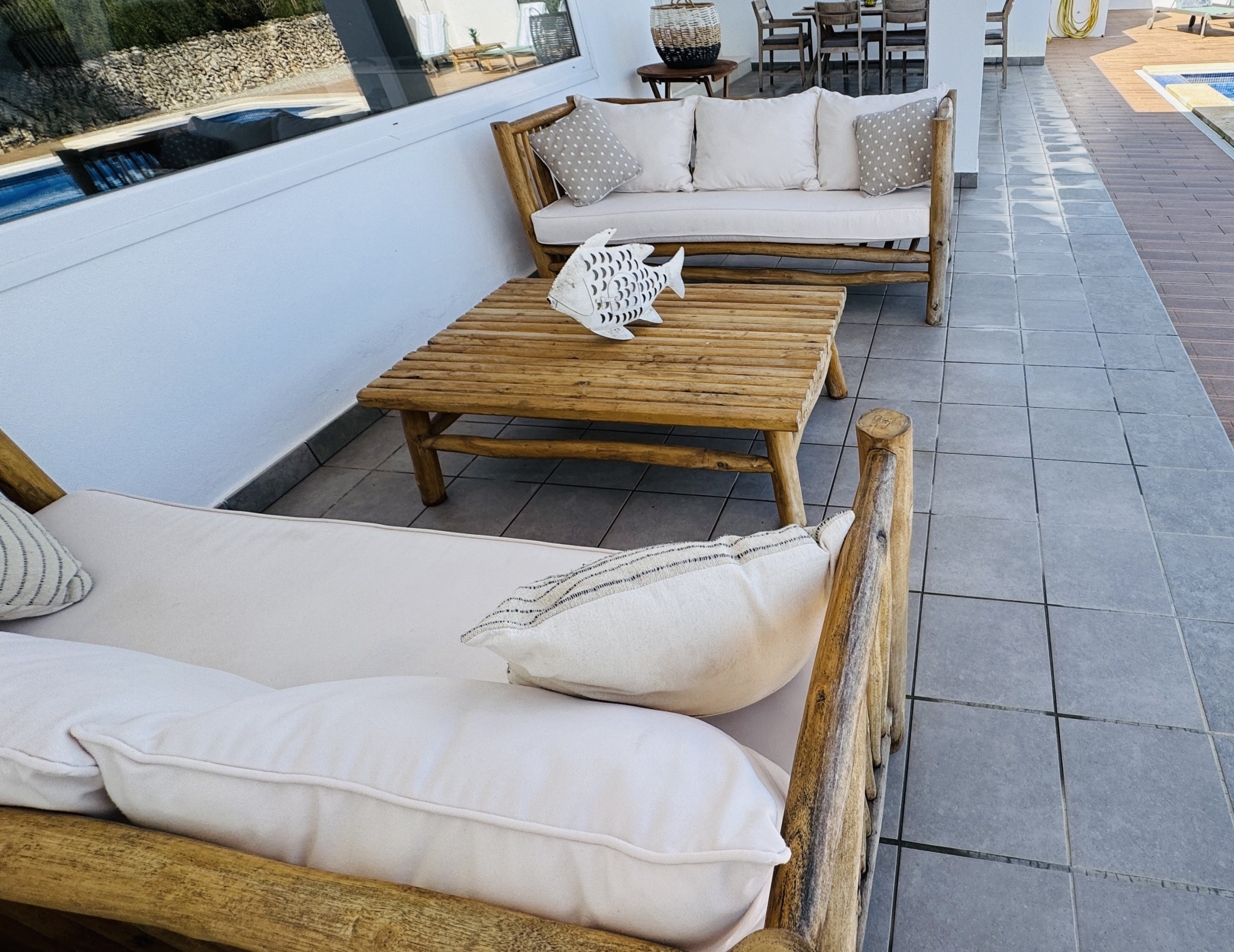 La casa cuenta con un porche, conectado al comedor, y amueblado con mesa y sillas para comer a la sombra. La piscina mide 8m x 5m y está rodeada de un amplio jardín, con vegetación y flores autóctonas, césped artificial y zonas de sombra natural. Hay una barbacoa de obra y sofás exteriores para relajarse al aire libre.