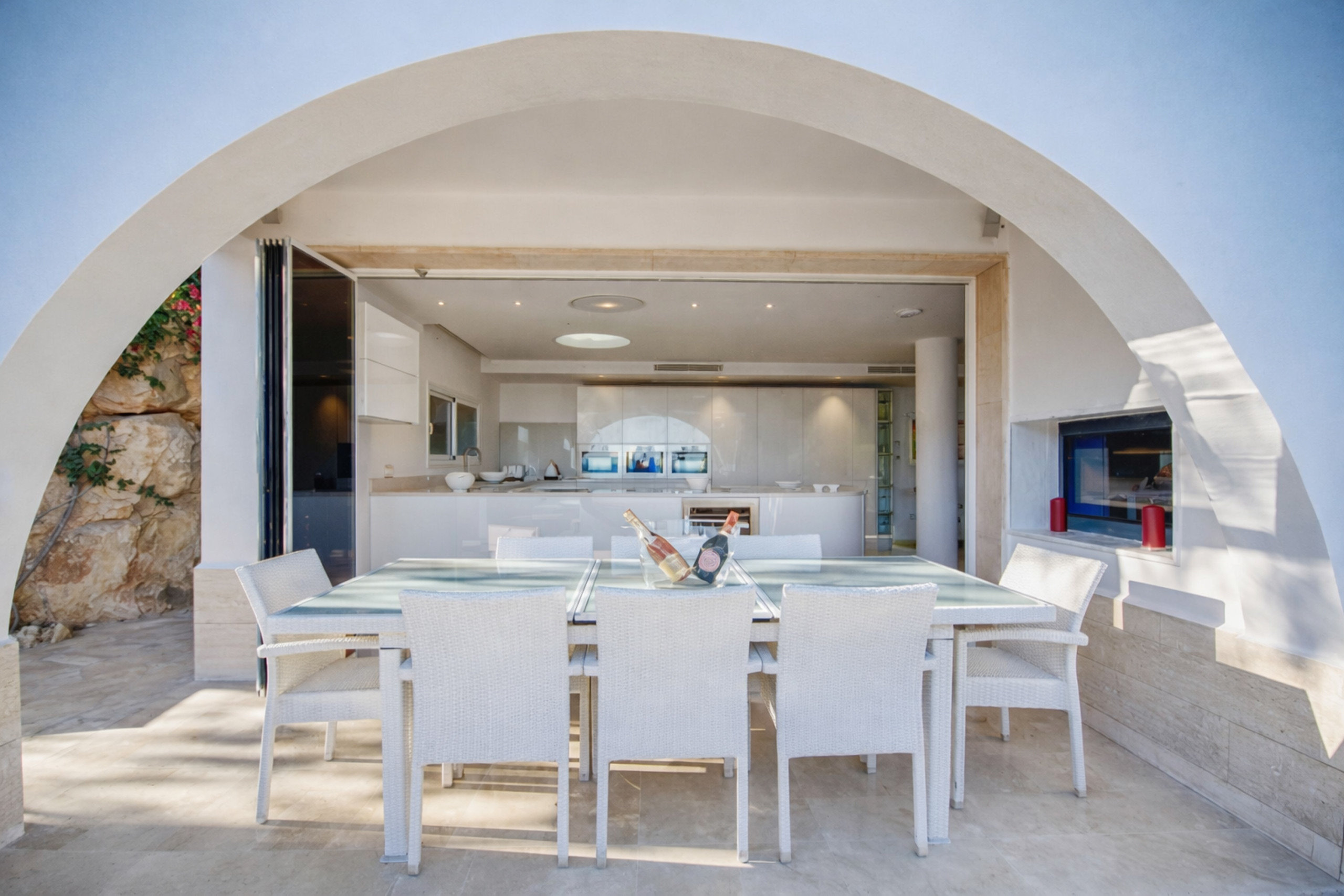 La vivienda se distribuye en espacios amplios y luminosos, con una arquitectura pensada para aprovechar al máximo la luz natural y la conexión con el exterior. Cuenta con cinco habitaciones, cuatro de ellas con cama de matrimonio y una con literas, ofreciendo una distribución versátil y funcional para distintos tipos de huéspedes. Las zonas comunes destacan por su elegancia y comodidad, con un salón generoso que se abre hacia las terrazas exteriores y una cocina totalmente equipada, perfecta para compartir desayunos relajados o largas cenas. En el exterior, la villa ofrece una piscina privada rodeada de zonas de descanso, tumbonas y áreas preparadas para disfrutar del aire libre, todo ello acompañado de agradables vistas al mar y un ambiente que invita a prolongar cada momento.