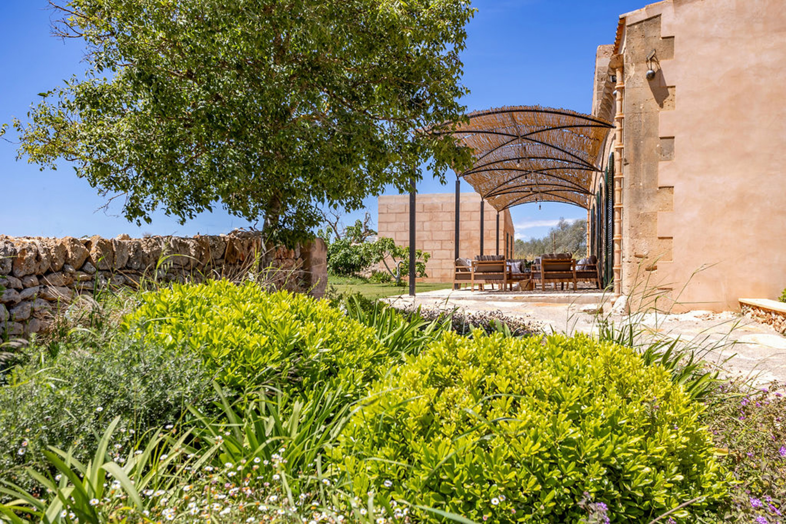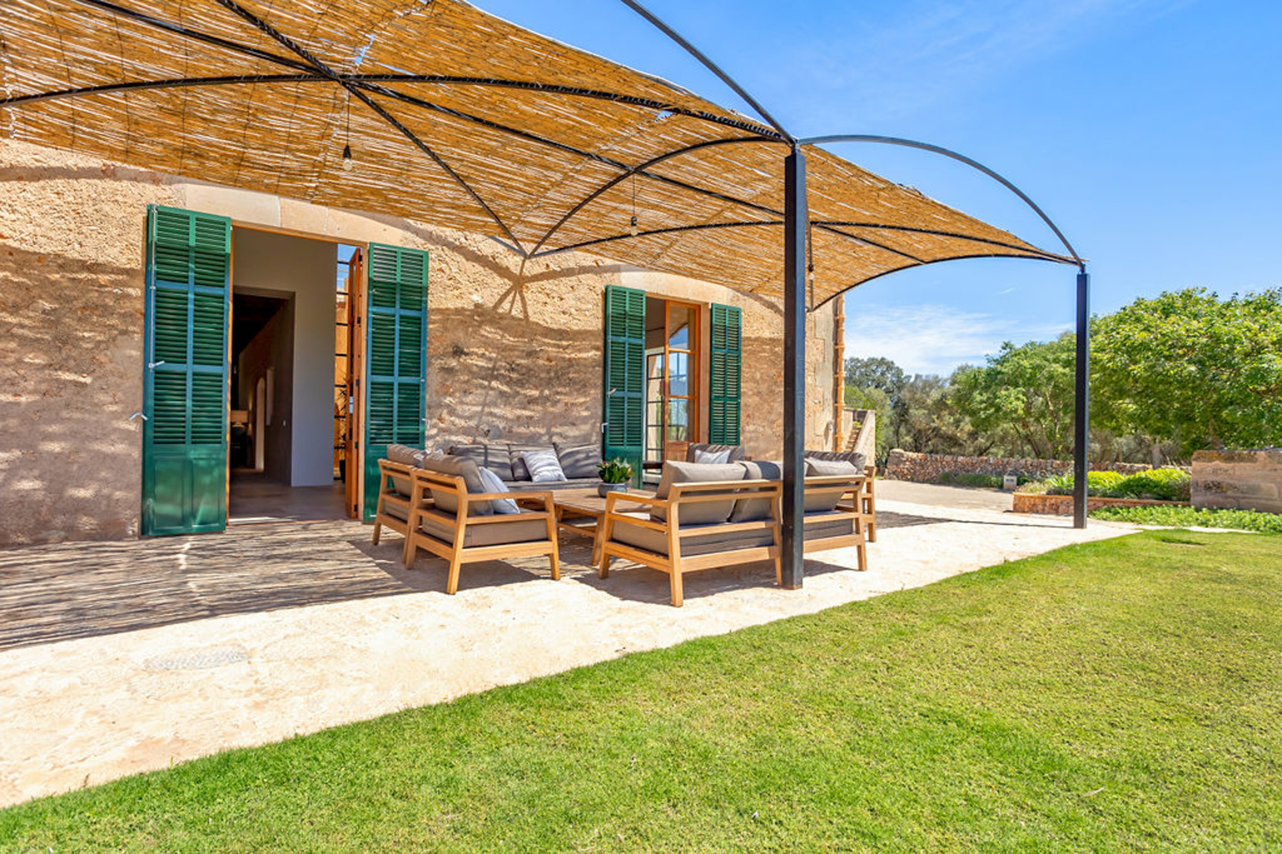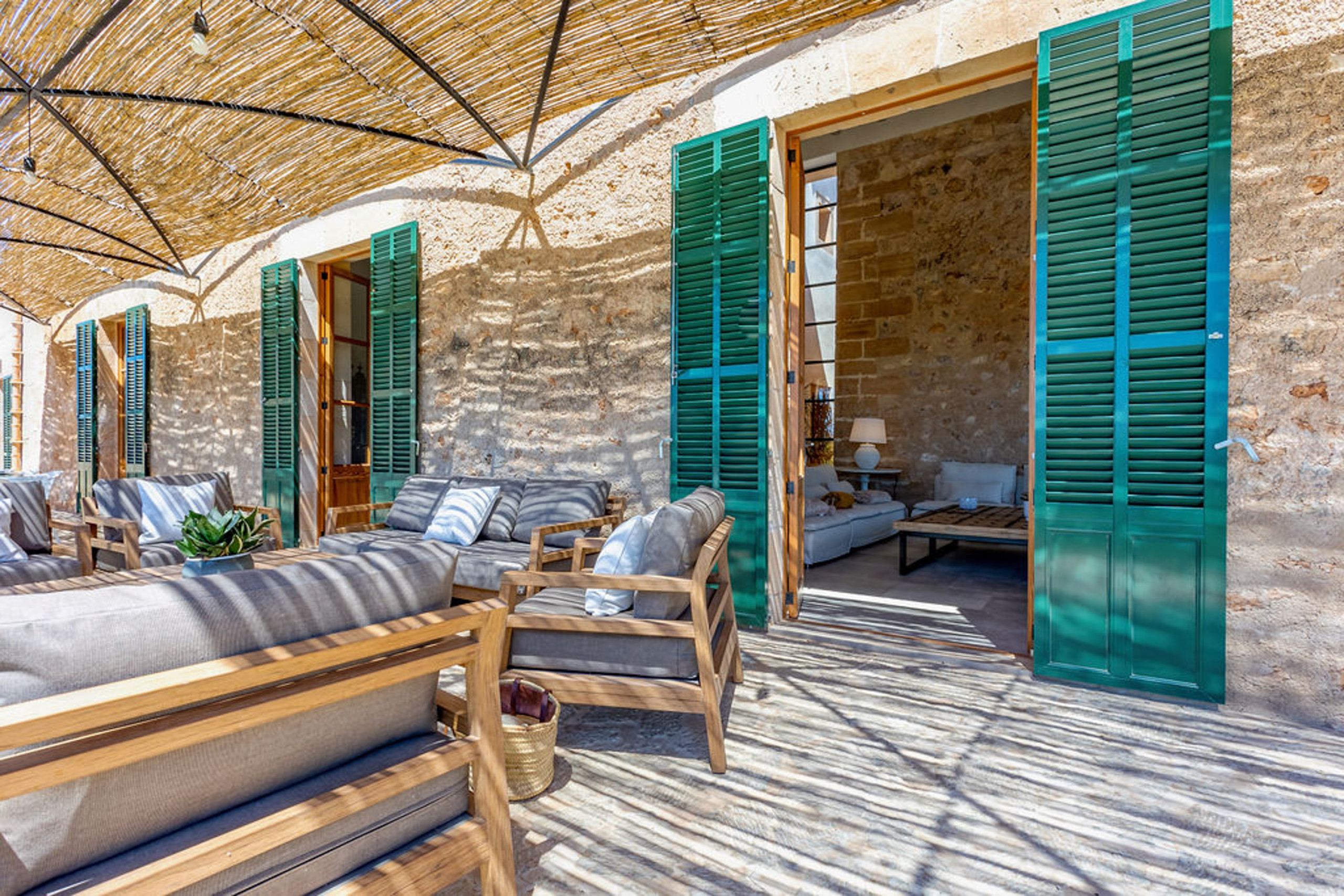 La casa, de estilo mallorquín con toques modernos, cuenta con múltiples terrazas, algunas cubiertas, ideales para disfrutar de las espectaculares vistas panorámicas sobre la costa sureste y la sierra de Tramuntana. En la terraza principal, podrás compartir comidas inolvidables y relajarte en cómodos muebles mientras contemplas el paisaje.