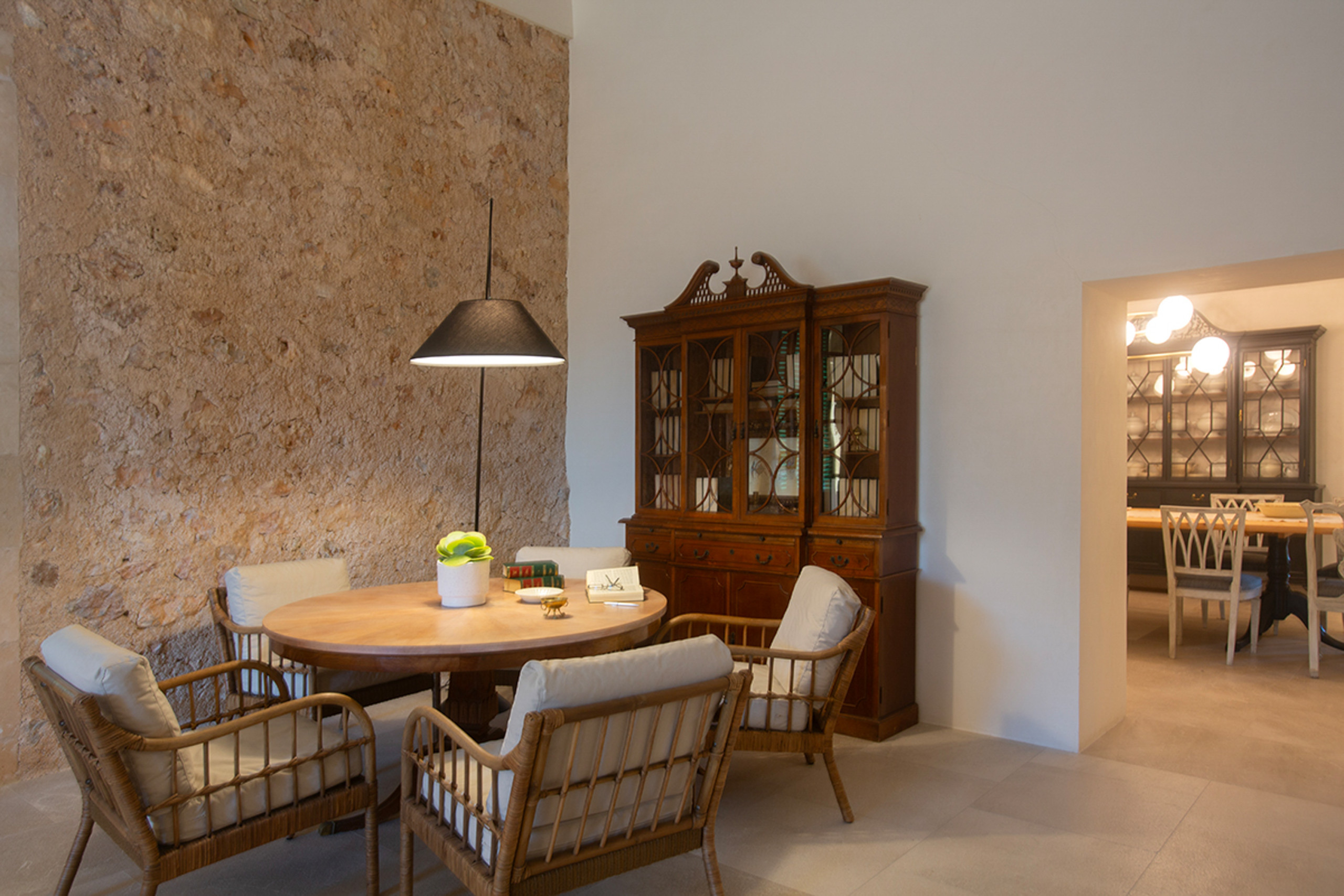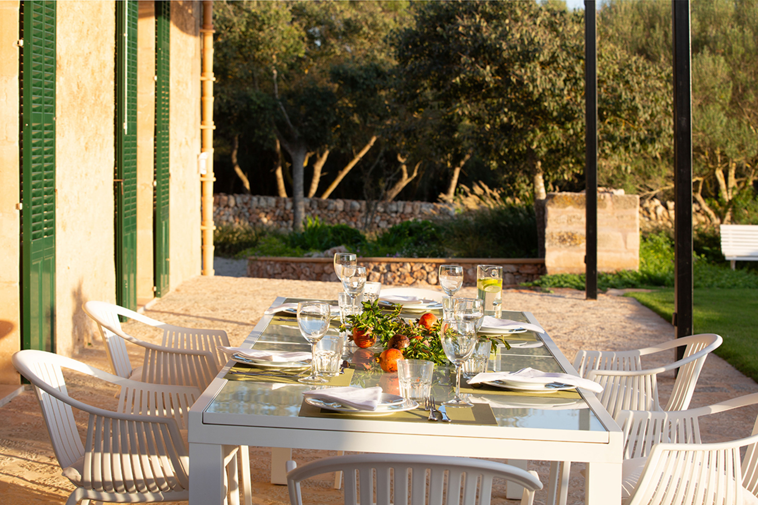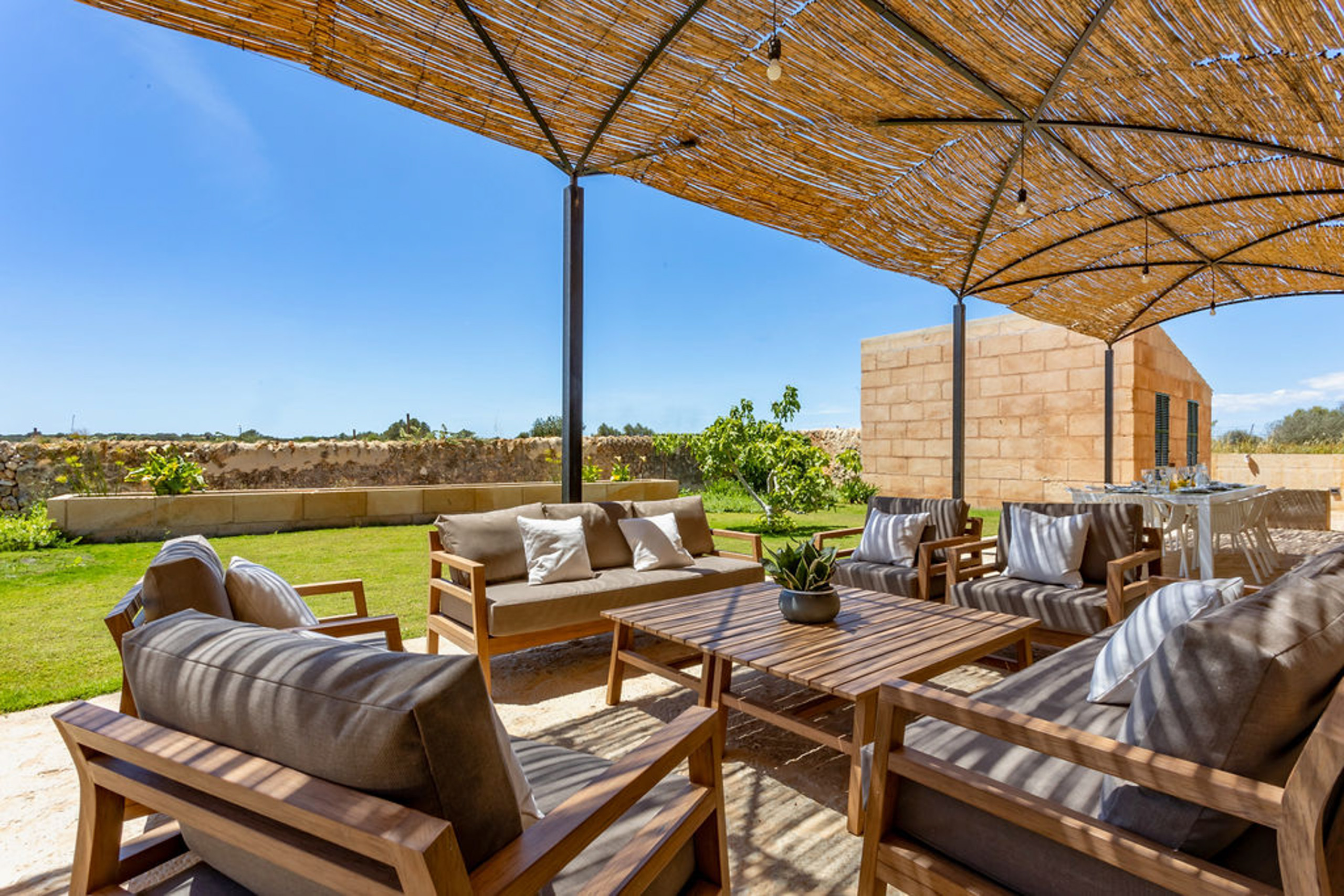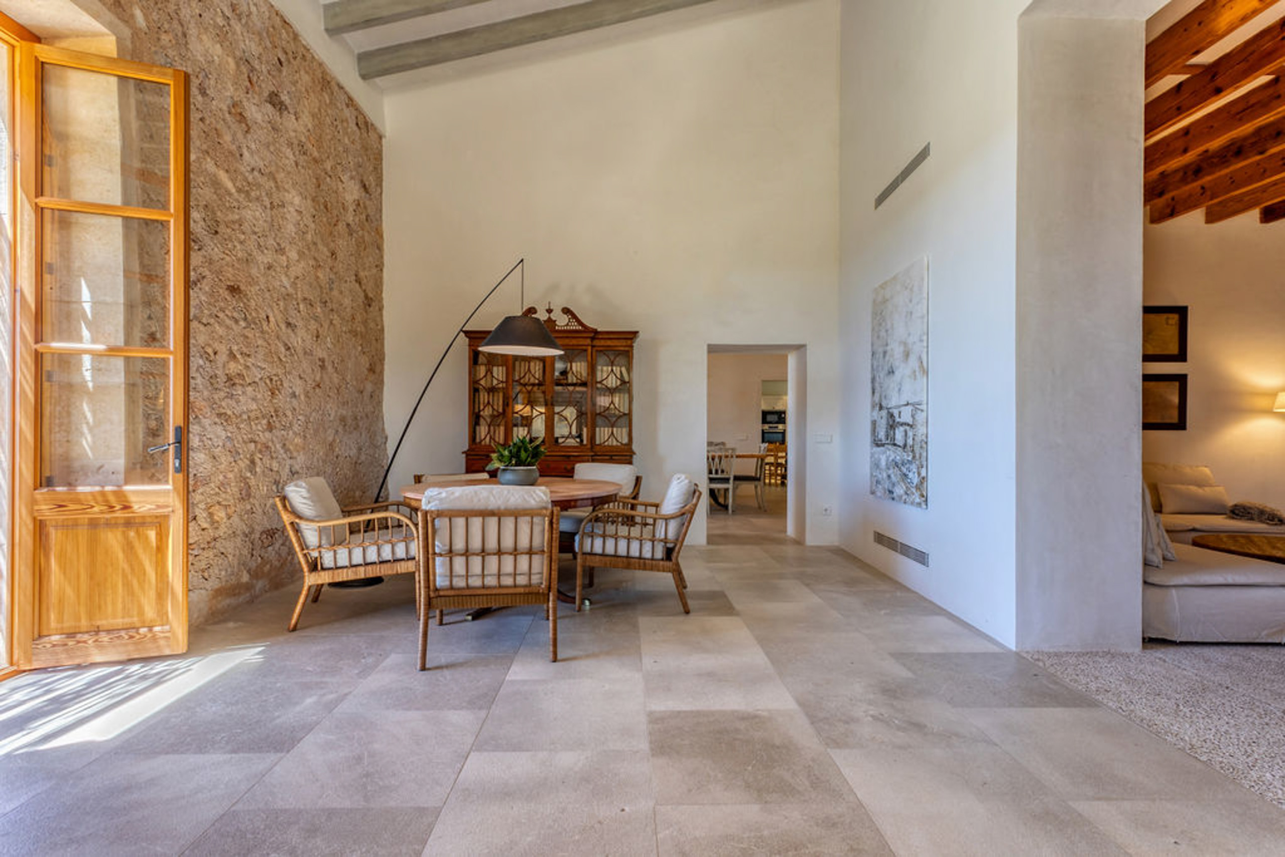 La casa, de estilo mallorquín con toques modernos, cuenta con múltiples terrazas, algunas cubiertas, ideales para disfrutar de las espectaculares vistas panorámicas sobre la costa sureste y la sierra de Tramuntana. En la terraza principal, podrás compartir comidas inolvidables y relajarte en cómodos muebles mientras contemplas el paisaje.