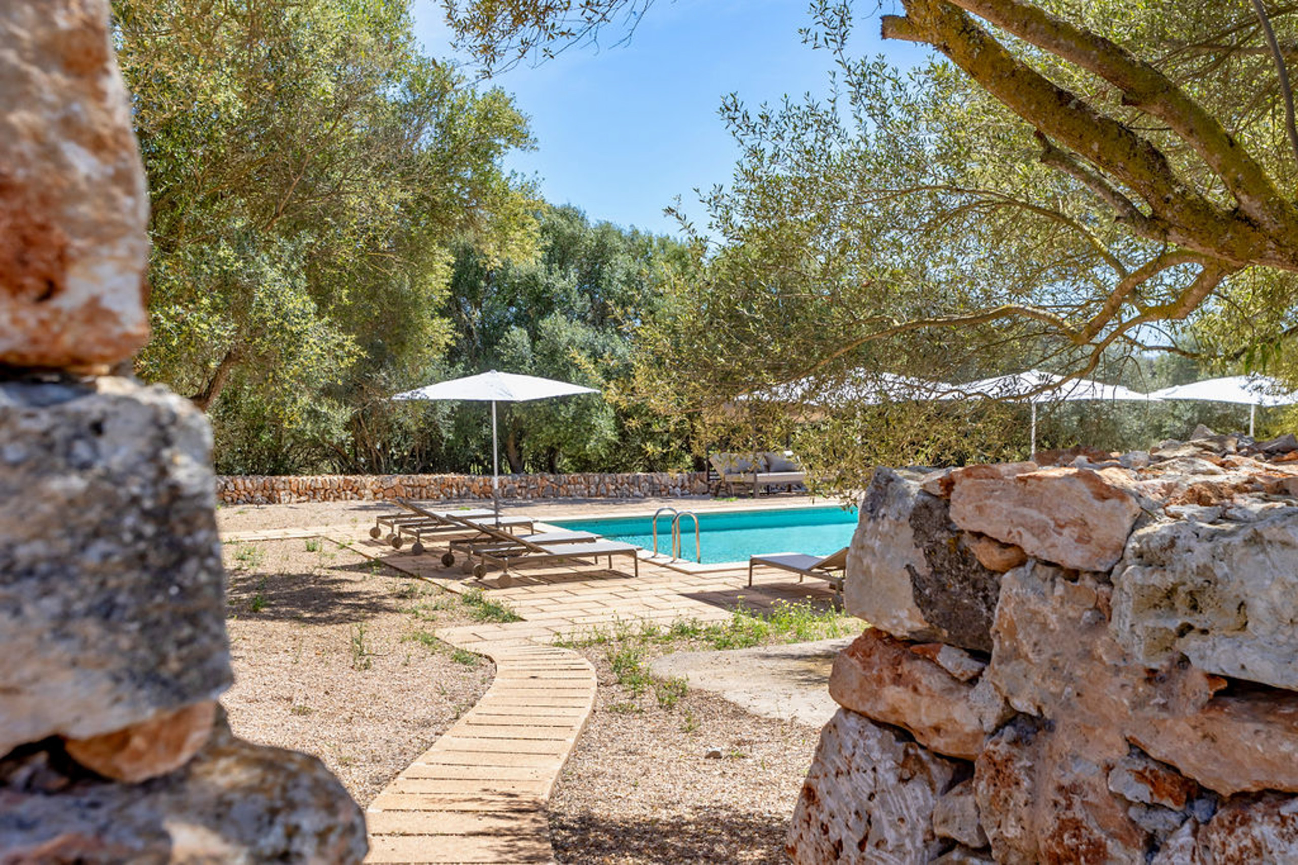 El exterior de la finca se extiende sobre más de 160.000 m² con amplios jardines, terrazas y caminos interiores ideales para pasear o correr. La piscina de 5×12 m (profundidad 1,20–1,40 m) está equipada con 14 tumbonas y una cama balinesa, perfecta para relajarse al sol. Los jardines cuentan con árboles frutales de temporada y zonas de césped para disfrutar de comidas al aire libre o momentos de tranquilidad. Hay aparcamiento exterior con capacidad para 7 coches y absoluta privacidad garantizada.