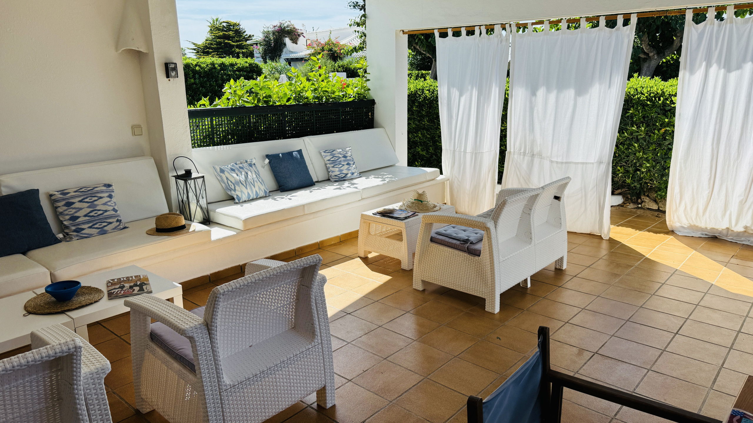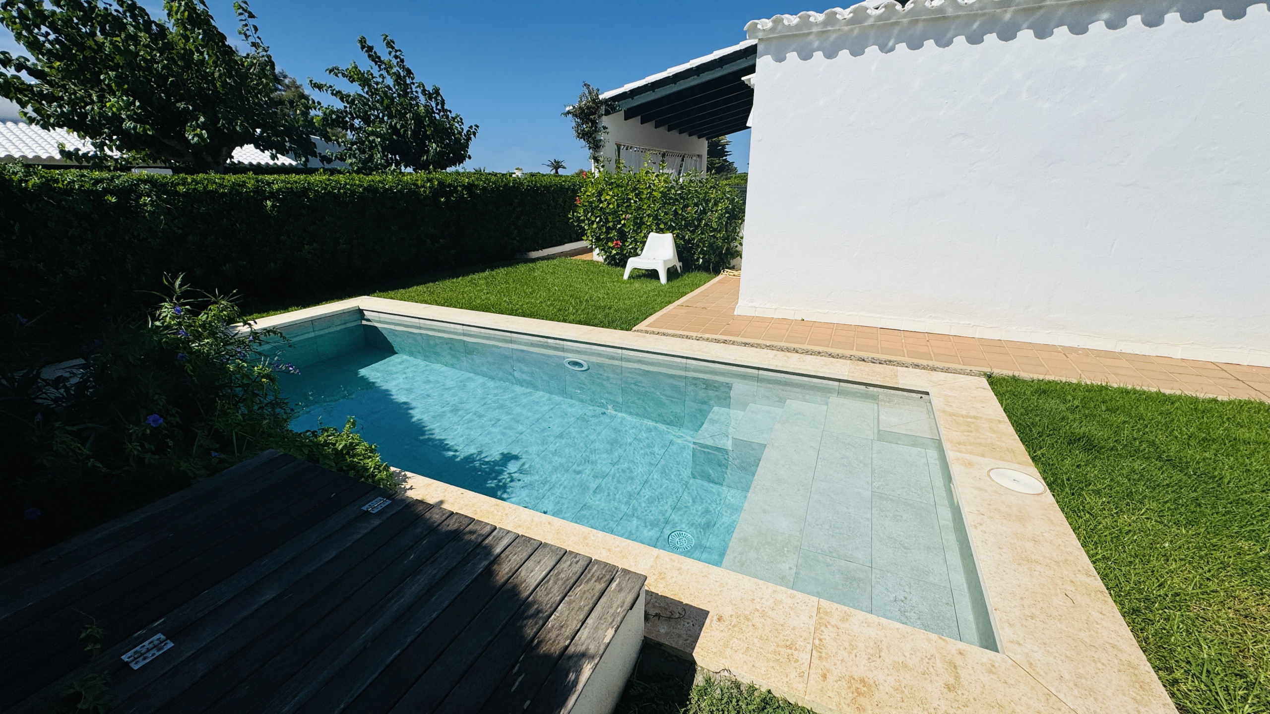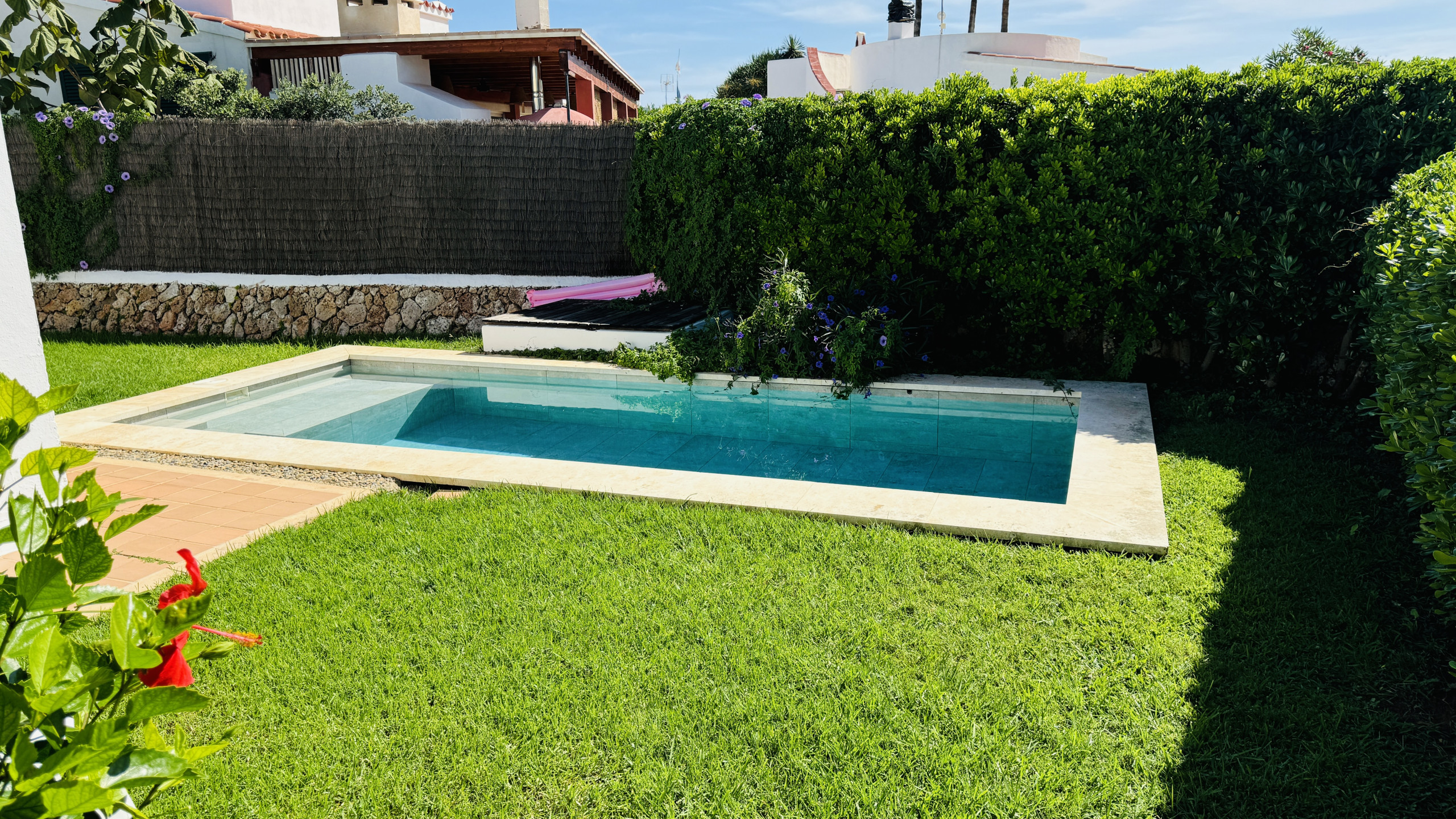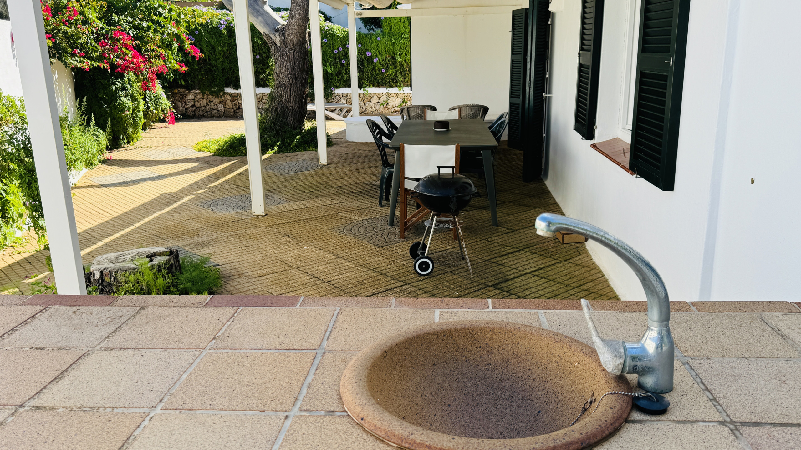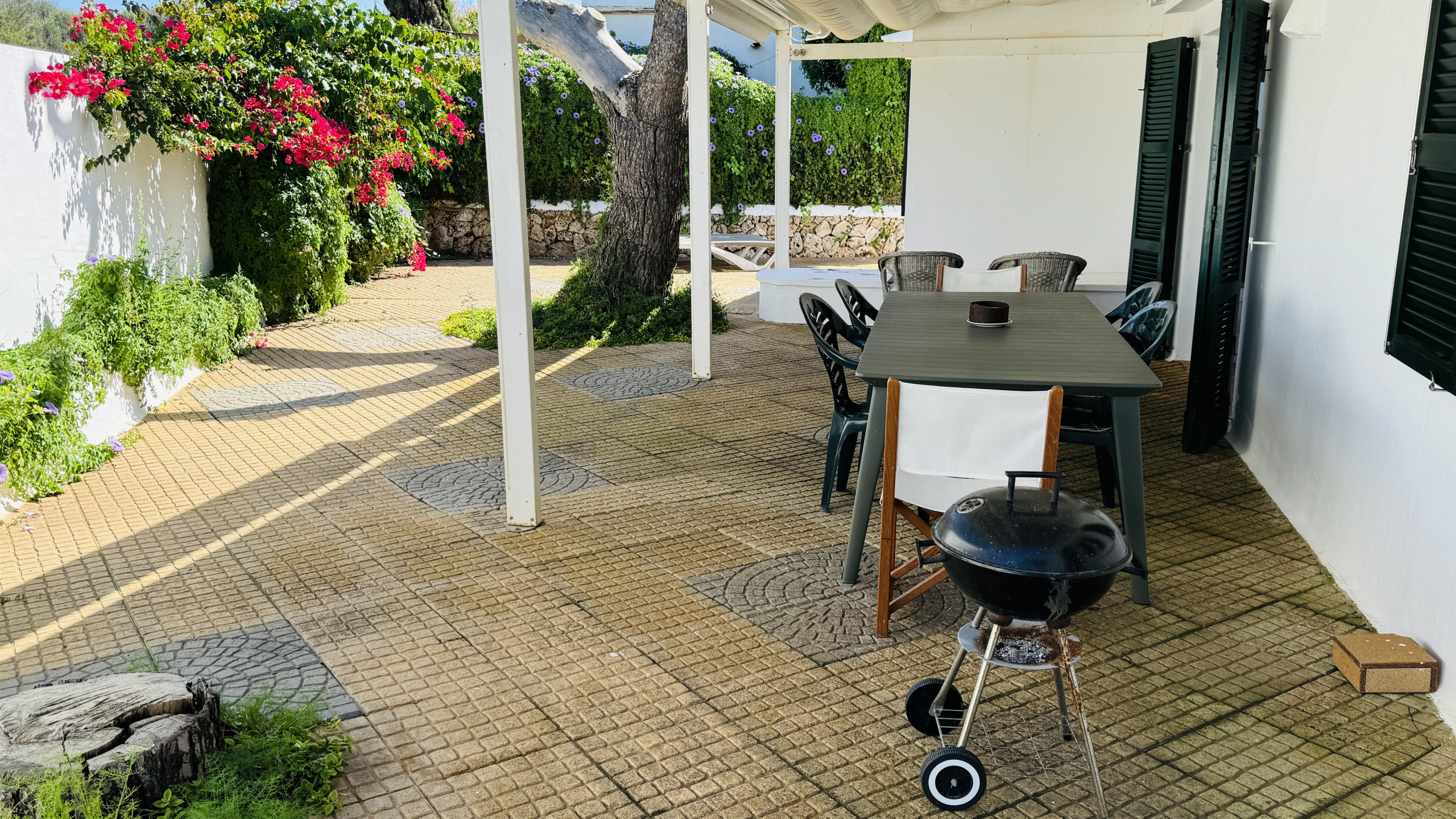 La casa cuenta con una gran piscina (agua salina), zona de césped y gozando de unas maravillosas vistas al mar y puesta del sol. La terraza cuenta con mesa y sillas para comer a la sombra, y también con sofás de obra exteriores. Desde el jardín se puede bajar al mar. En un lateral de la casa está la barbacoa de obra, con mesa para barbacoa, y pica para fregar.