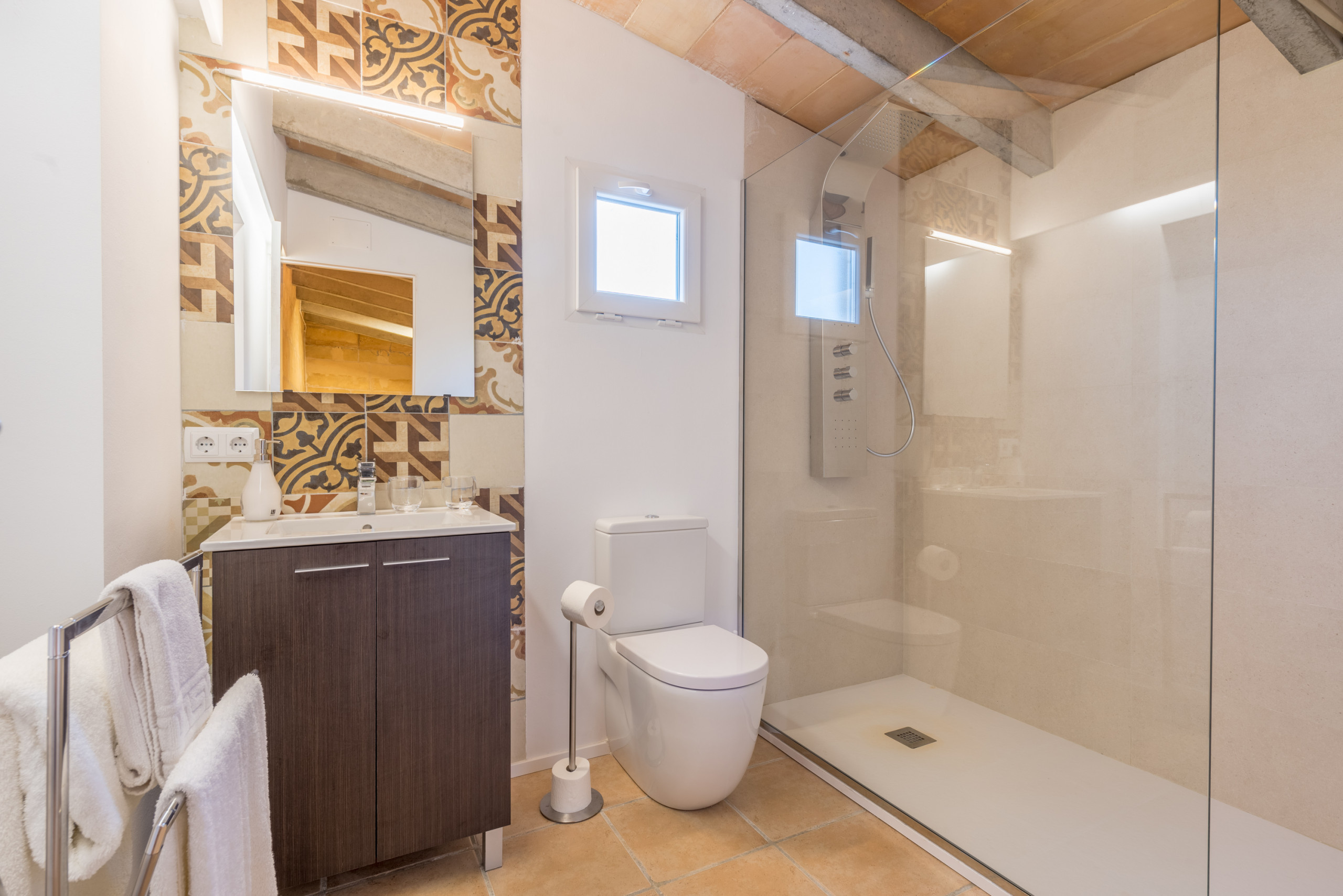 En el interior, la casa combina un diseño moderno en el salón de la planta baja, con una pantalla plana en la pared, con cinco habitaciones dobles de estilo mallorquín. Tres de las habitaciones se encuentran en la primera planta, mientras que en la planta baja hay una habitación triple. El alojamiento ofrece tres elegantes cuartos de baño, dos con ducha y uno con bañera.