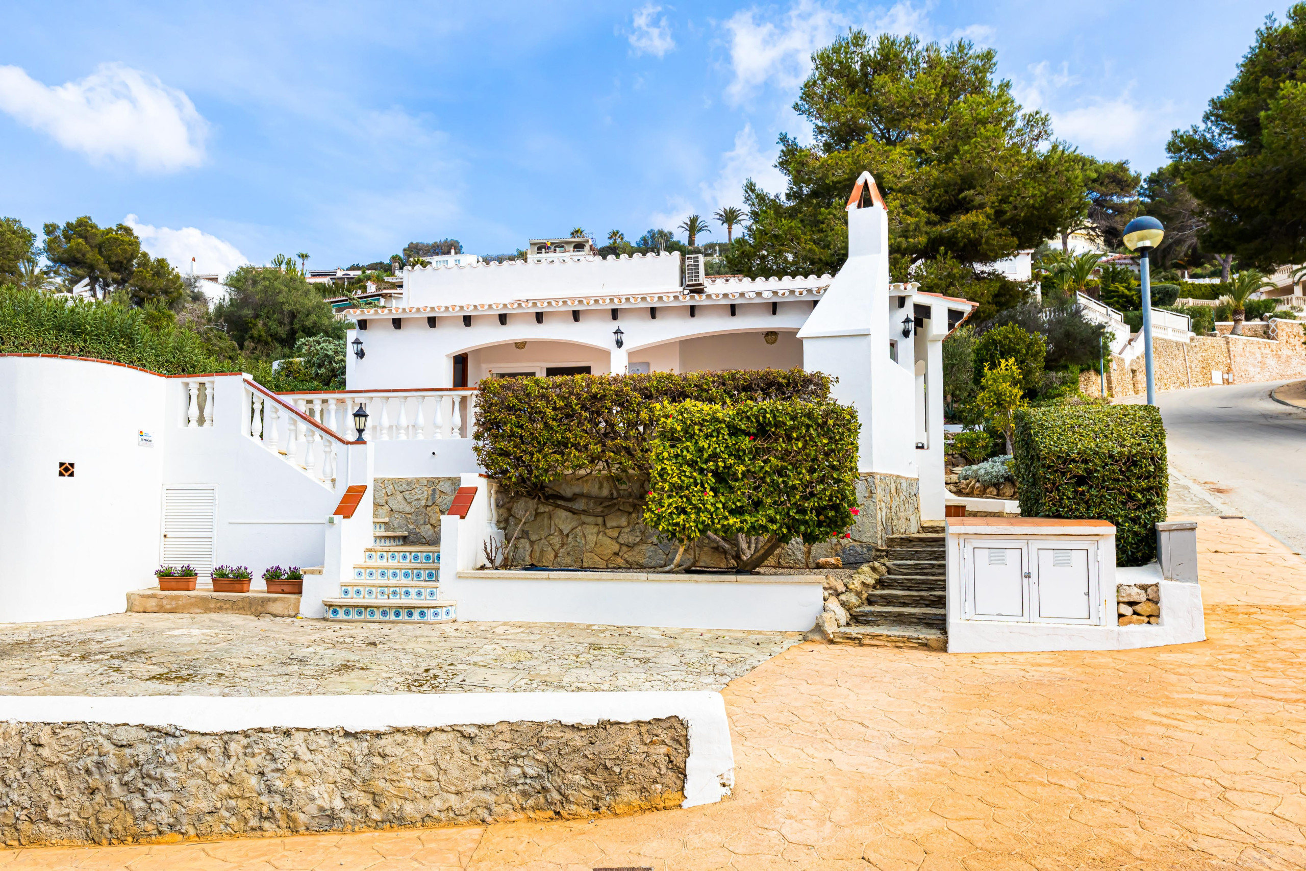 La villa ofrece vistas al mar y se encuentra en una zona tranquila y familiar, ideal para unas vacaciones memorables en Menorca.