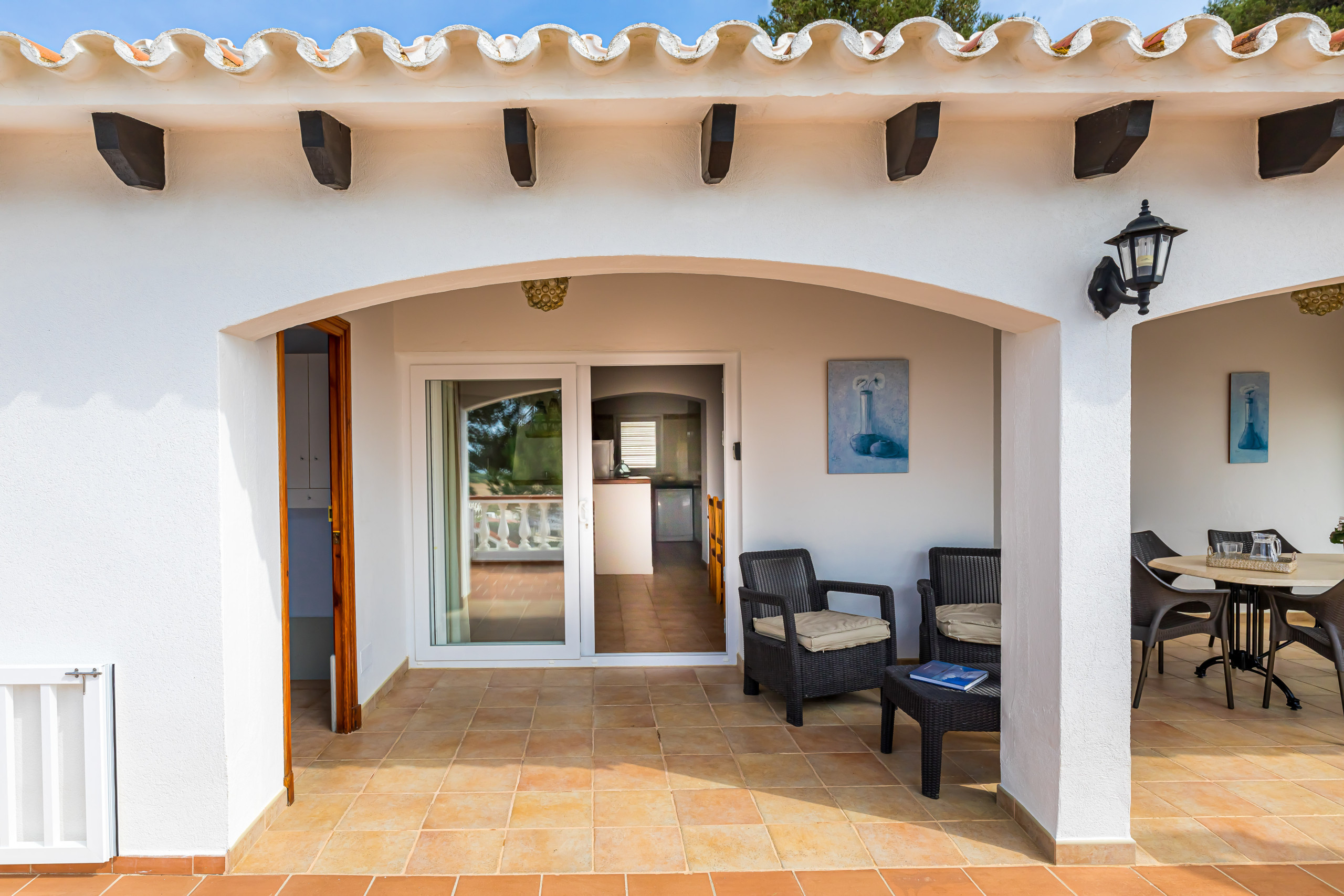 El exterior de la villa es un verdadero punto fuerte, con jardín privado, muebles de jardín, barbacoa, terraza y parcela vallada. La ubicación es privilegiada, a solo 1500 metros de la playa de arena de Son Bou y con vistas al mar.