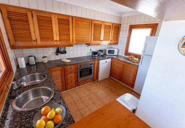 La cocina americana está completamente equipada con electrodomésticos modernos como lavadora, lavavajillas, horno, microondas, cafetera, tostadora y hervidor de agua. Además, dispone de conexión WiFi y televisión con canales en español, inglés y alemán.
