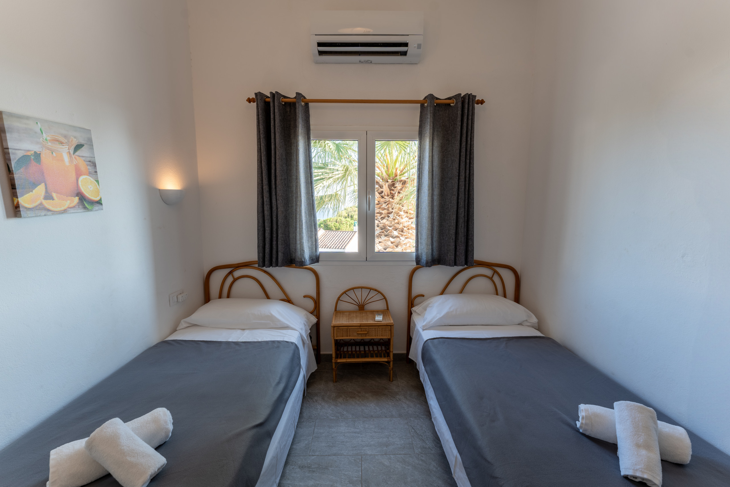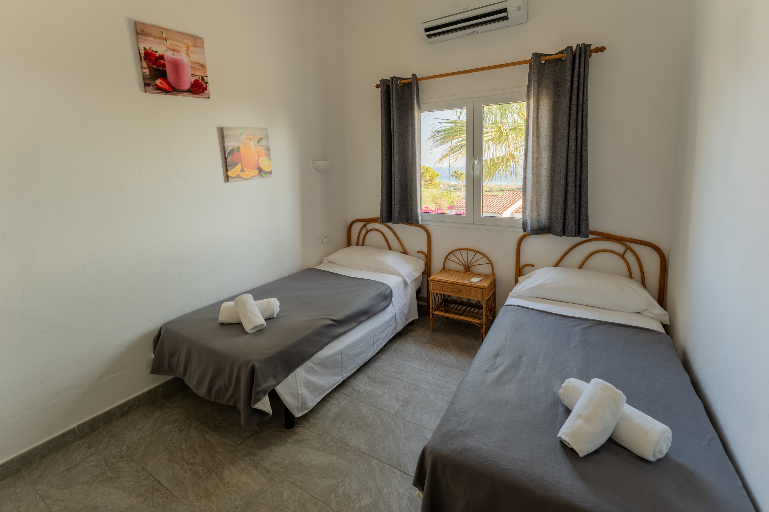 La villa dispone de 5 dormitorios con 7 camas (1 cama doble y 6 individuales), lo que permite una distribución cómoda para grupos familiares. Cada habitación está equipada con aire acondicionado para garantizar el máximo confort durante los días más calurosos.