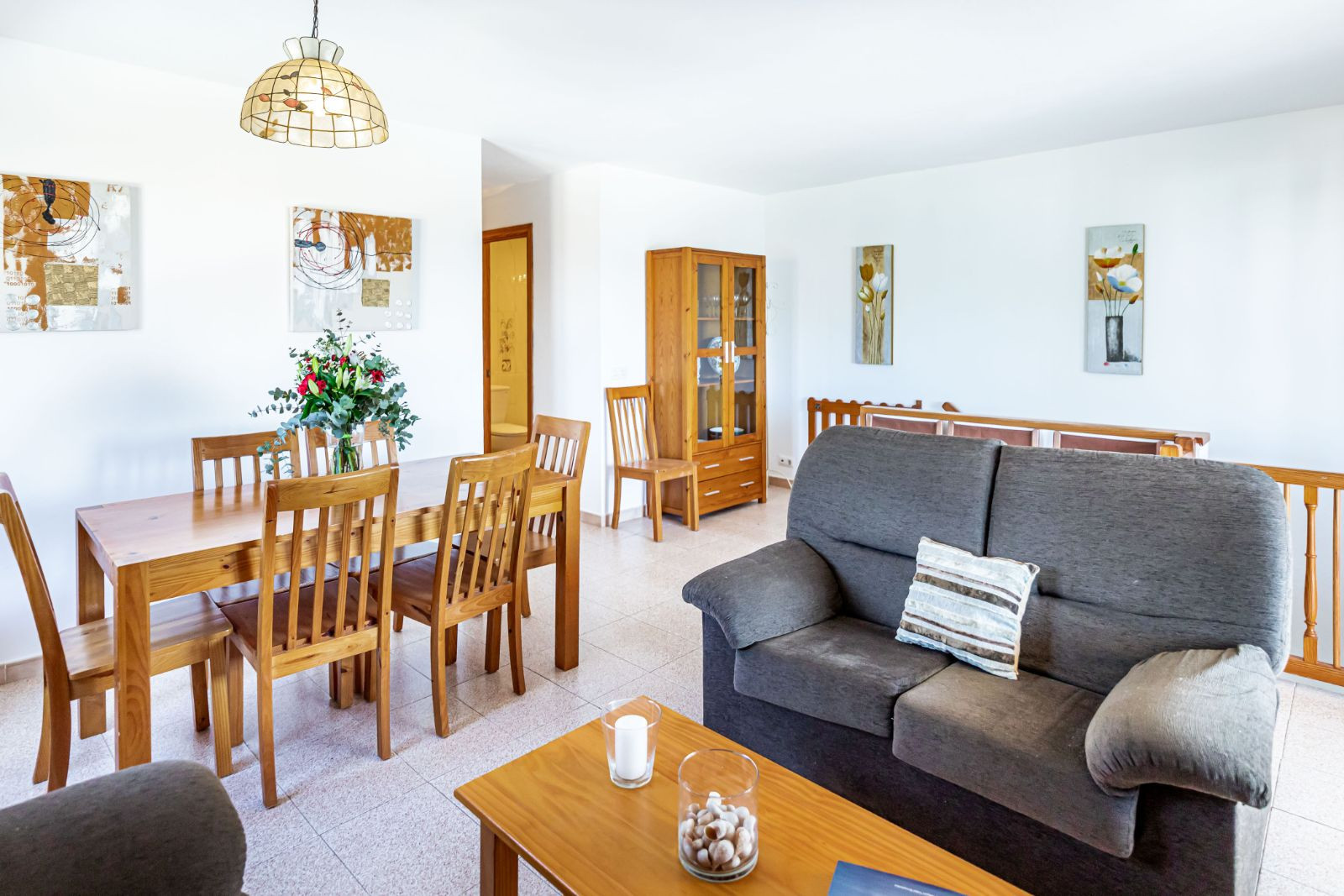 1. En el nivel principal está el salón, comedor y cocina. Desde aquí, 6 escalones arriba hasta la habitación doble y la habitación doble con baño separado (ducha encima de la bañera) compartido entre las dos habitaciones.