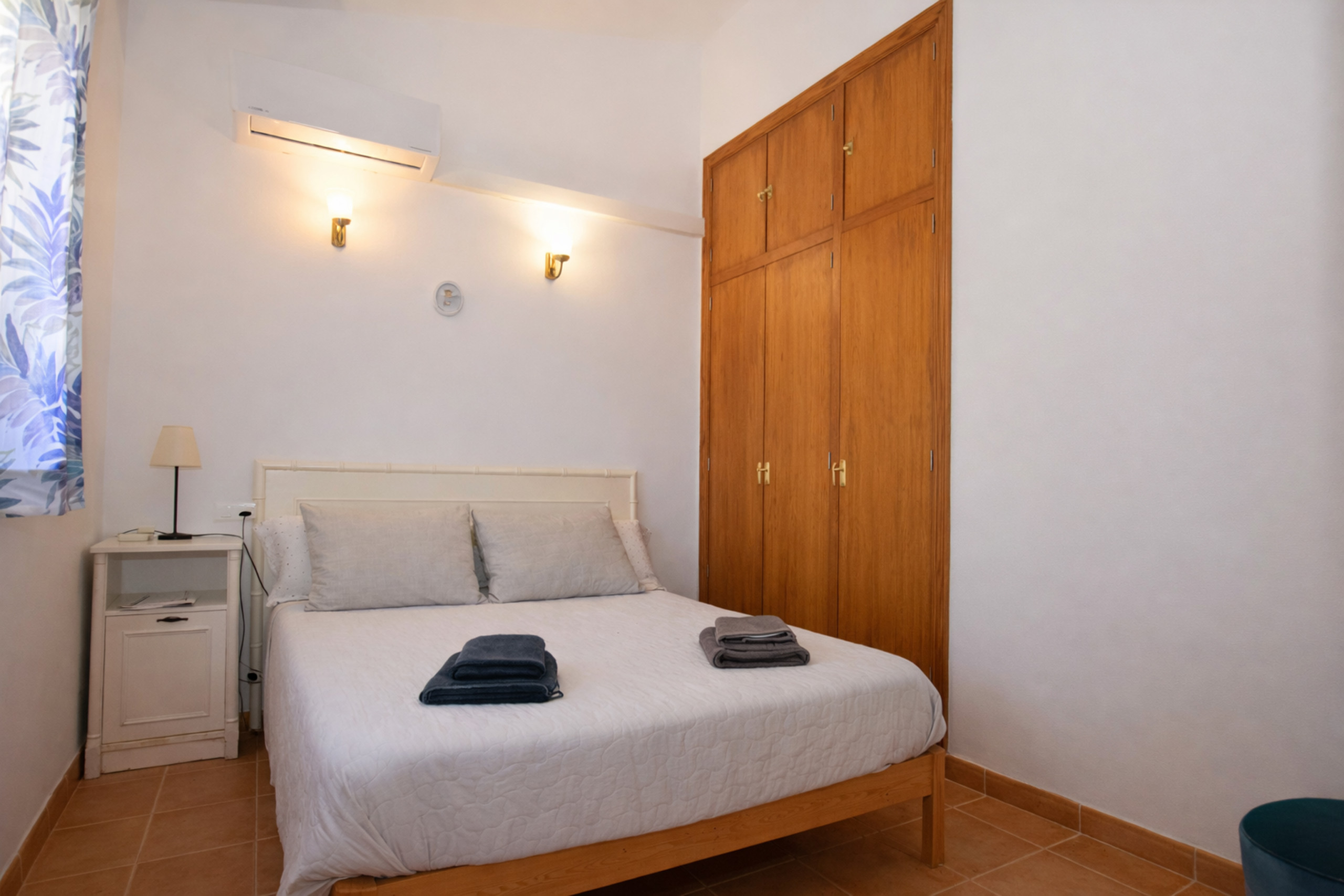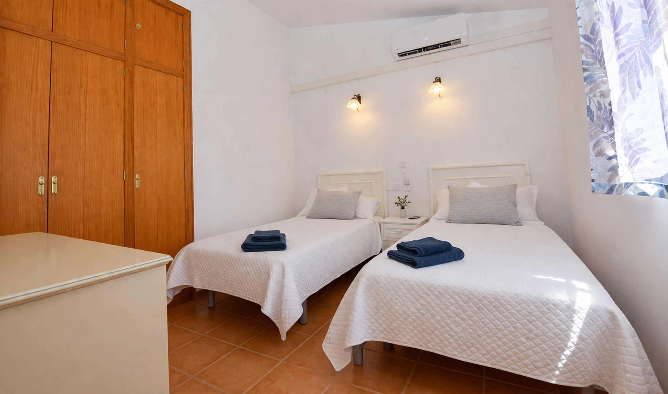 Il y a quatre chambres, toutes avec deux lits simples, et deux salles de bain, à l'étage supérieur trois et une salle de bain ; La quatrième chambre et la deuxième salle de bain sont au rez-de-chaussée.